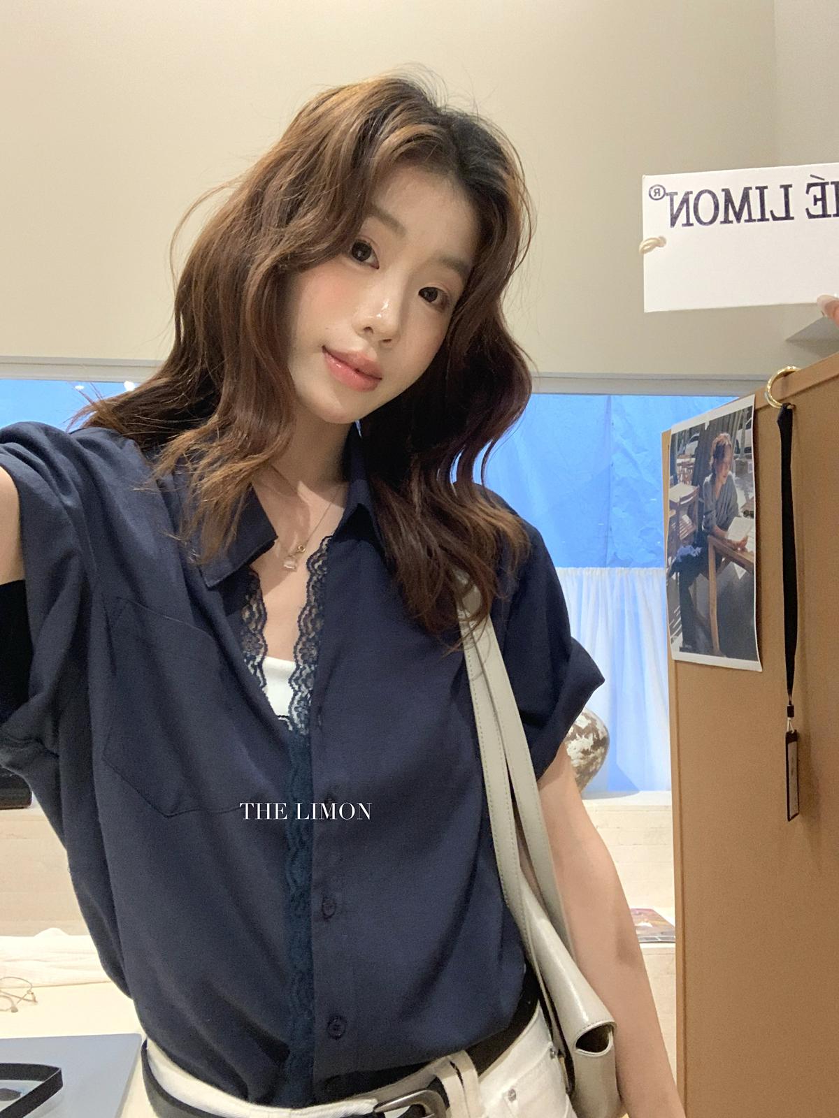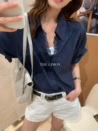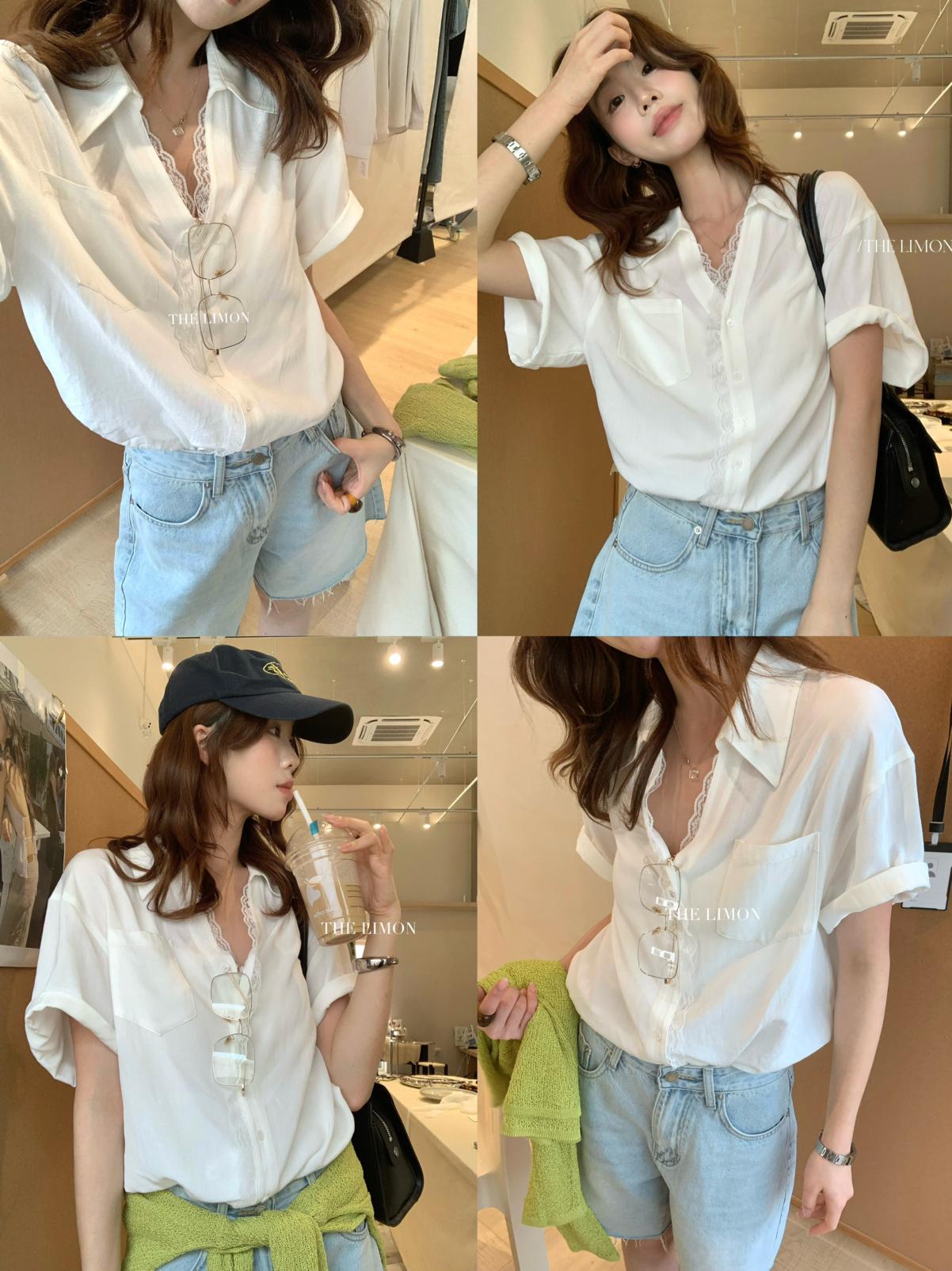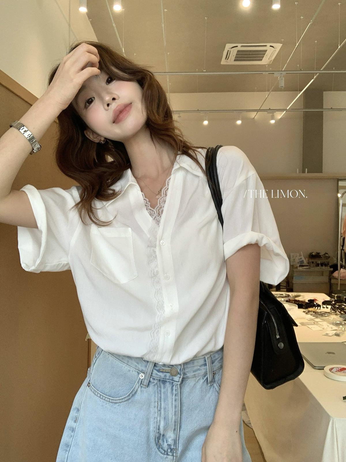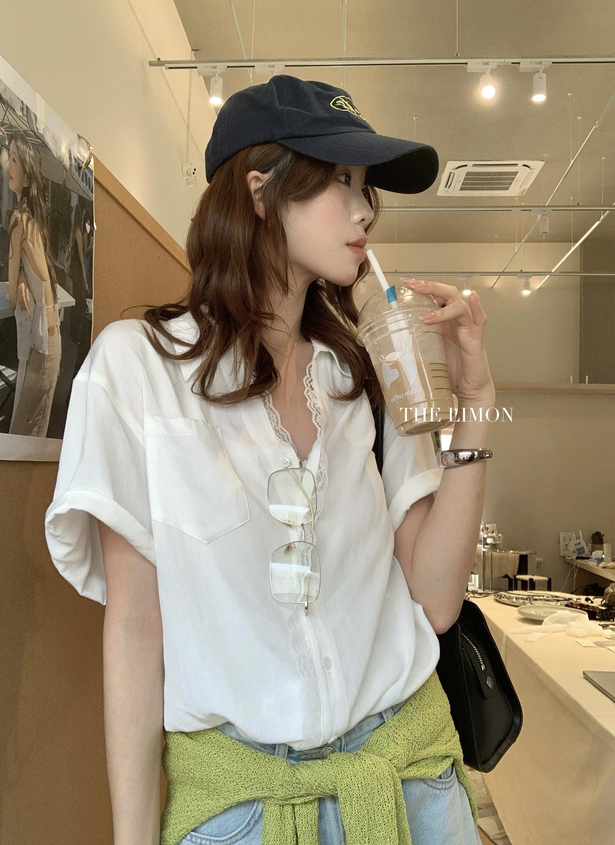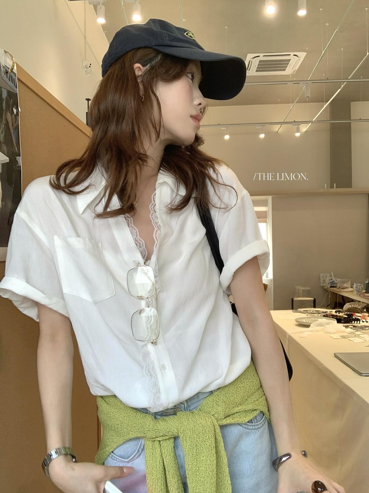 【C9079】老錢風蕾絲拼接鬆弛感寬鬆顯瘦V領短袖襯衫(不含墨鏡)