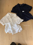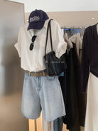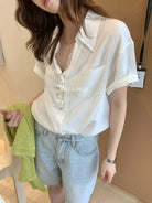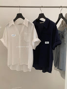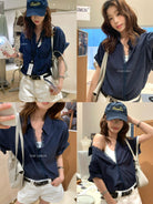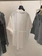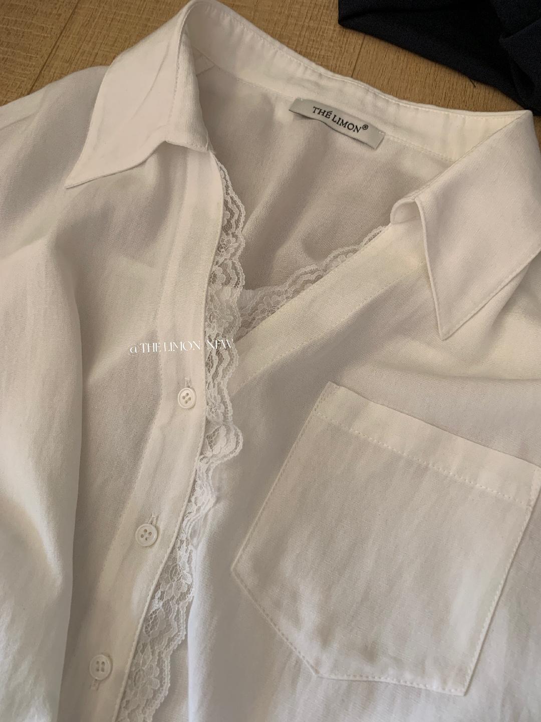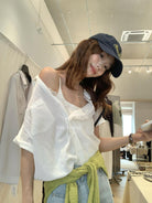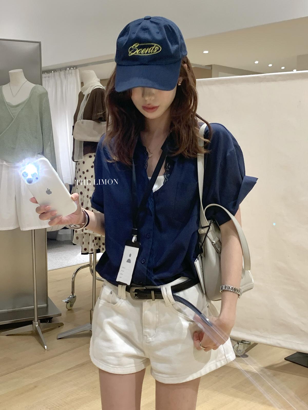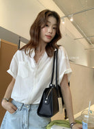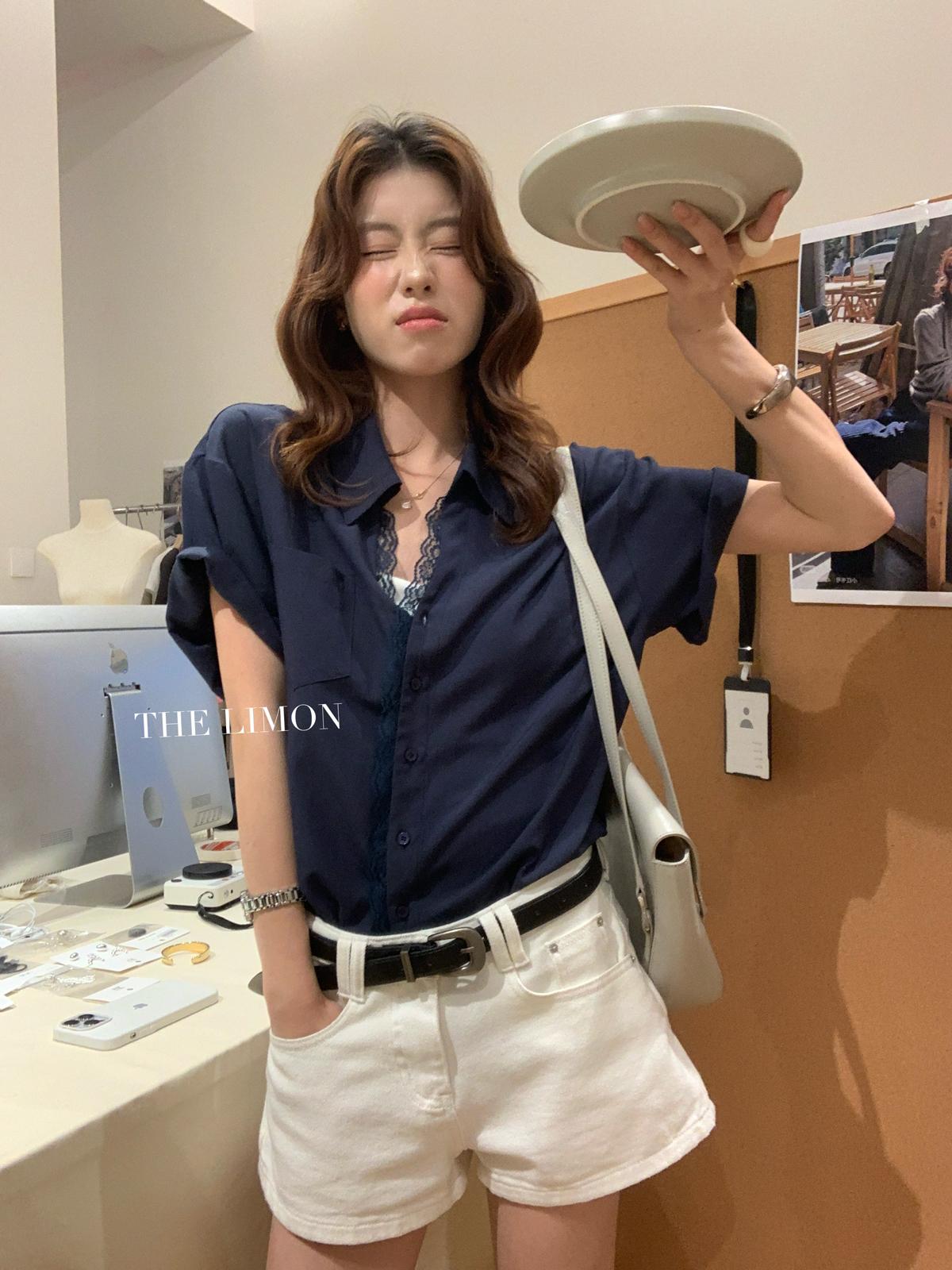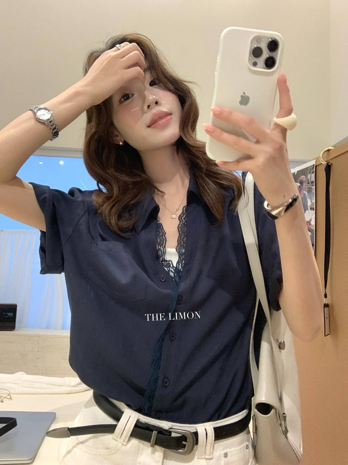【C9079】老錢風蕾絲拼接鬆弛感寬鬆顯瘦V領短袖襯衫(不含墨鏡)