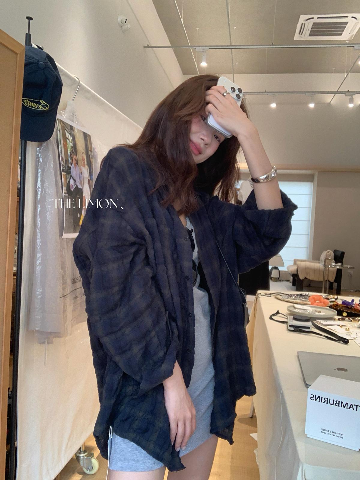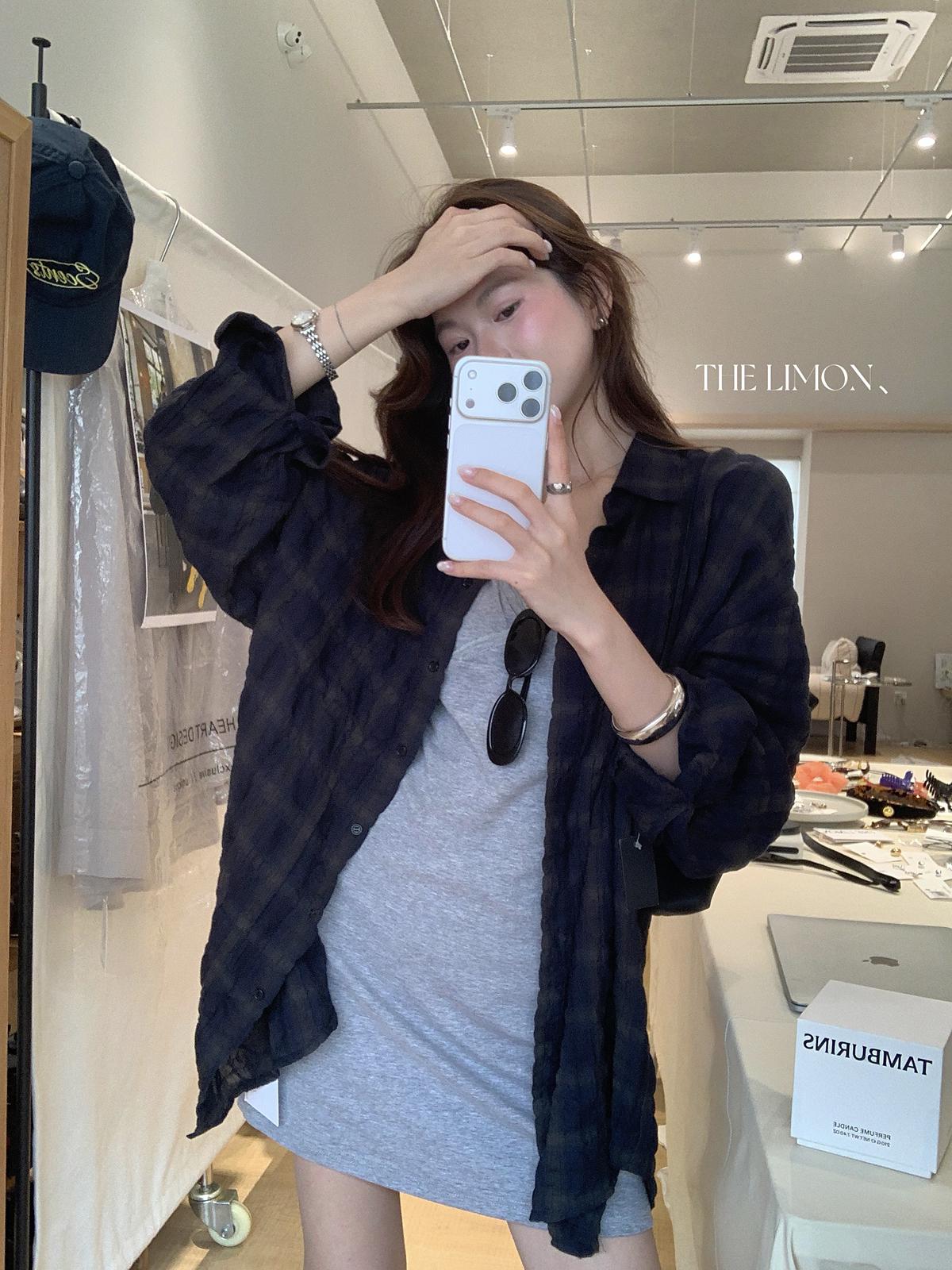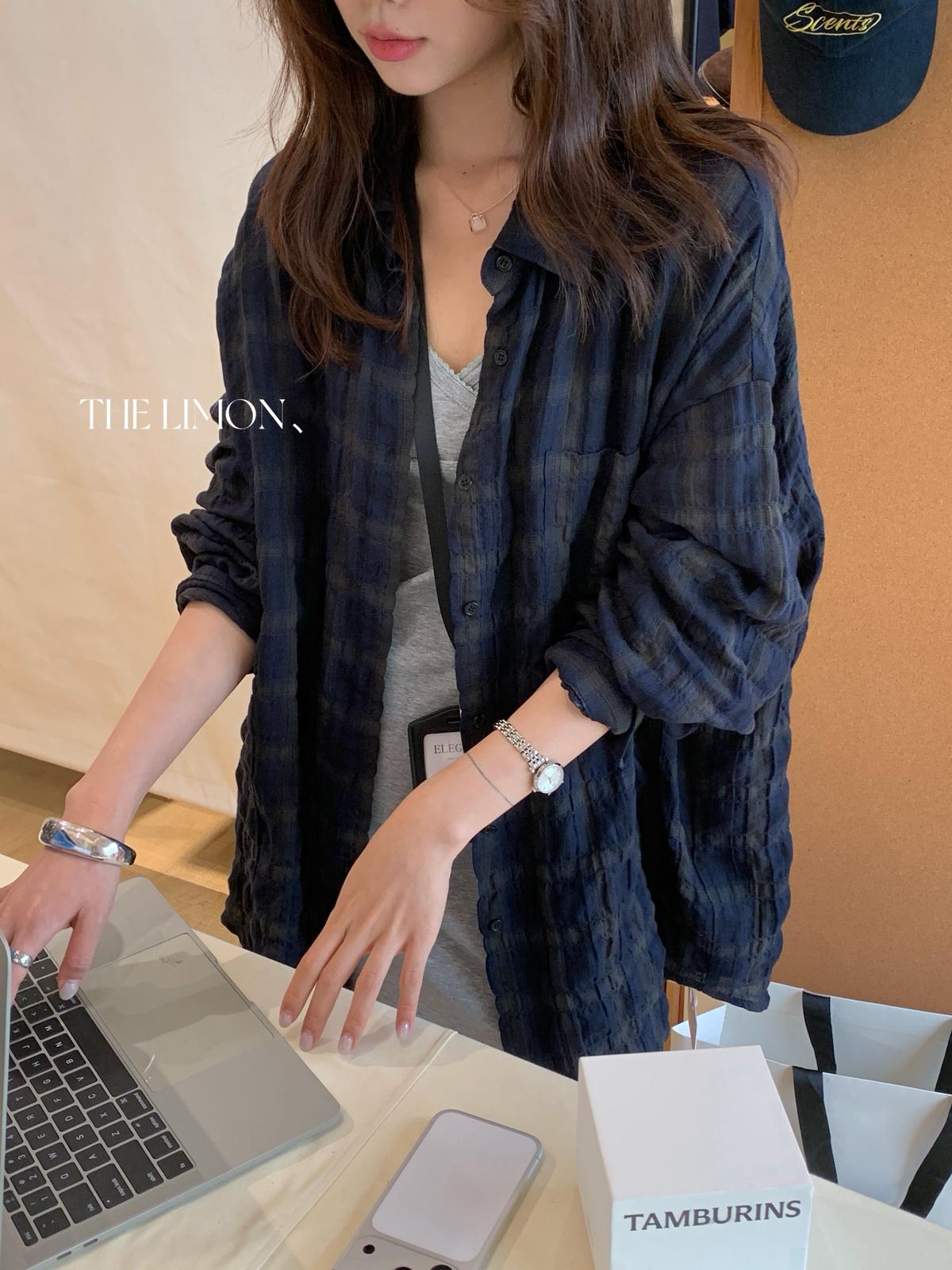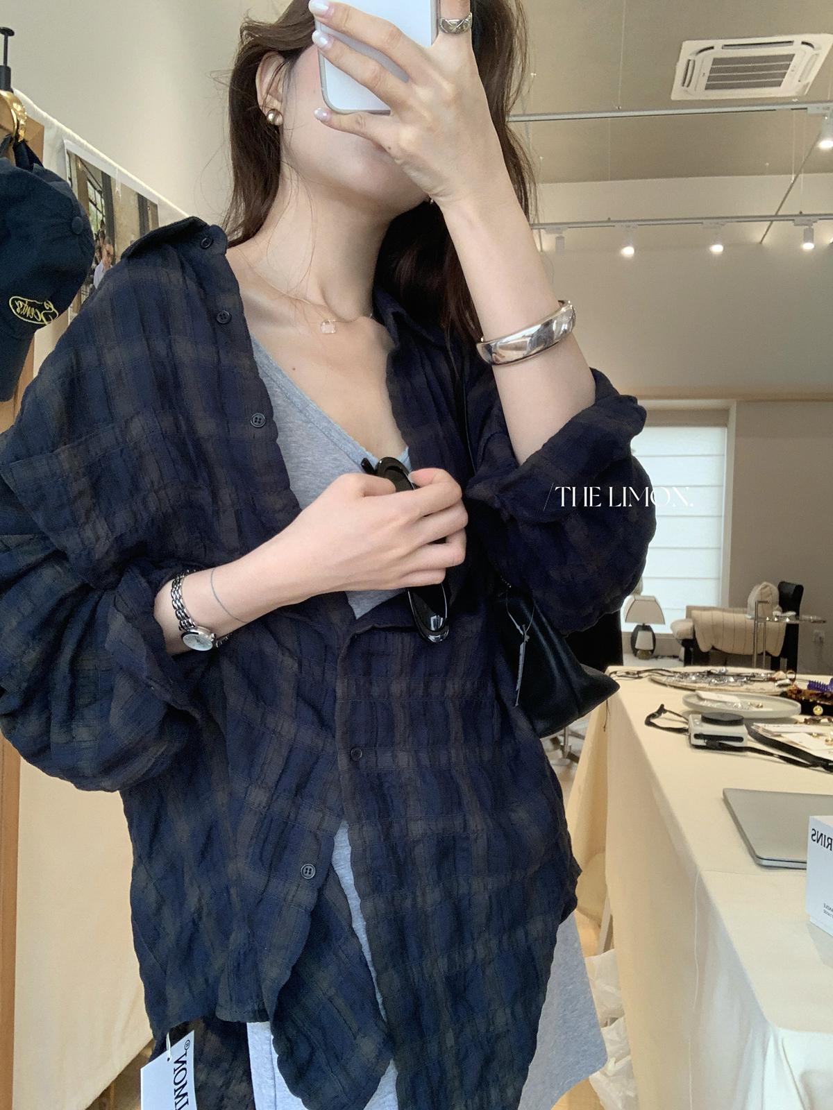 【C9081】單穿疊穿都可!輕薄皺皺格紋防曬襯衫(單賣襯衫)