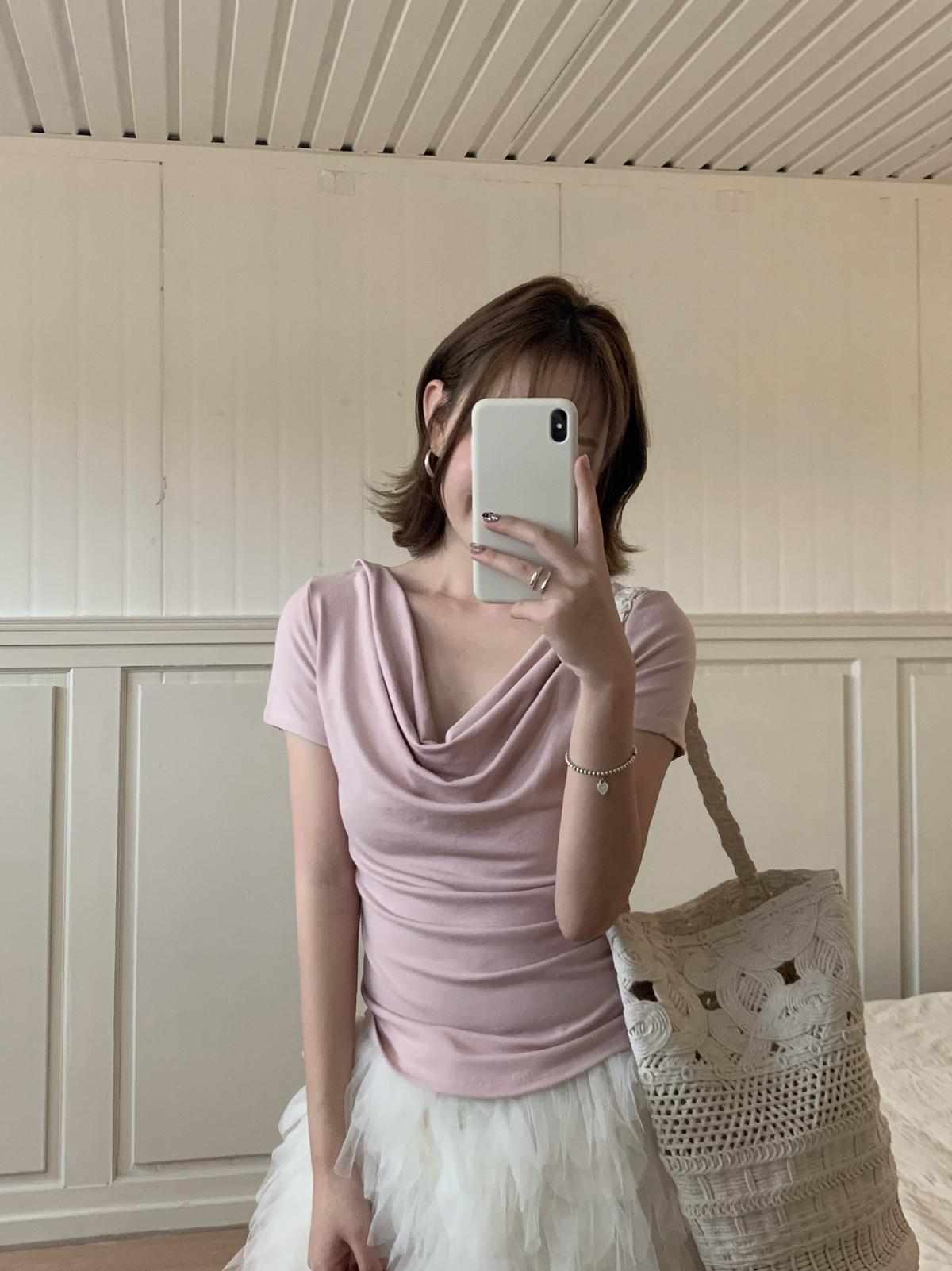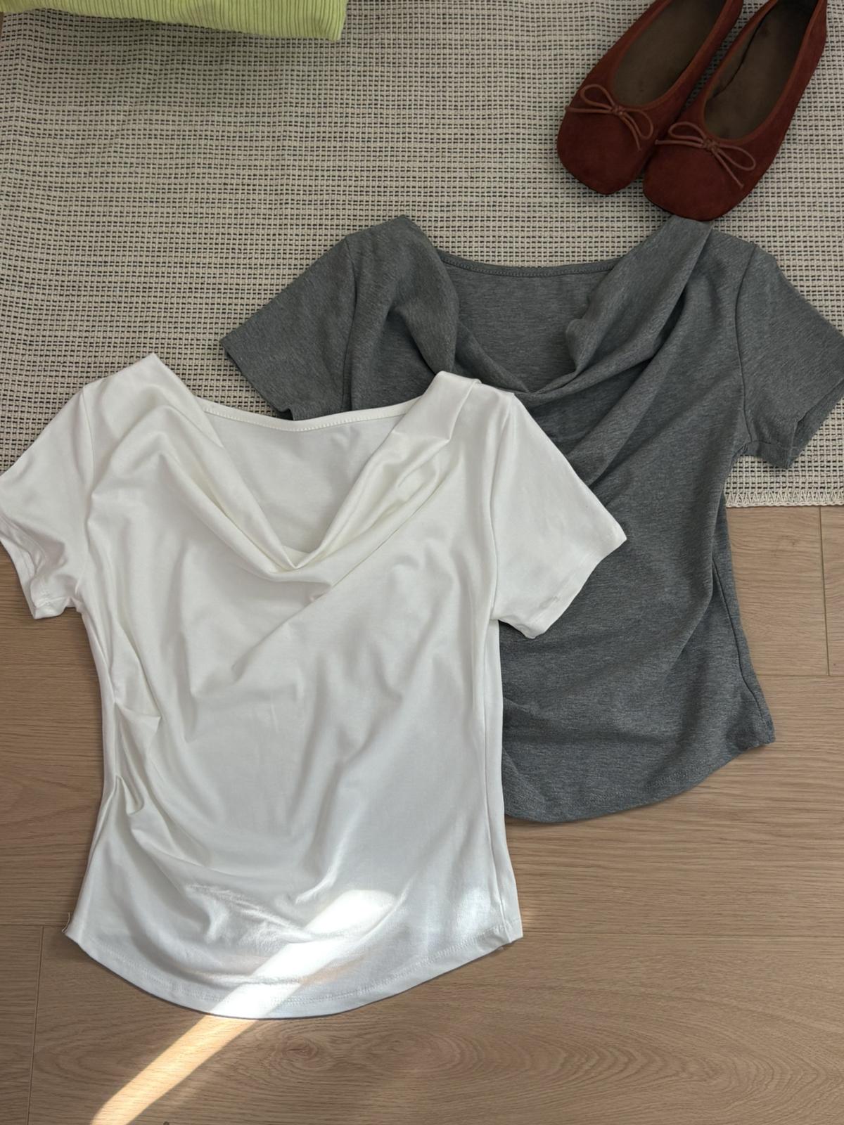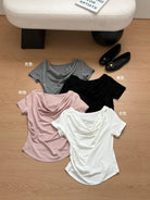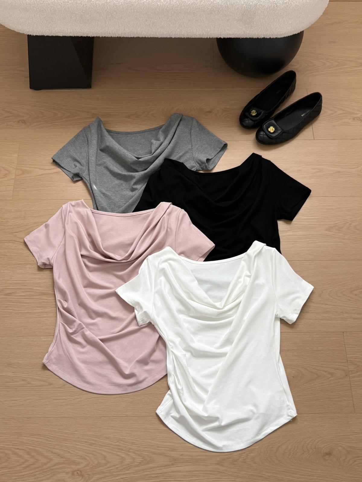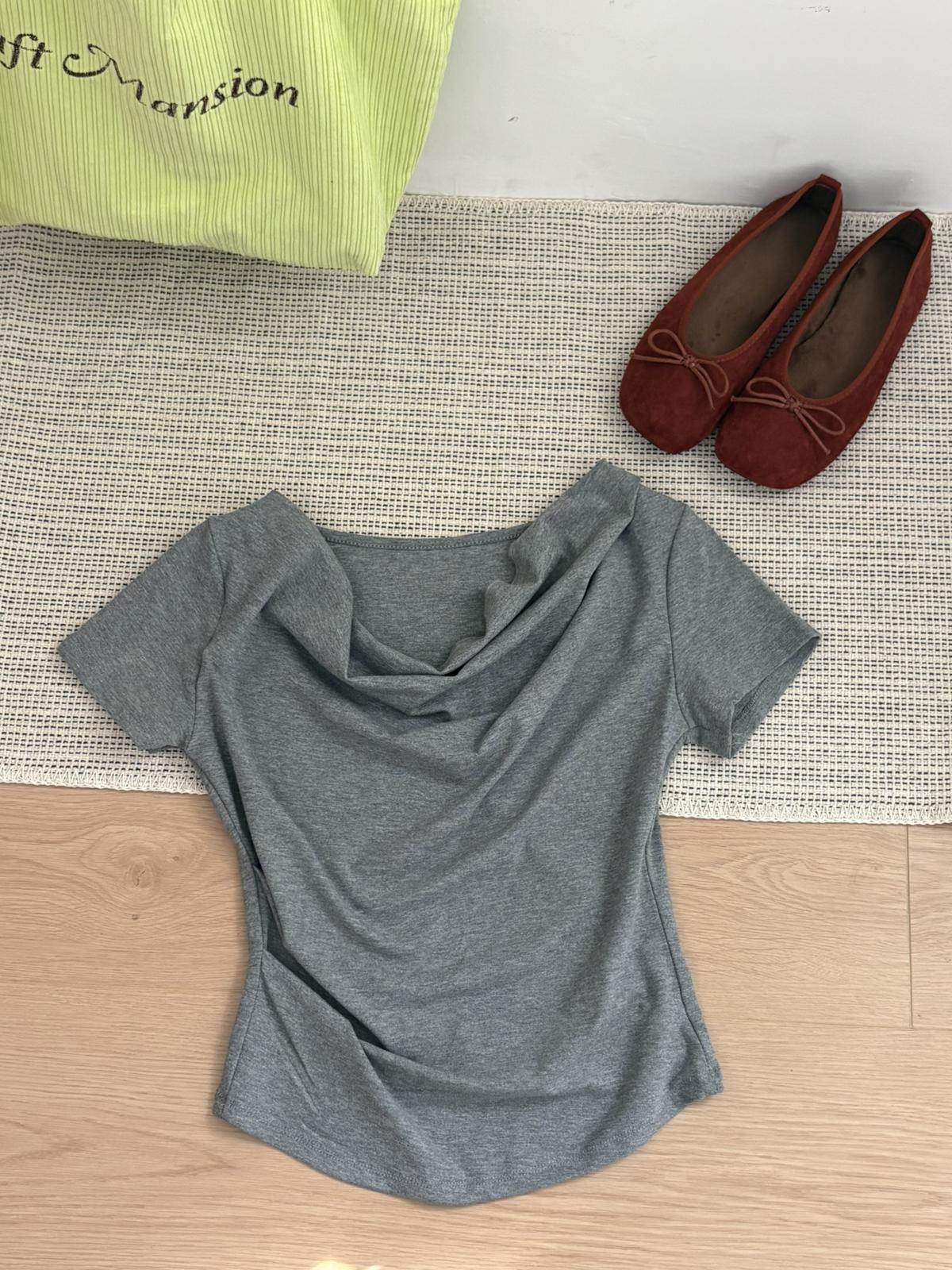 【C9094】“溫柔祕籍”蕩領短袖t恤女設計感收腰修身短款氣質斜肩上衣短袖T恤