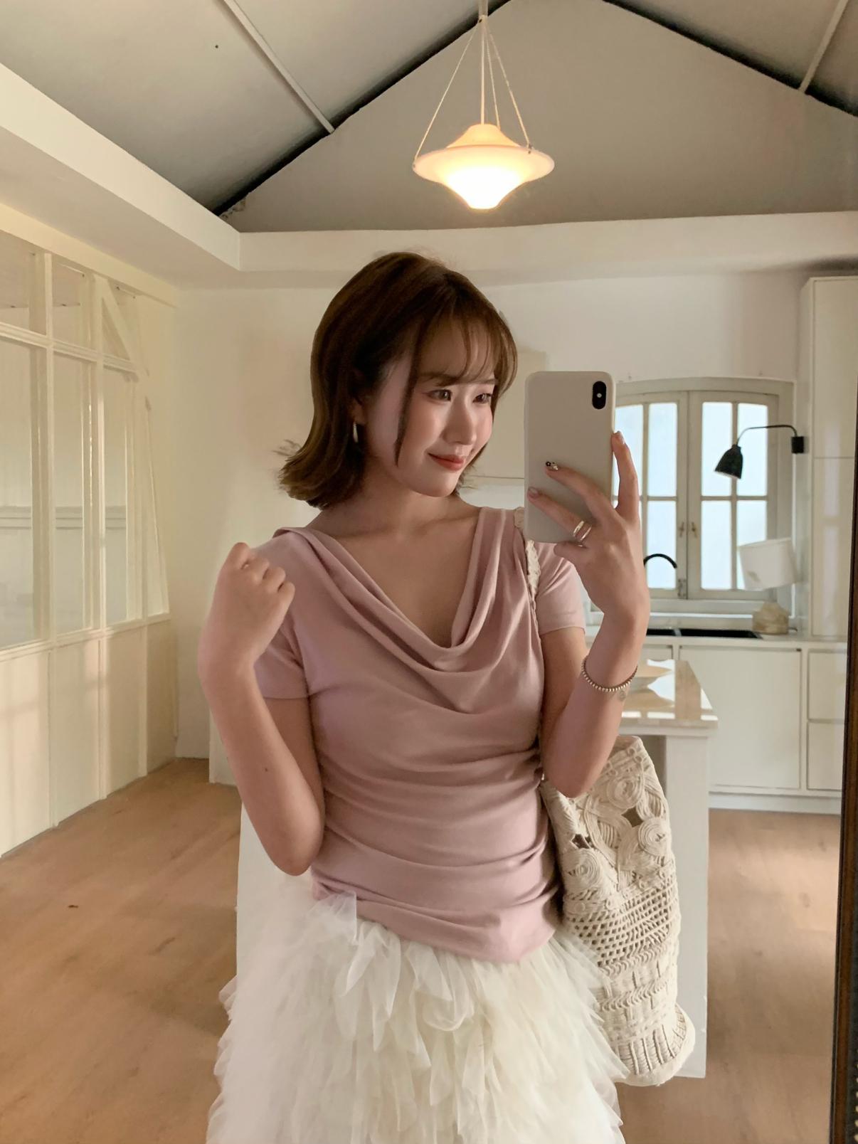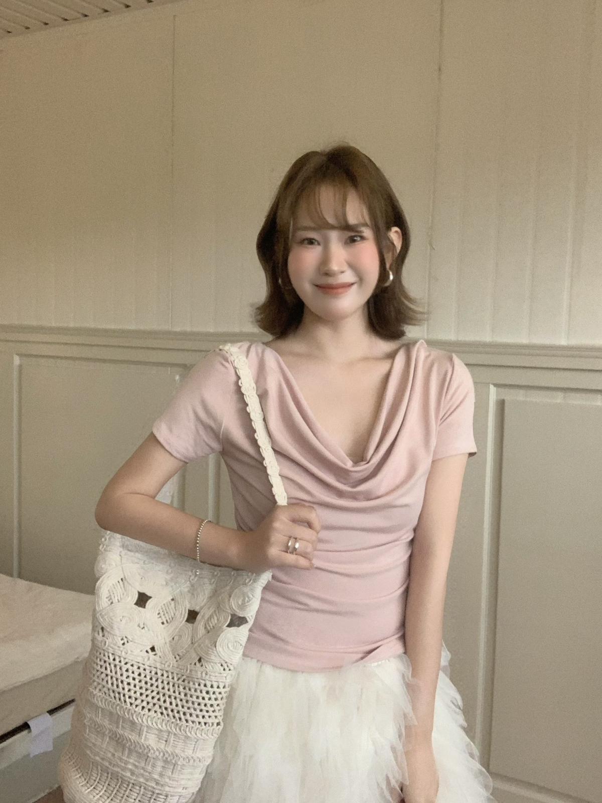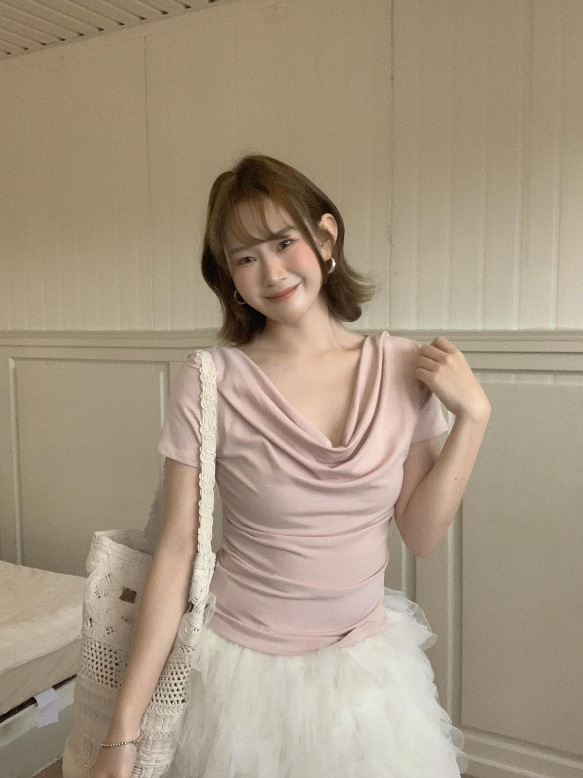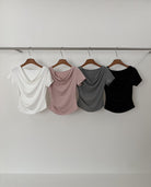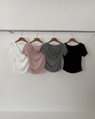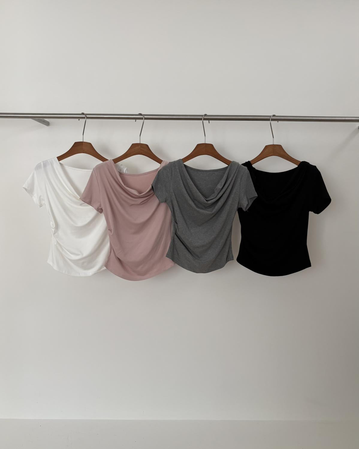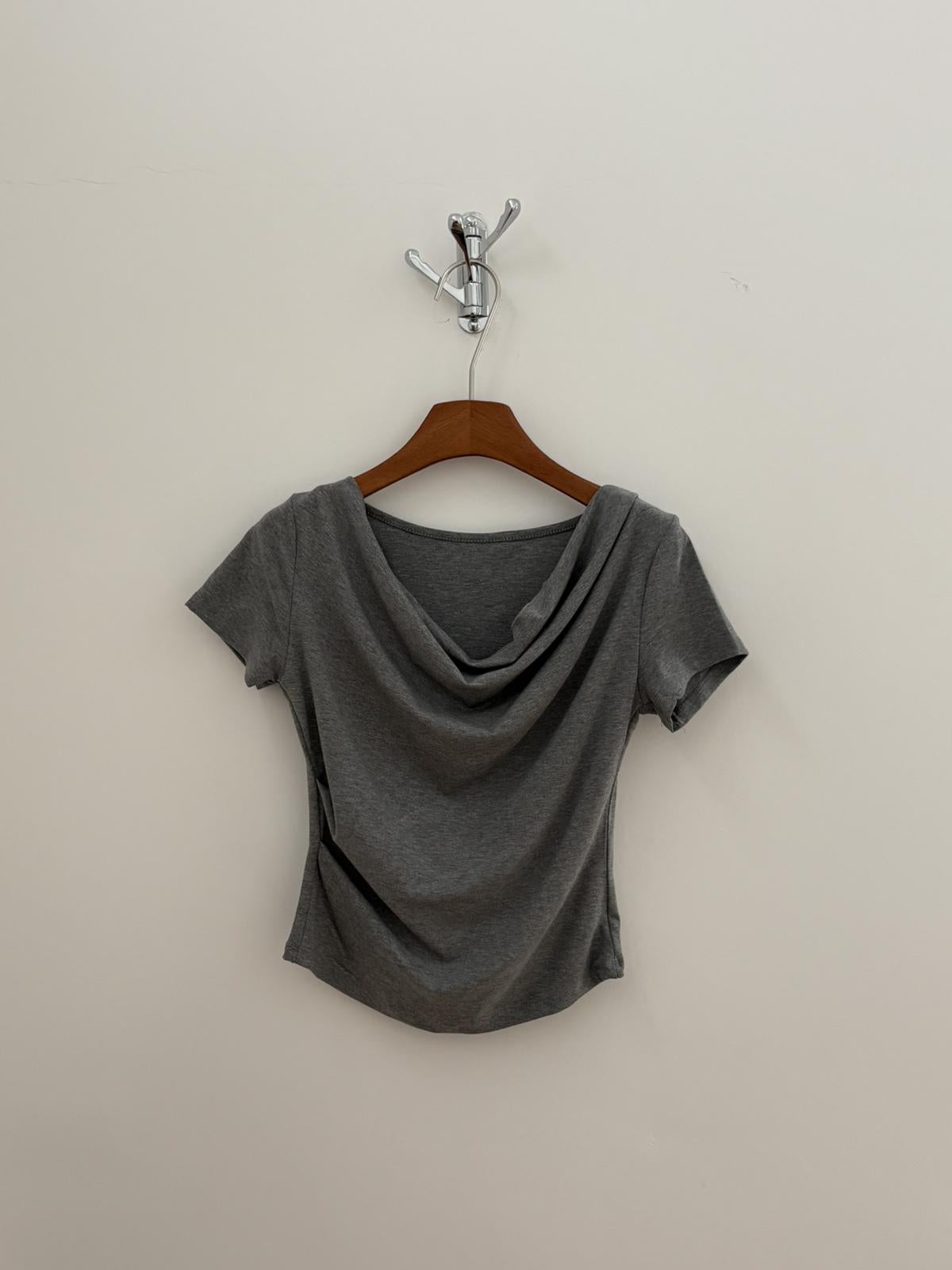 【C9094】“溫柔祕籍”蕩領短袖t恤女設計感收腰修身短款氣質斜肩上衣短袖T恤