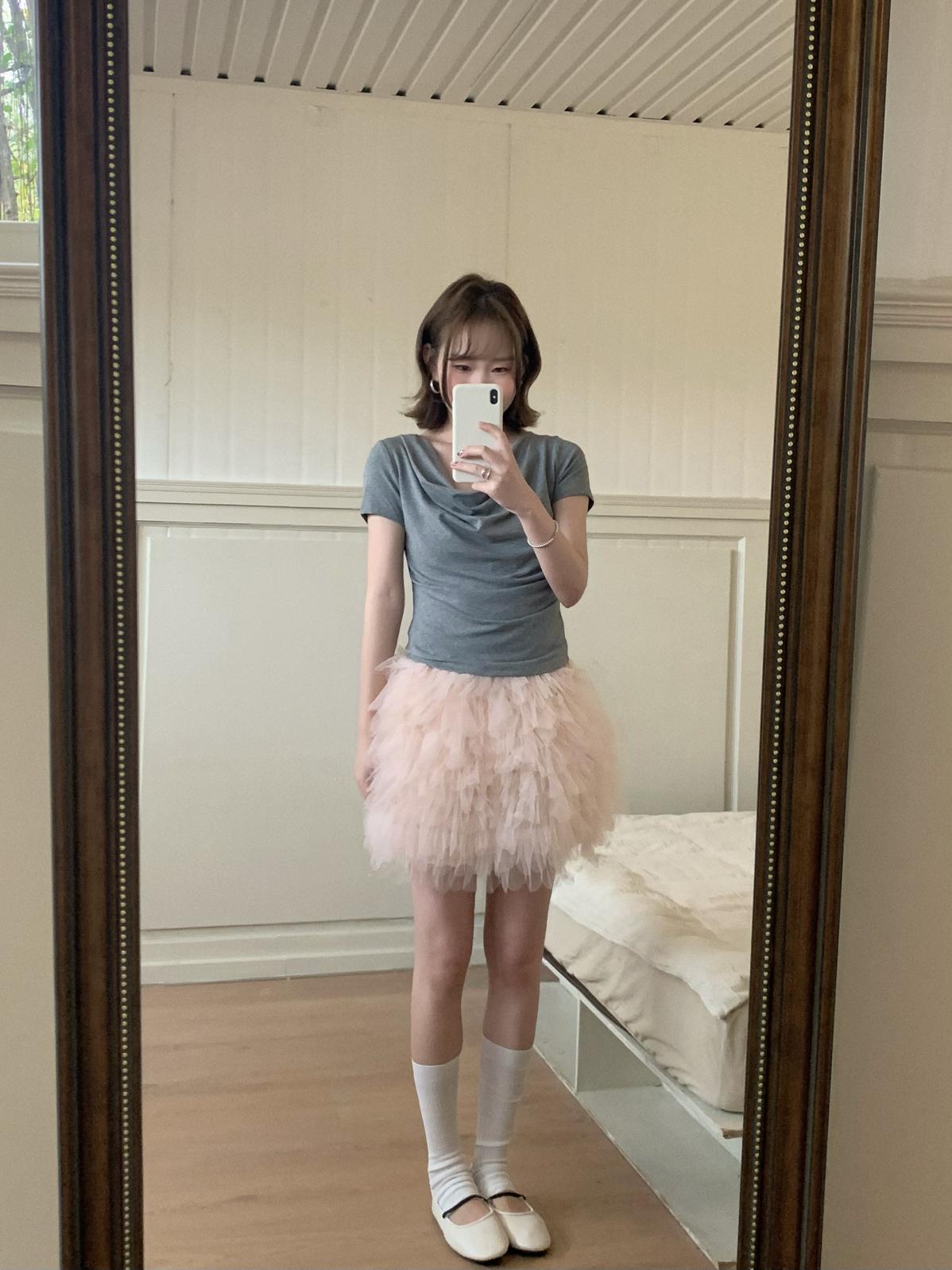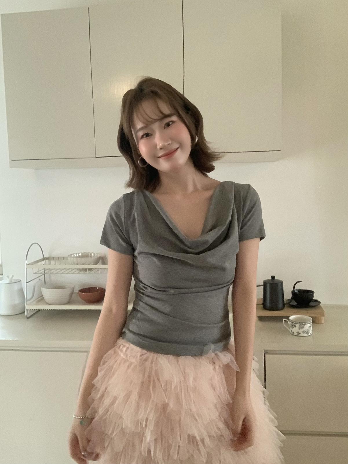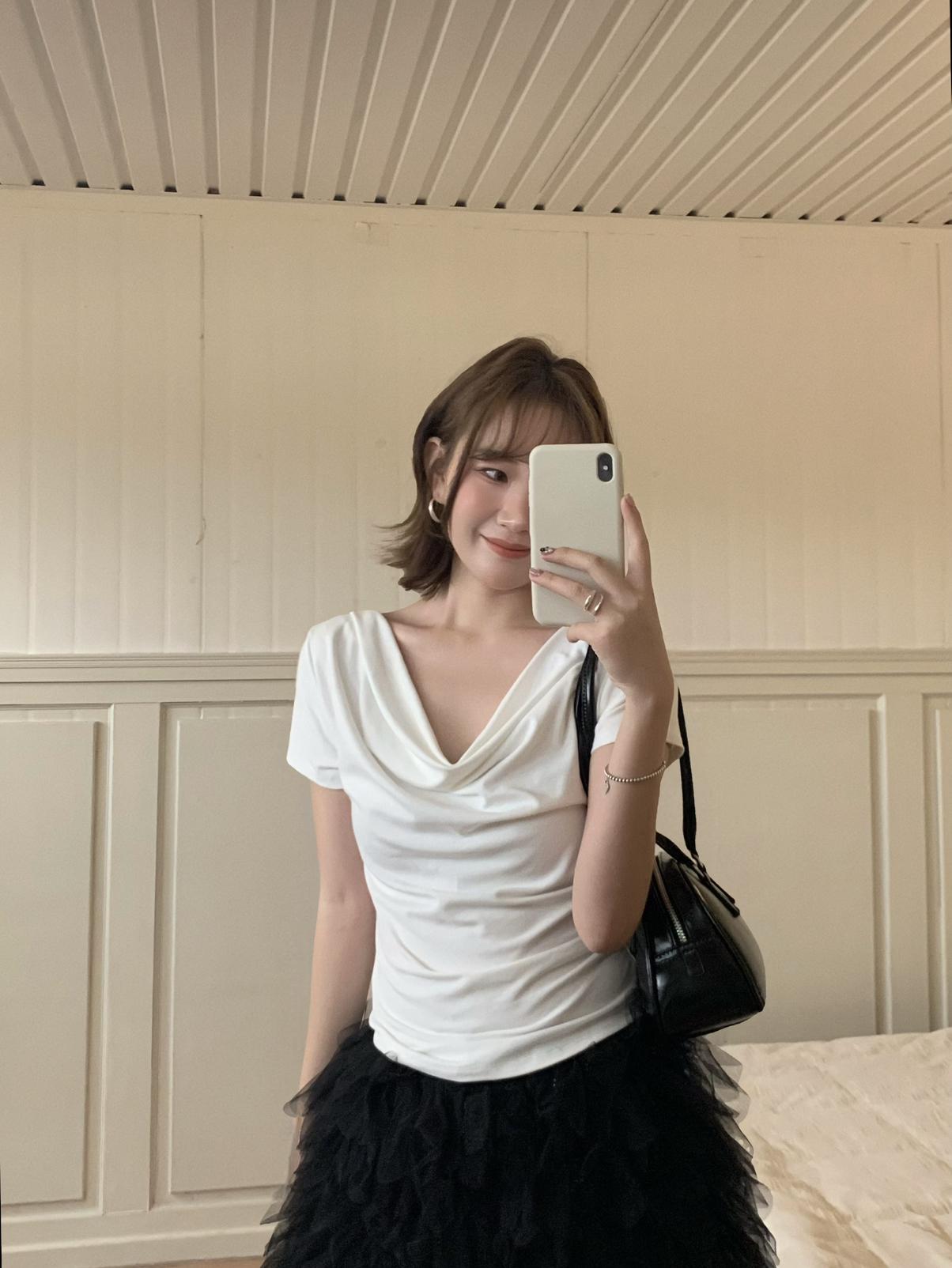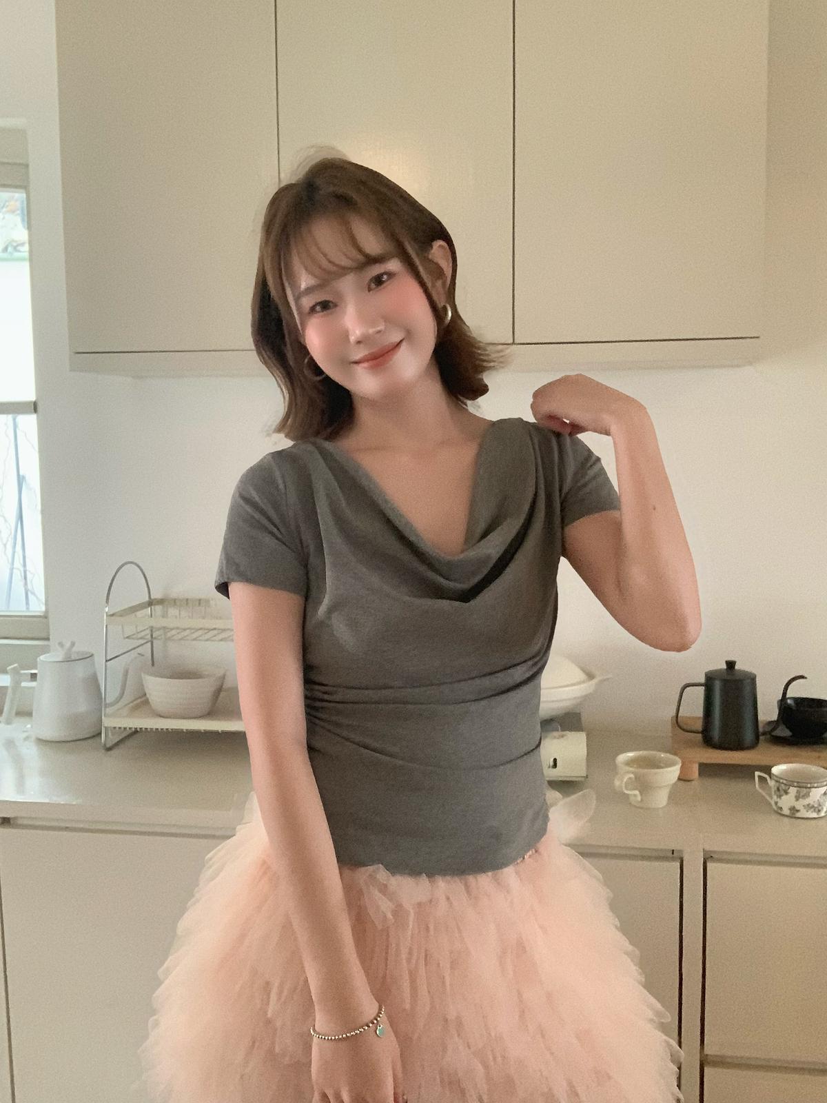 【C9094】“溫柔祕籍”蕩領短袖t恤女設計感收腰修身短款氣質斜肩上衣短袖T恤