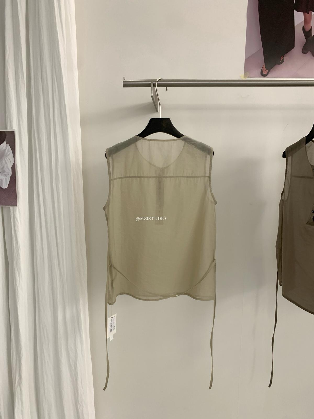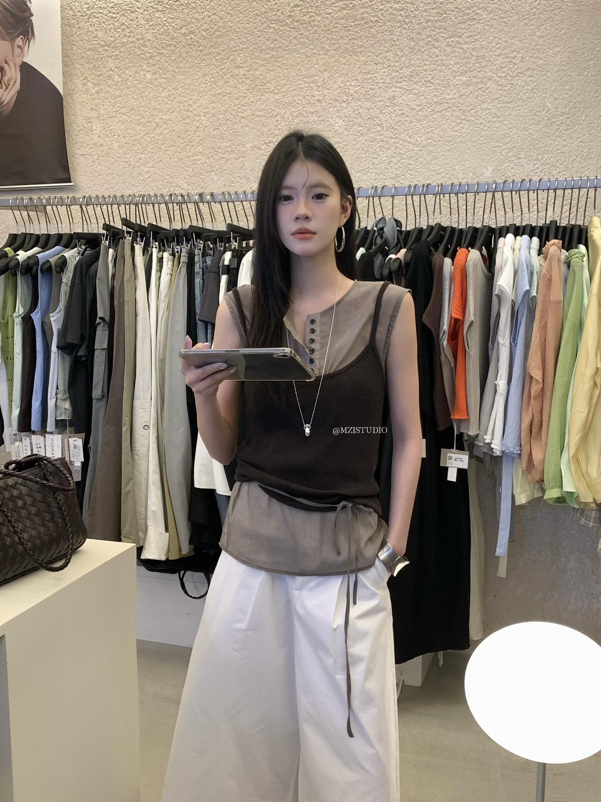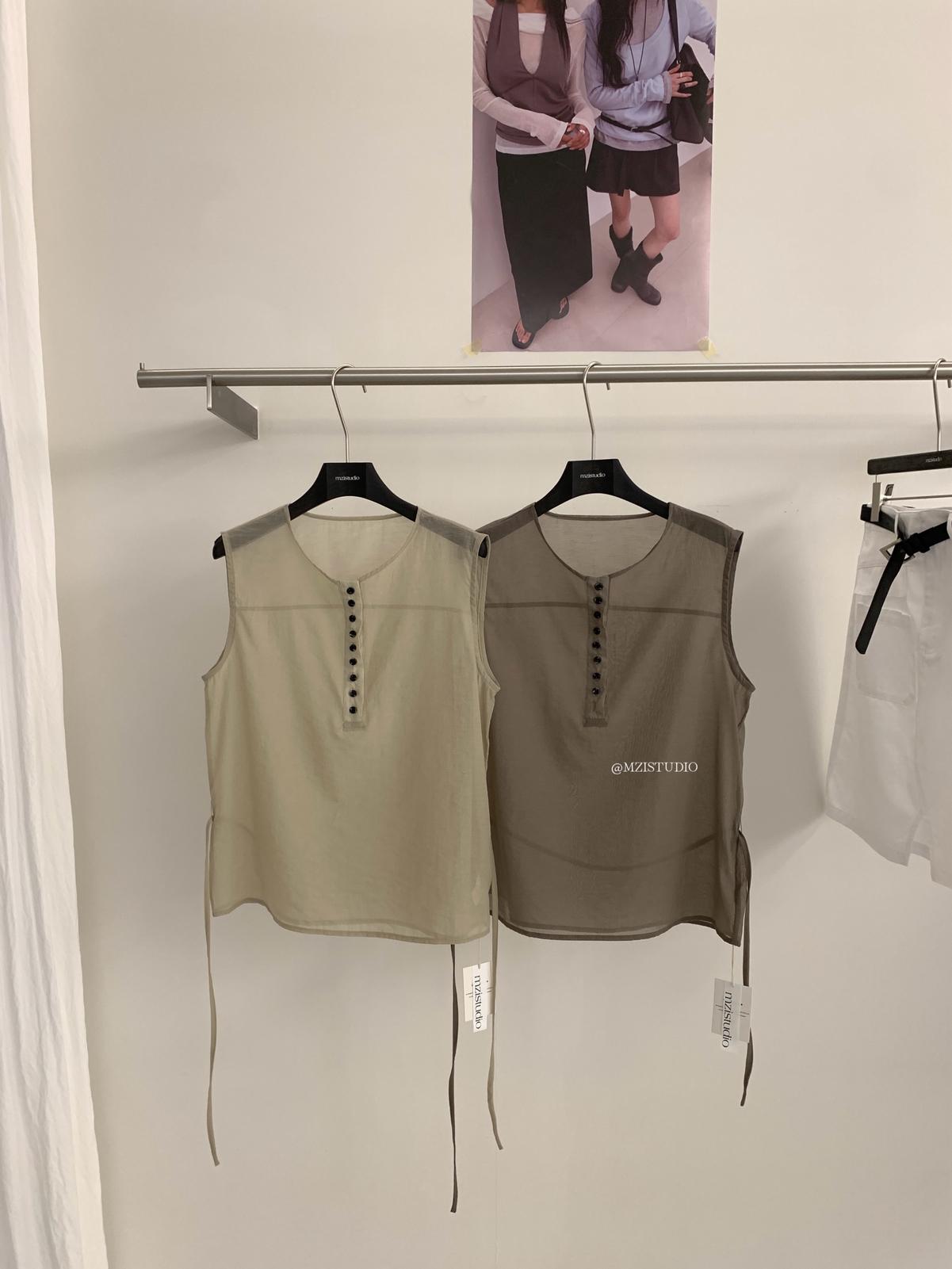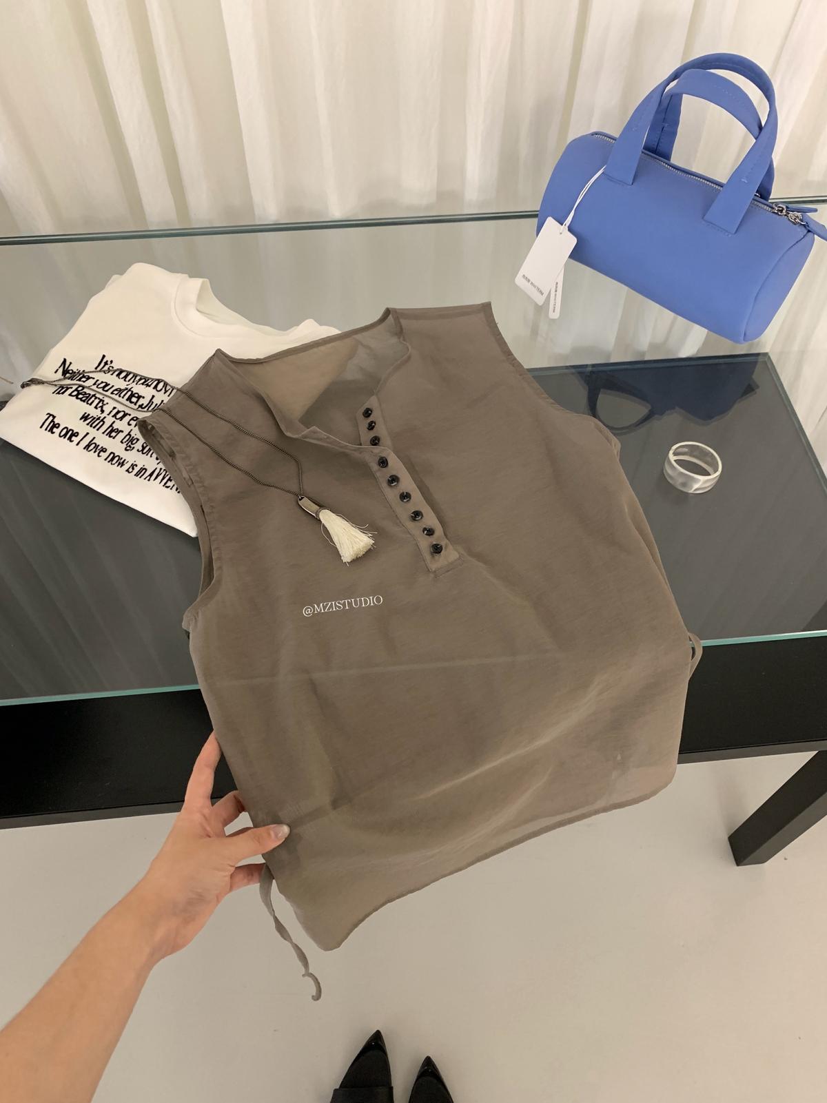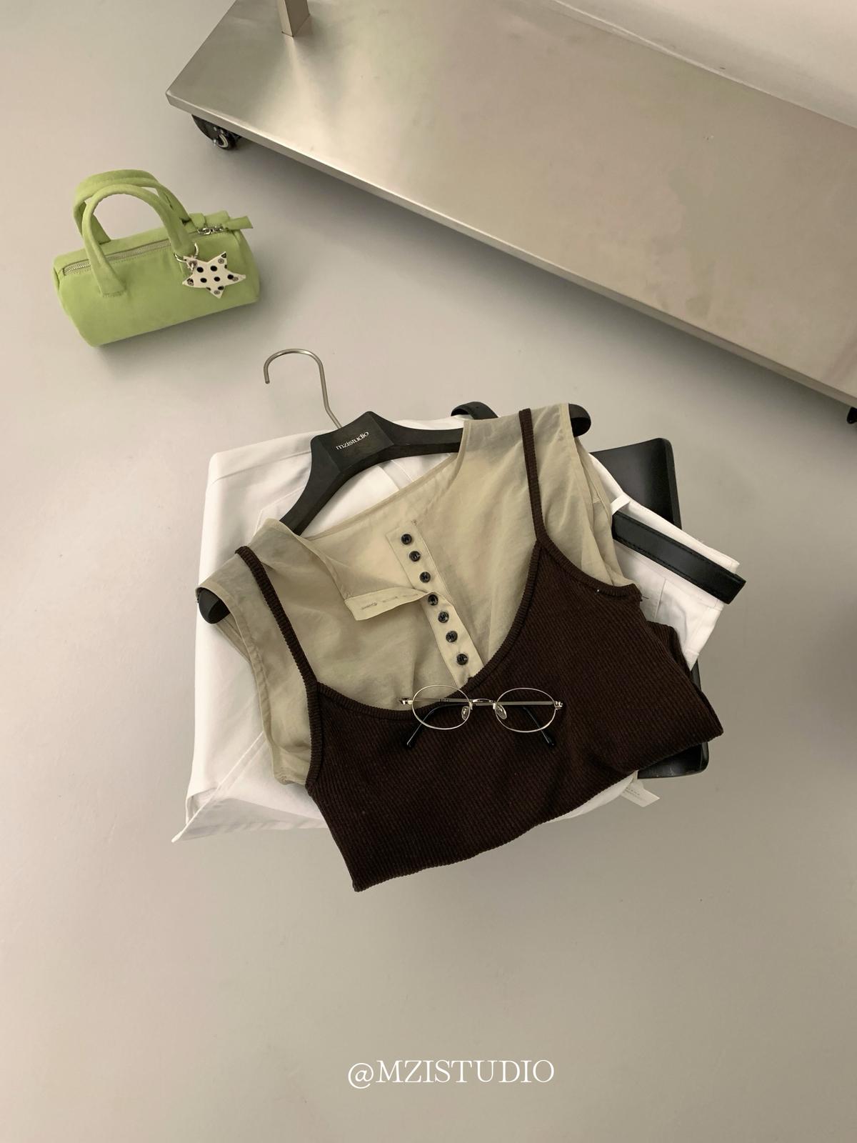 【C9129】濃度可可韓系清透簡約夏日鈕釦V領繫帶寬鬆無袖小衫(配腰繩)(不含項鍊/背心)