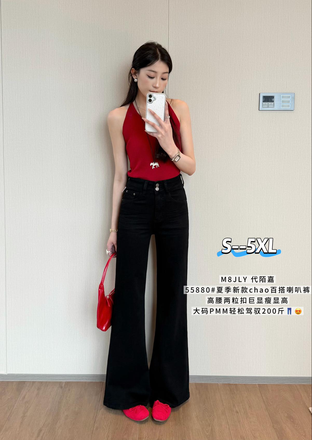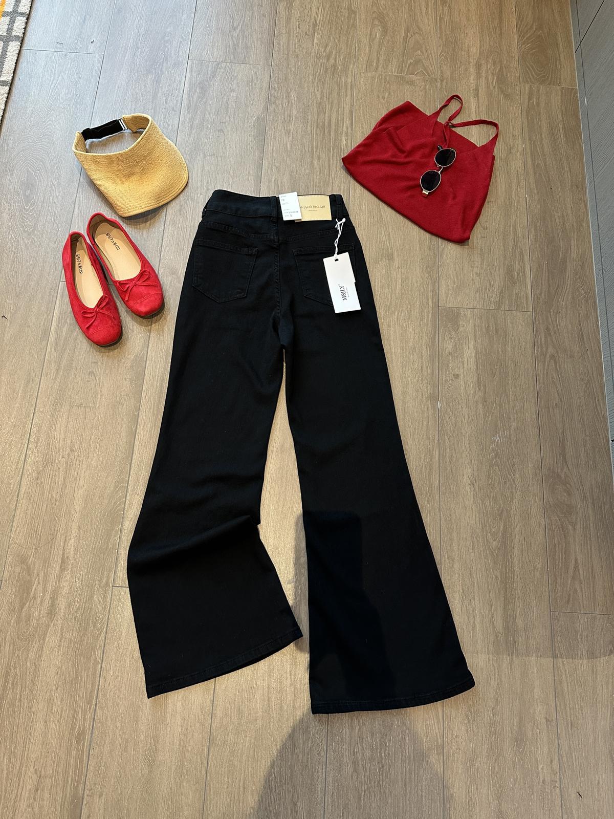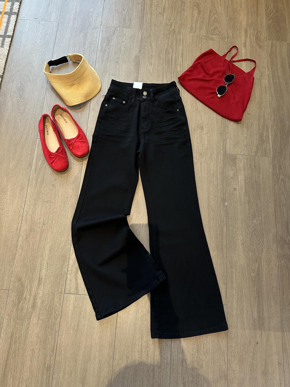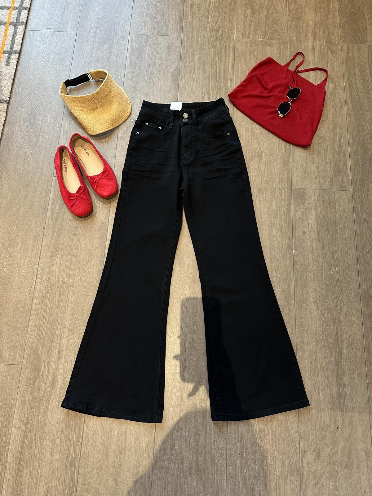 【C9237】大碼純黑色高腰兩粒扣設計顯瘦氣質彈力喇叭褲牛仔褲(最大可穿200斤)