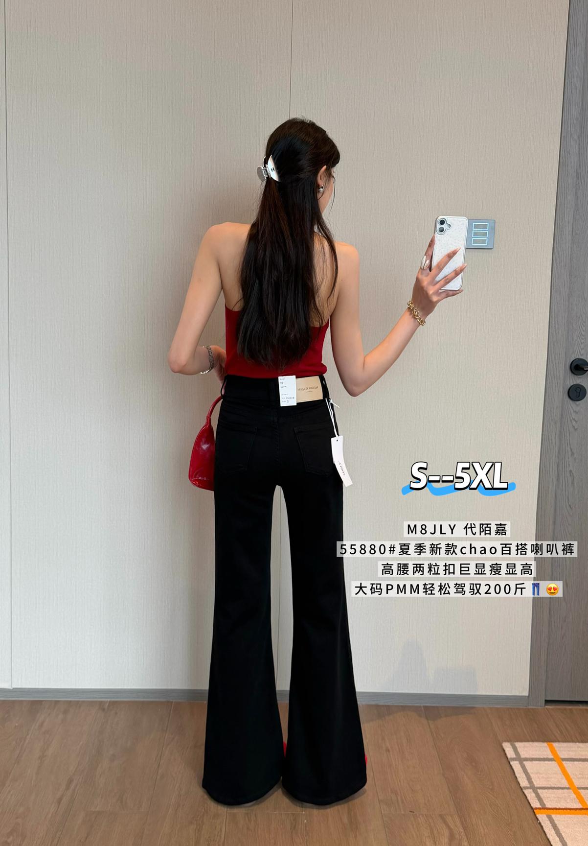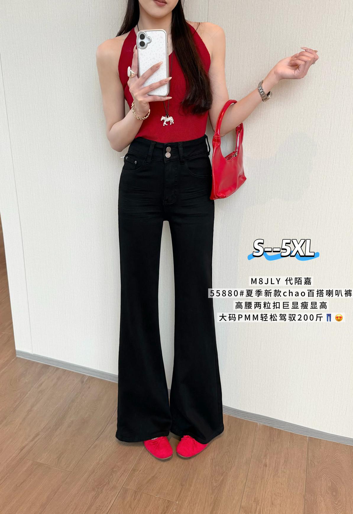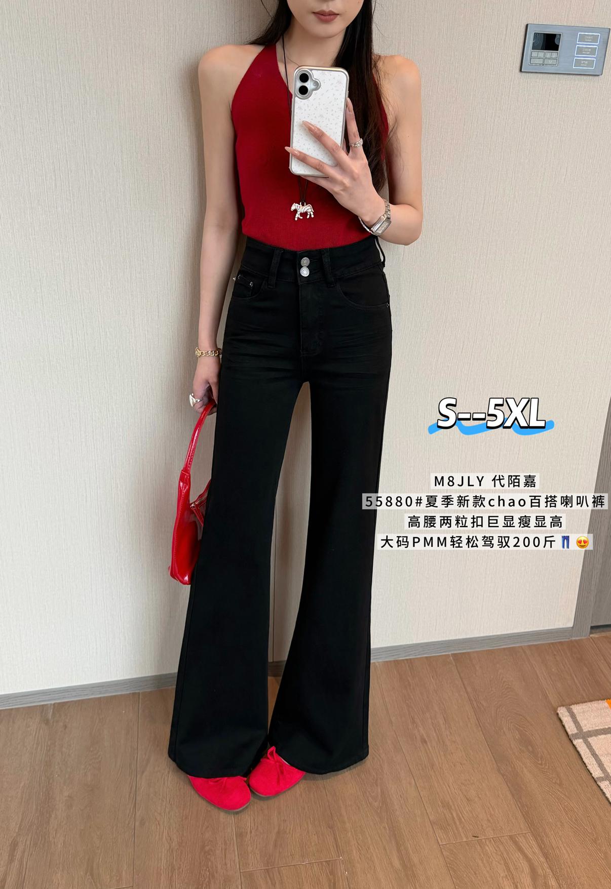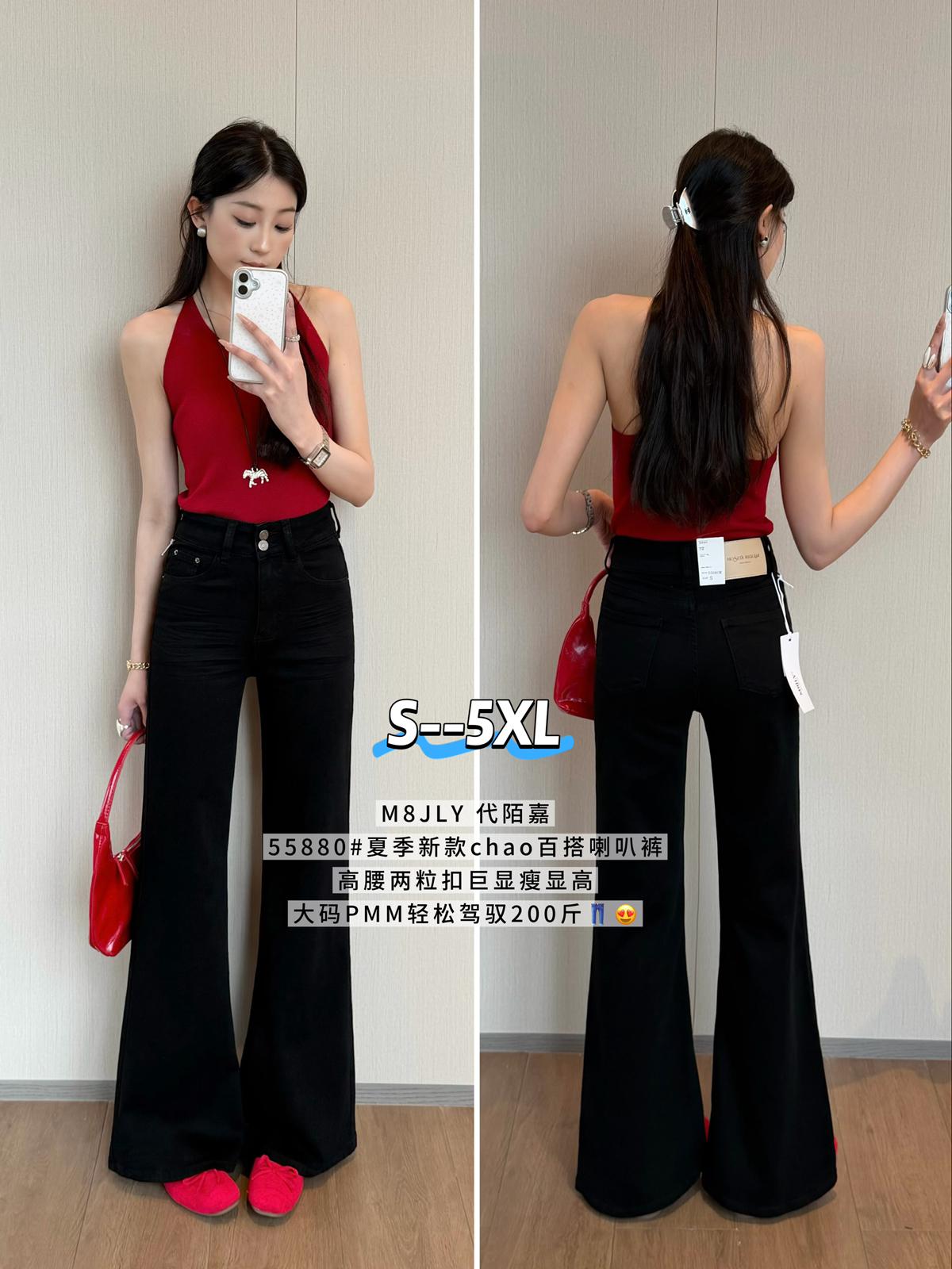 【C9237】大碼純黑色高腰兩粒扣設計顯瘦氣質彈力喇叭褲牛仔褲(最大可穿200斤)