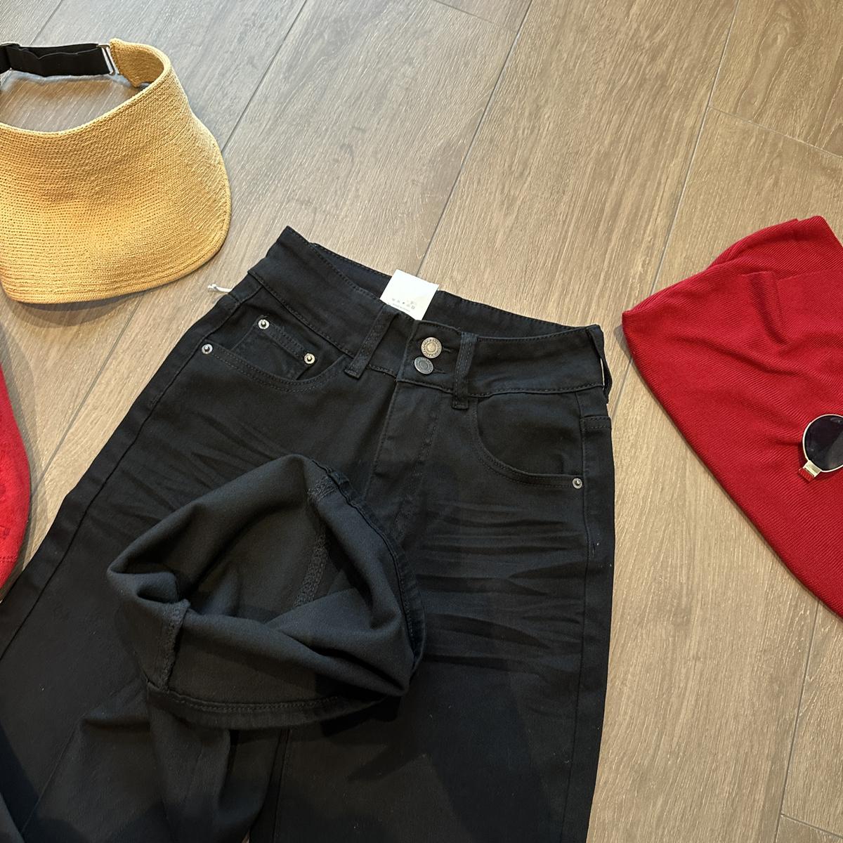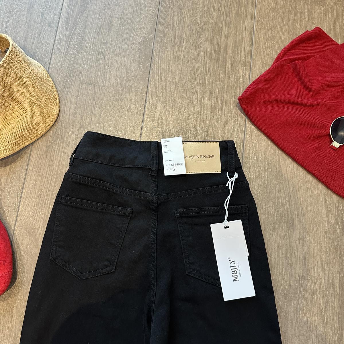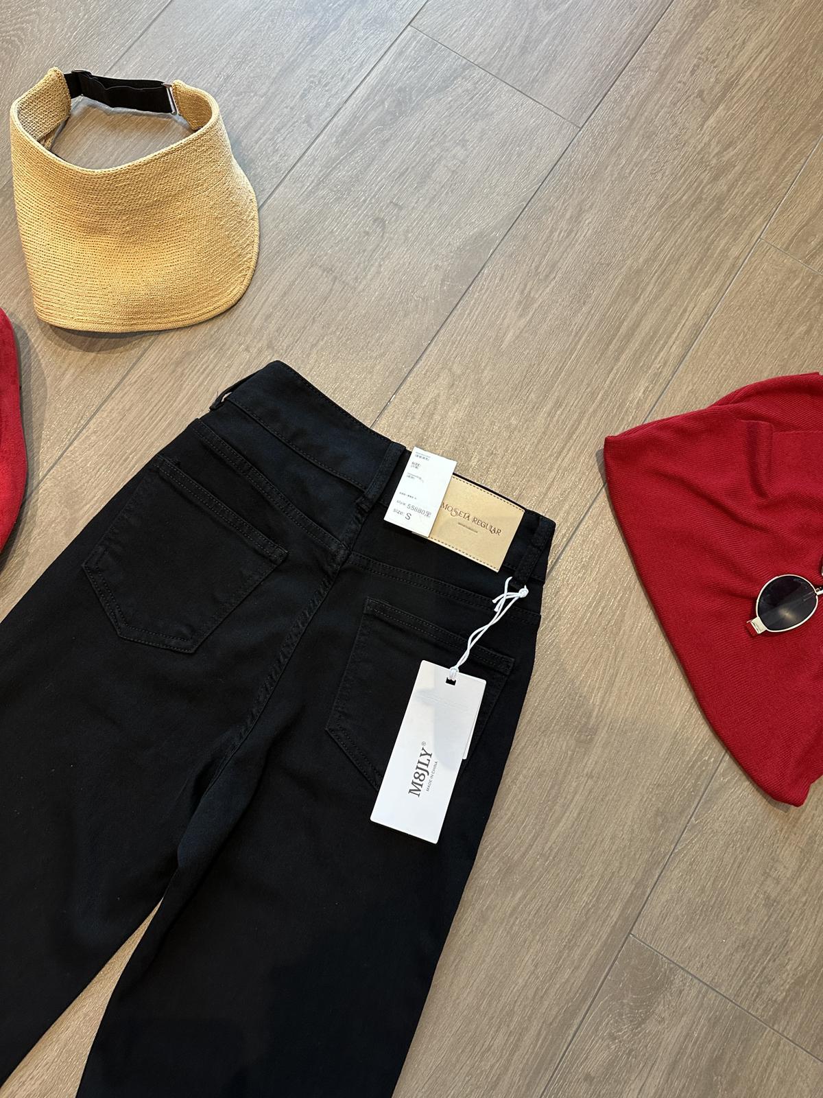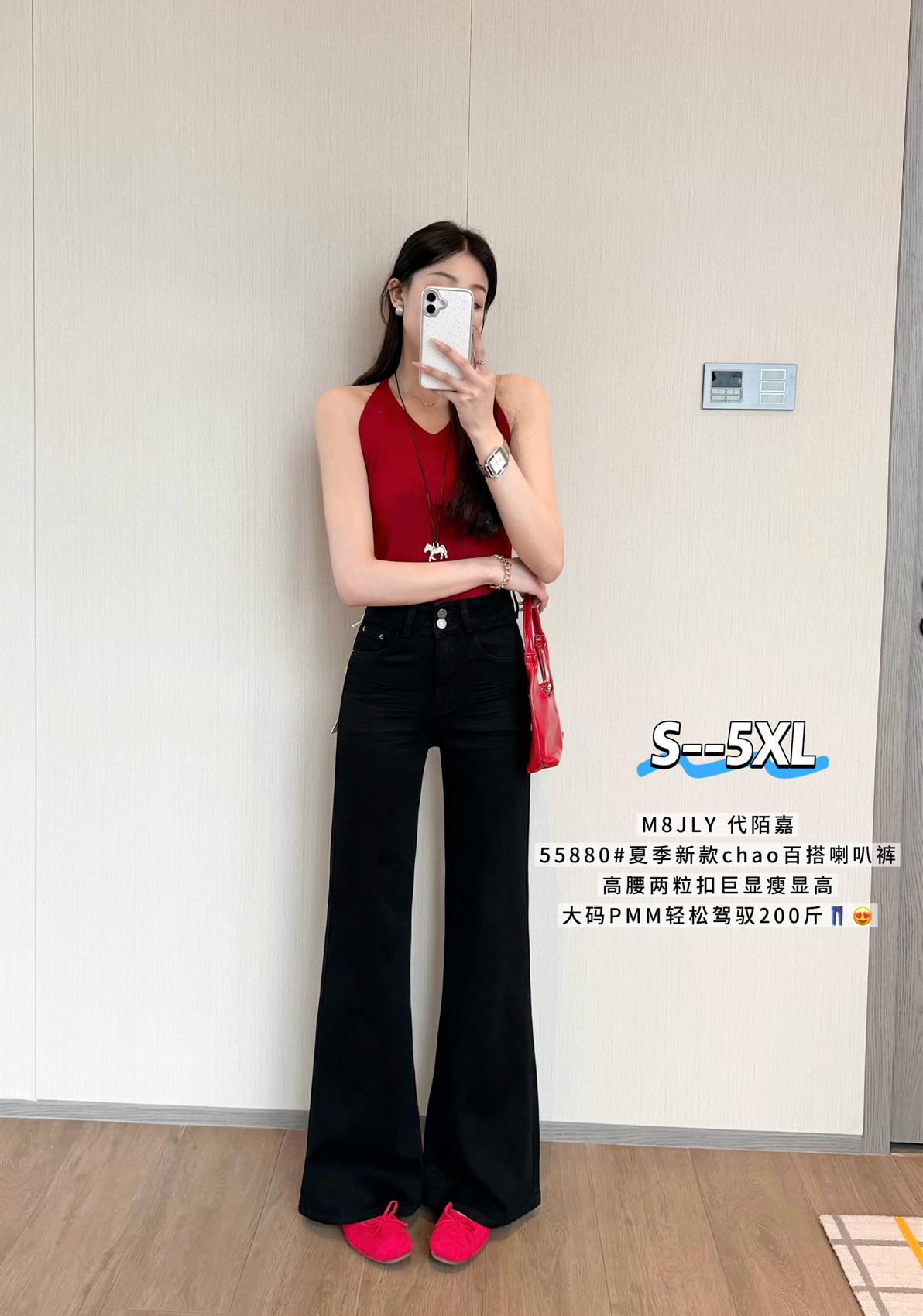 【C9237】大碼純黑色高腰兩粒扣設計顯瘦氣質彈力喇叭褲牛仔褲(最大可穿200斤)