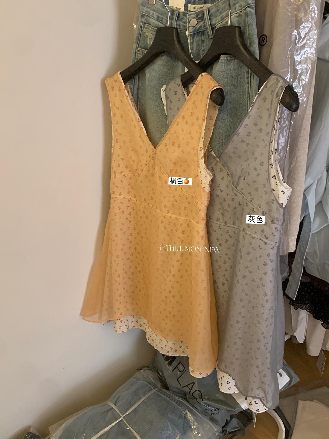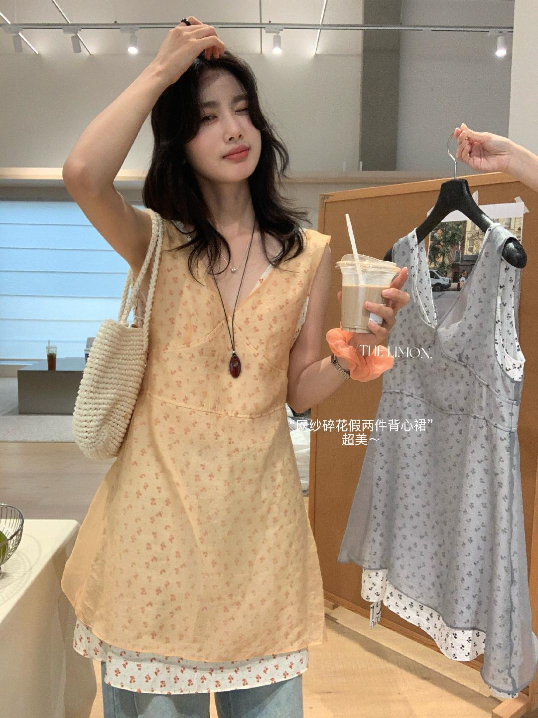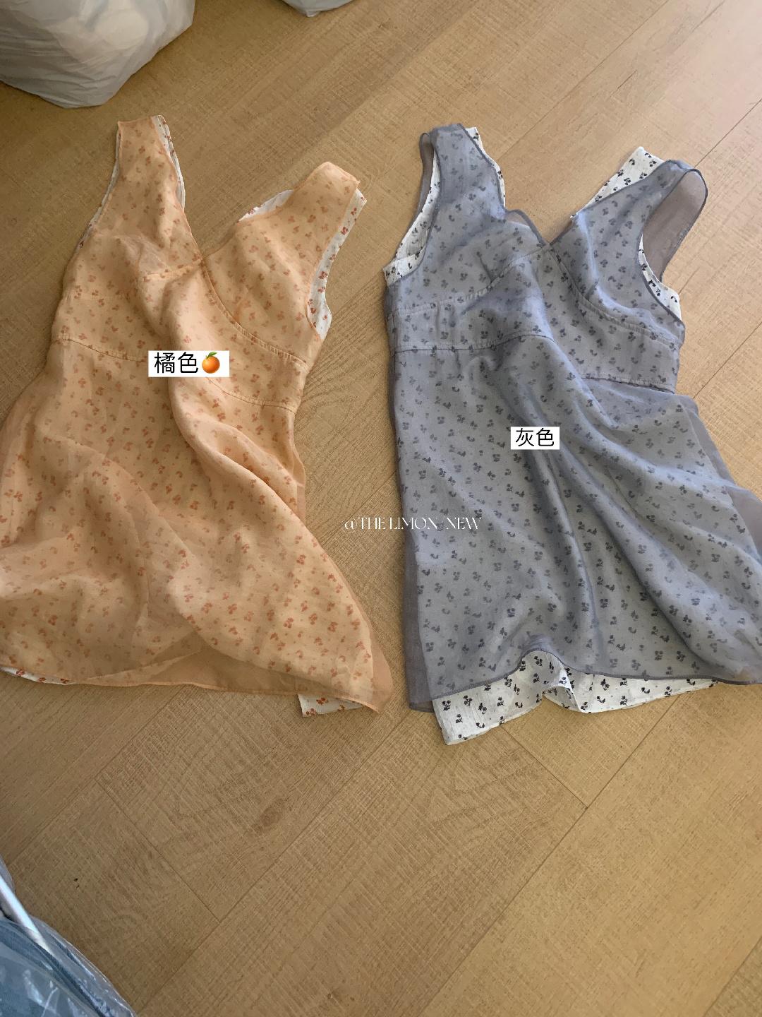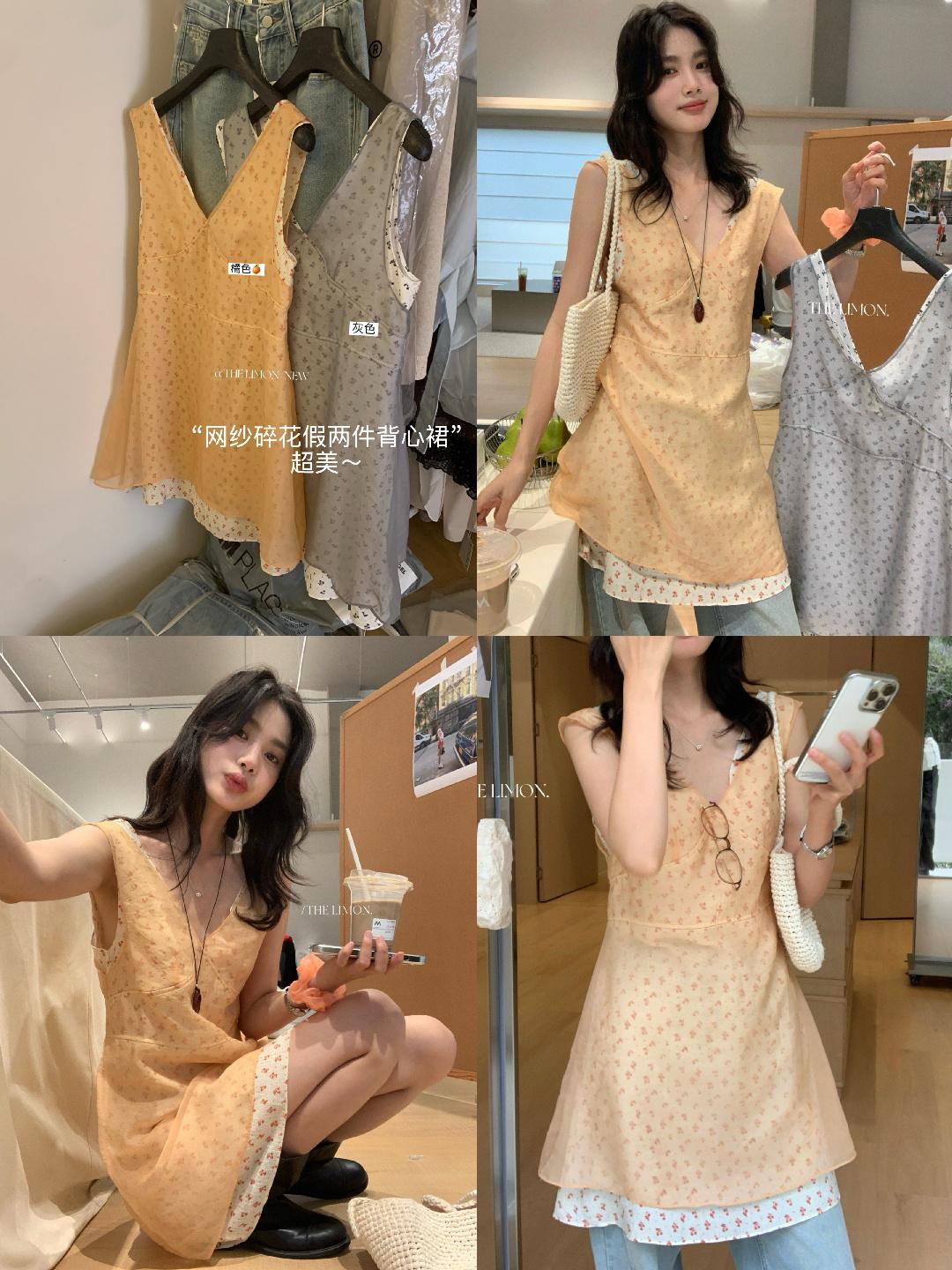 【C9245】26年夏上新!V領假兩件網紗碎花背心裙連衣裙