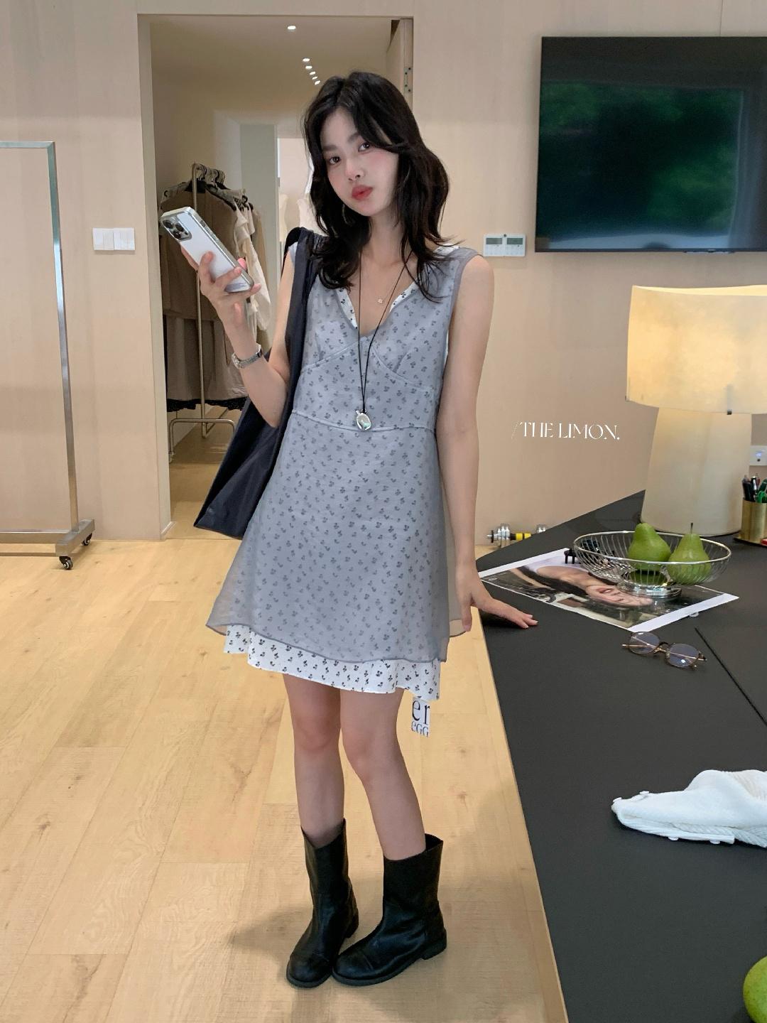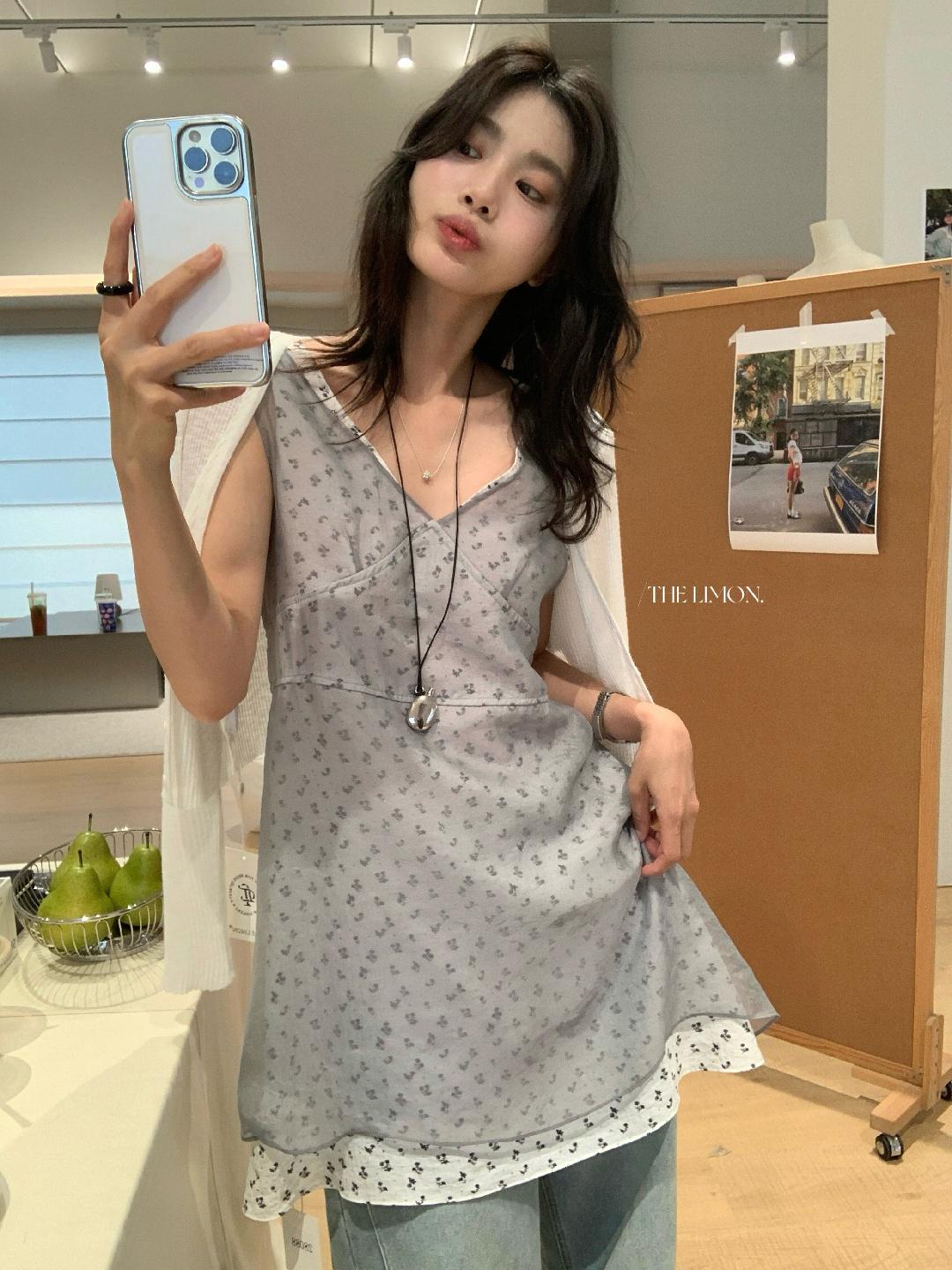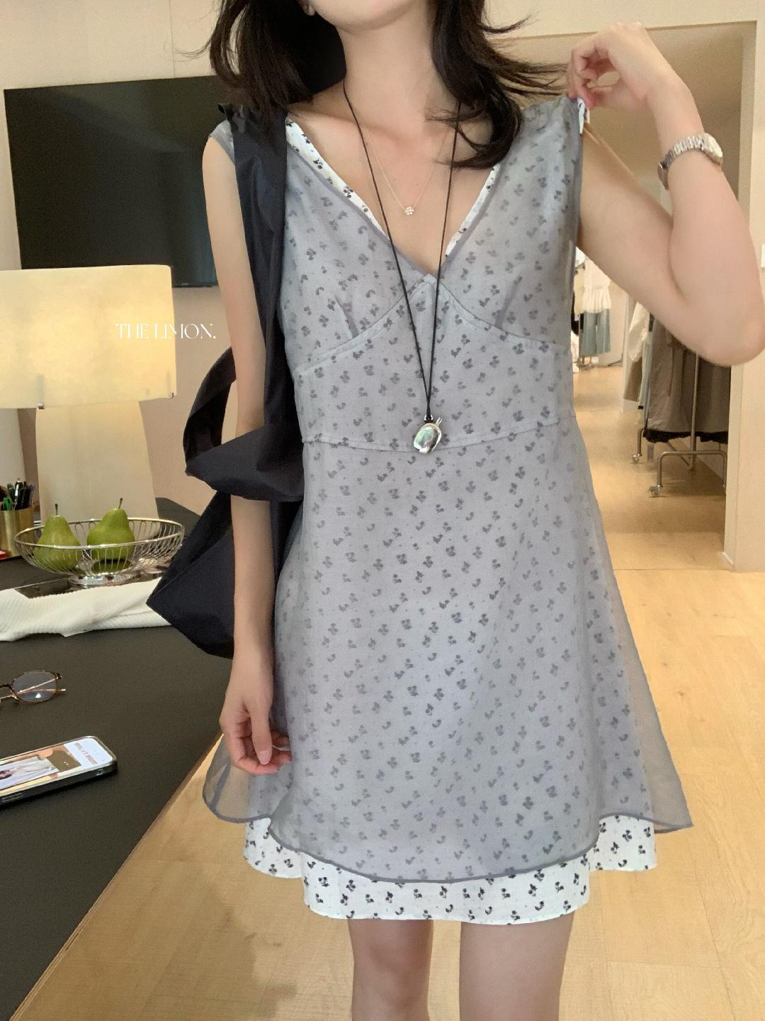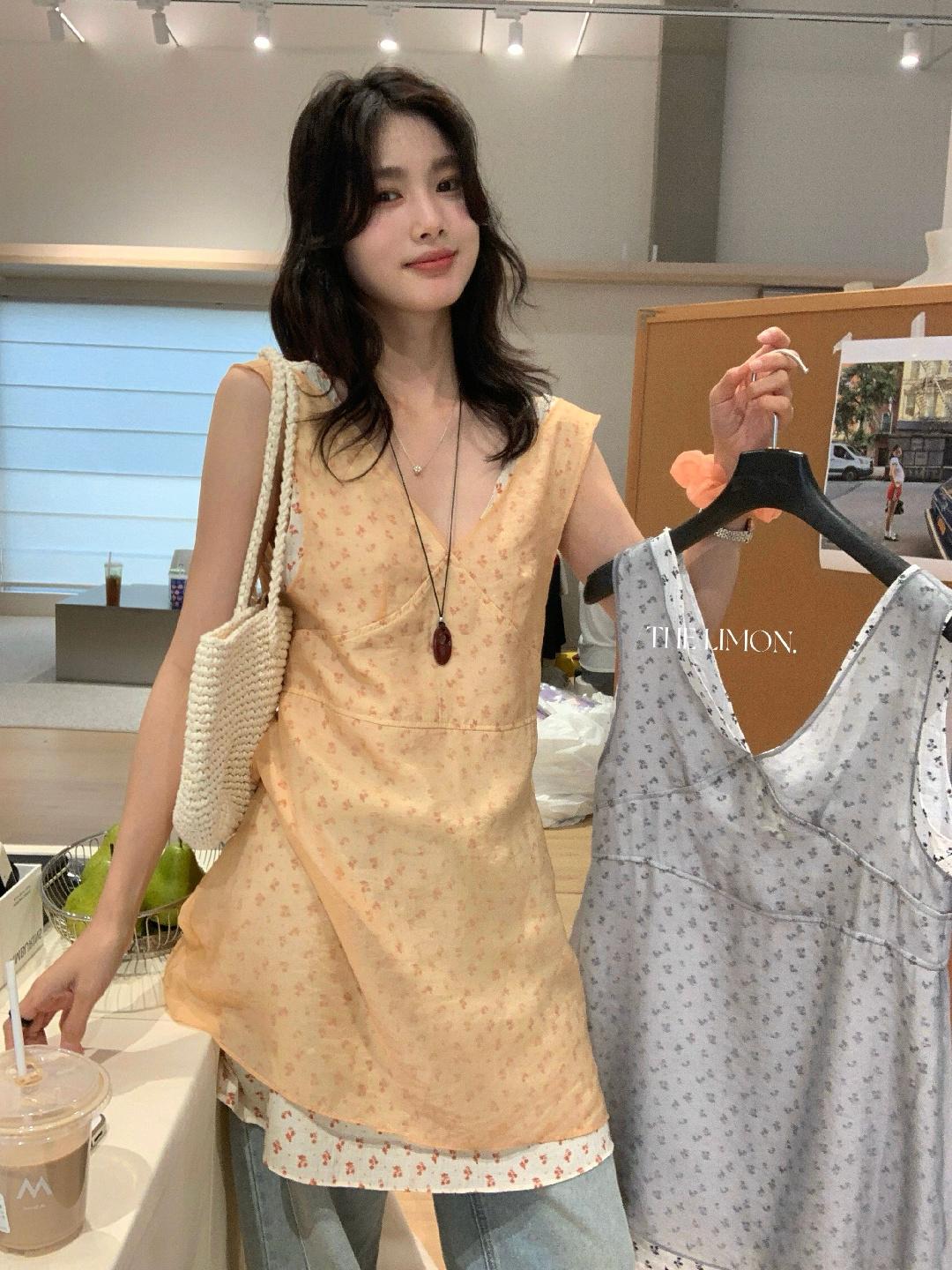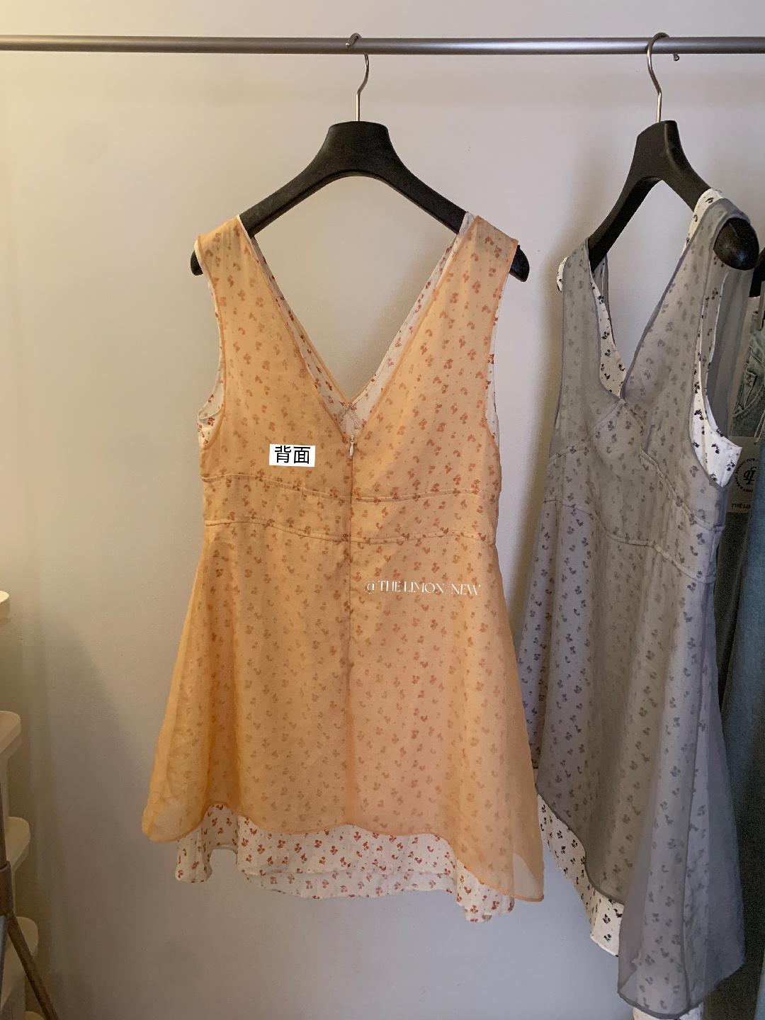 【C9245】26年夏上新!V領假兩件網紗碎花背心裙連衣裙