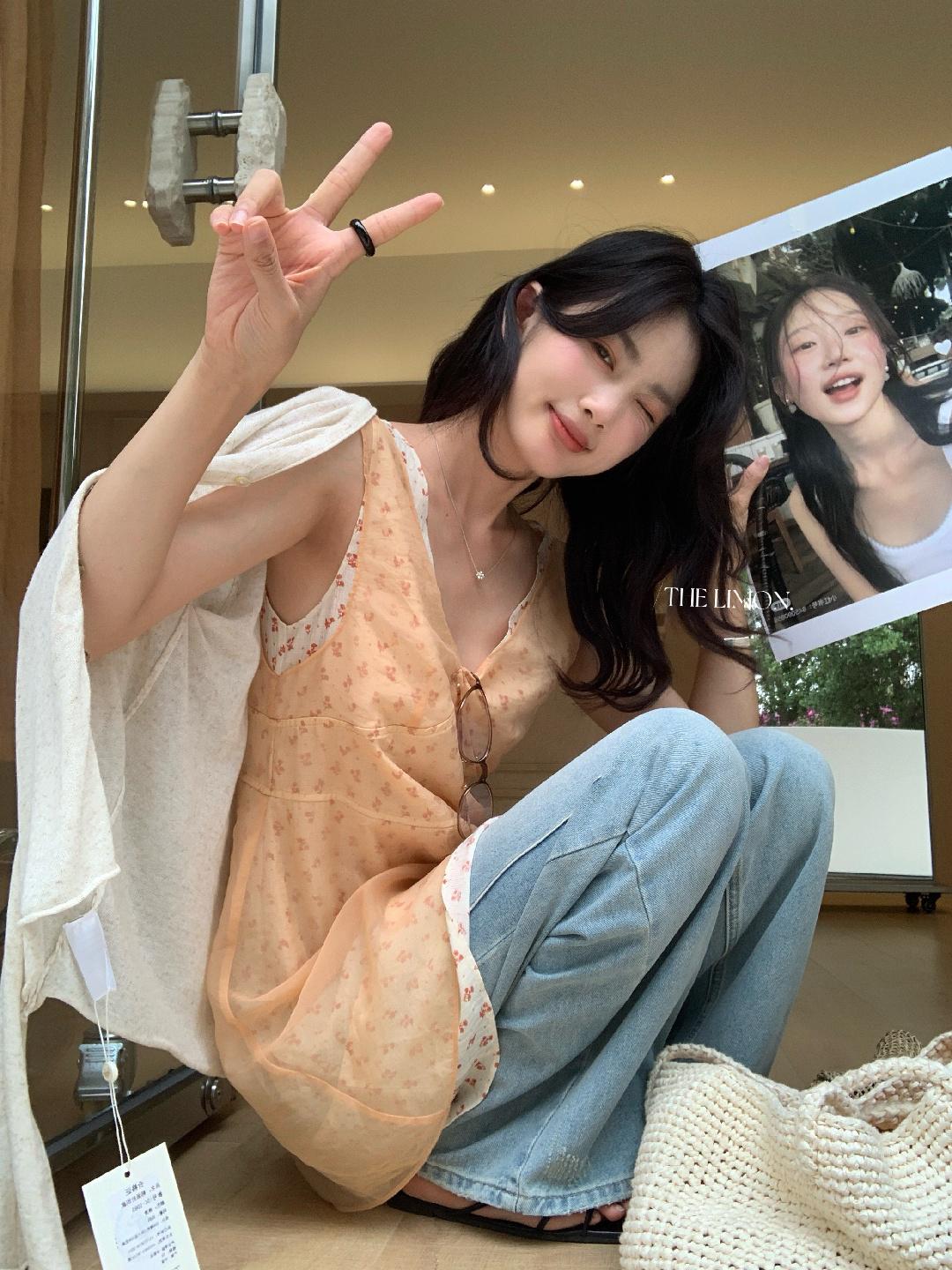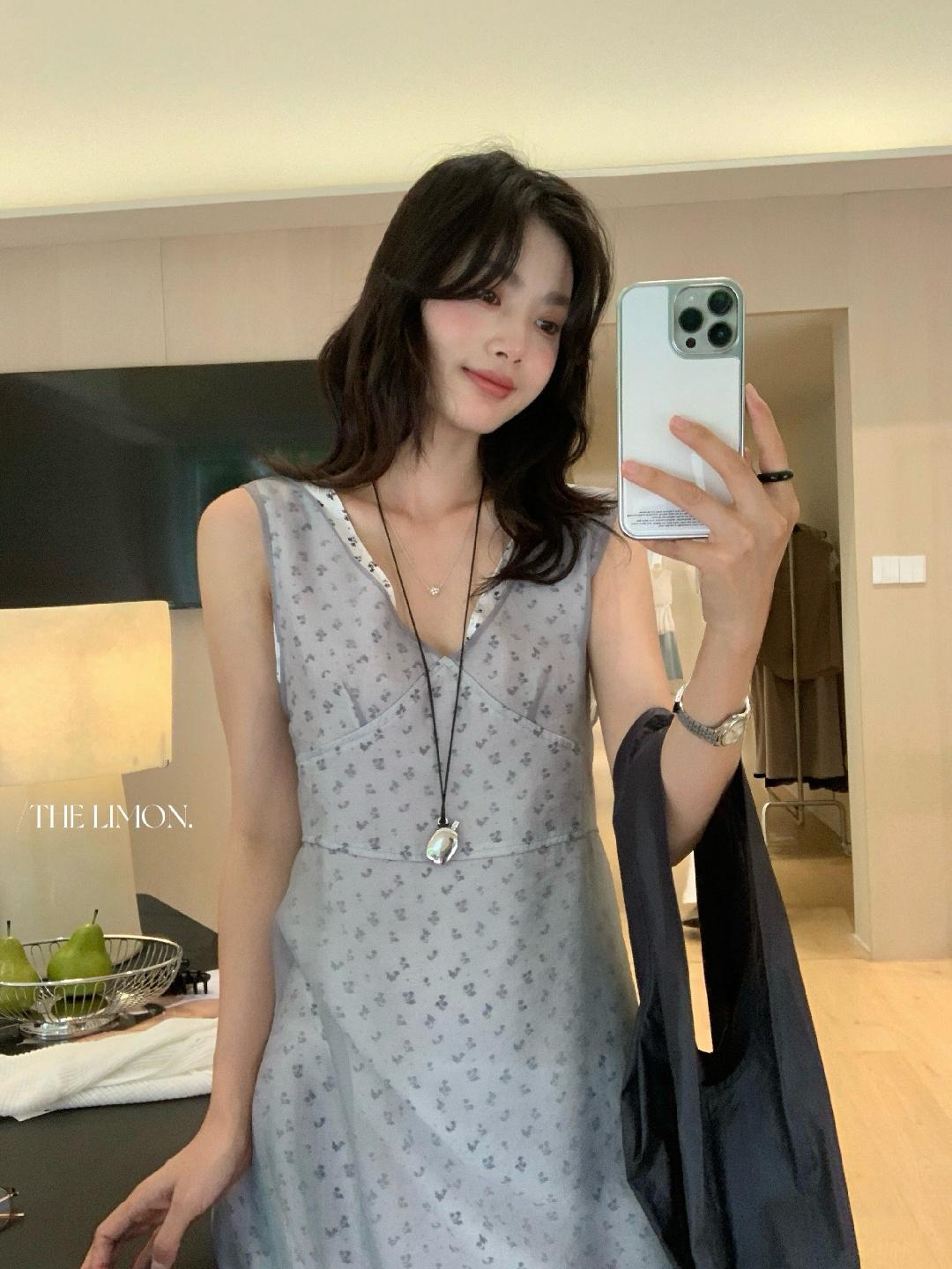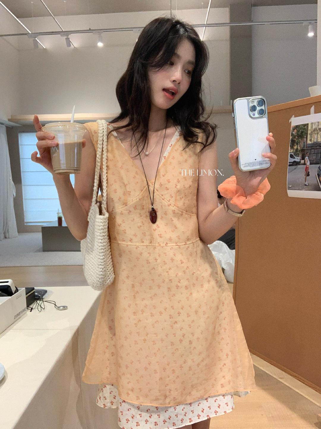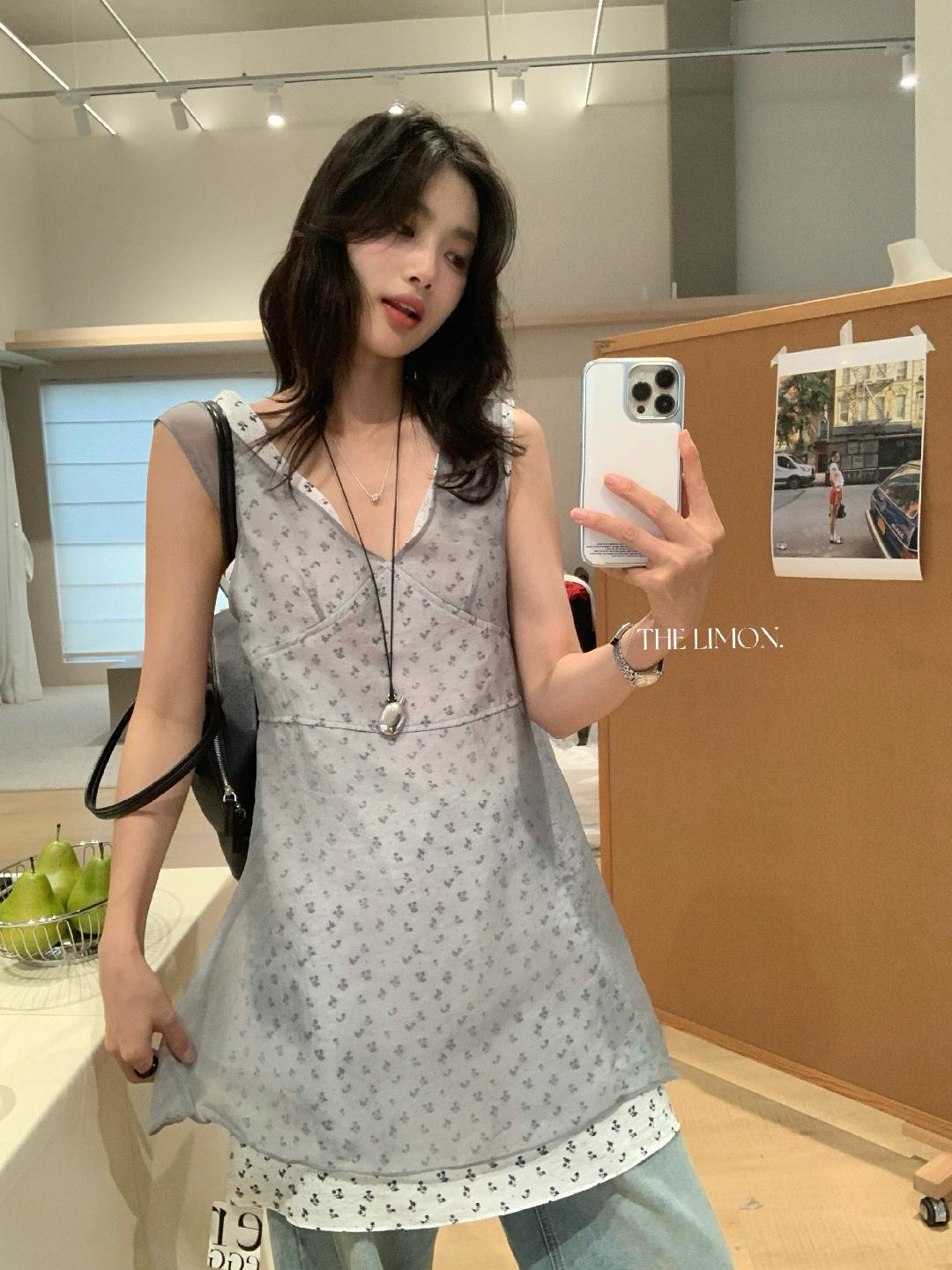 【C9245】26年夏上新!V領假兩件網紗碎花背心裙連衣裙