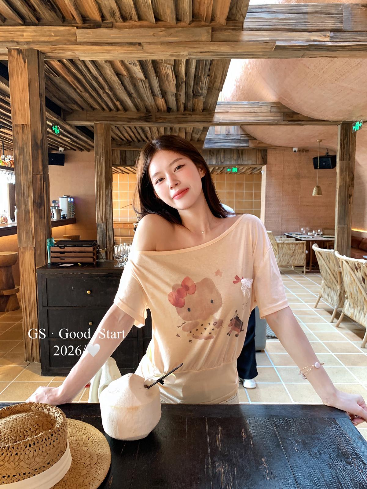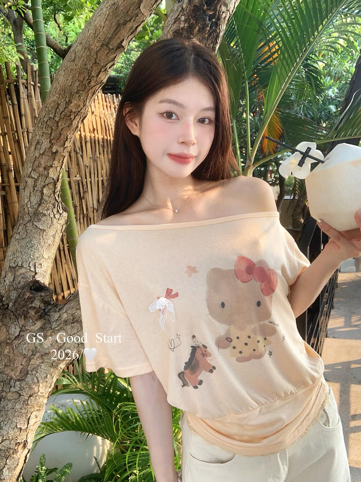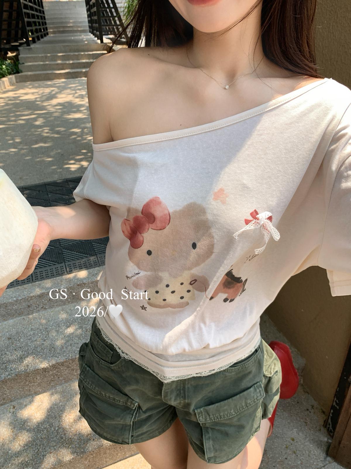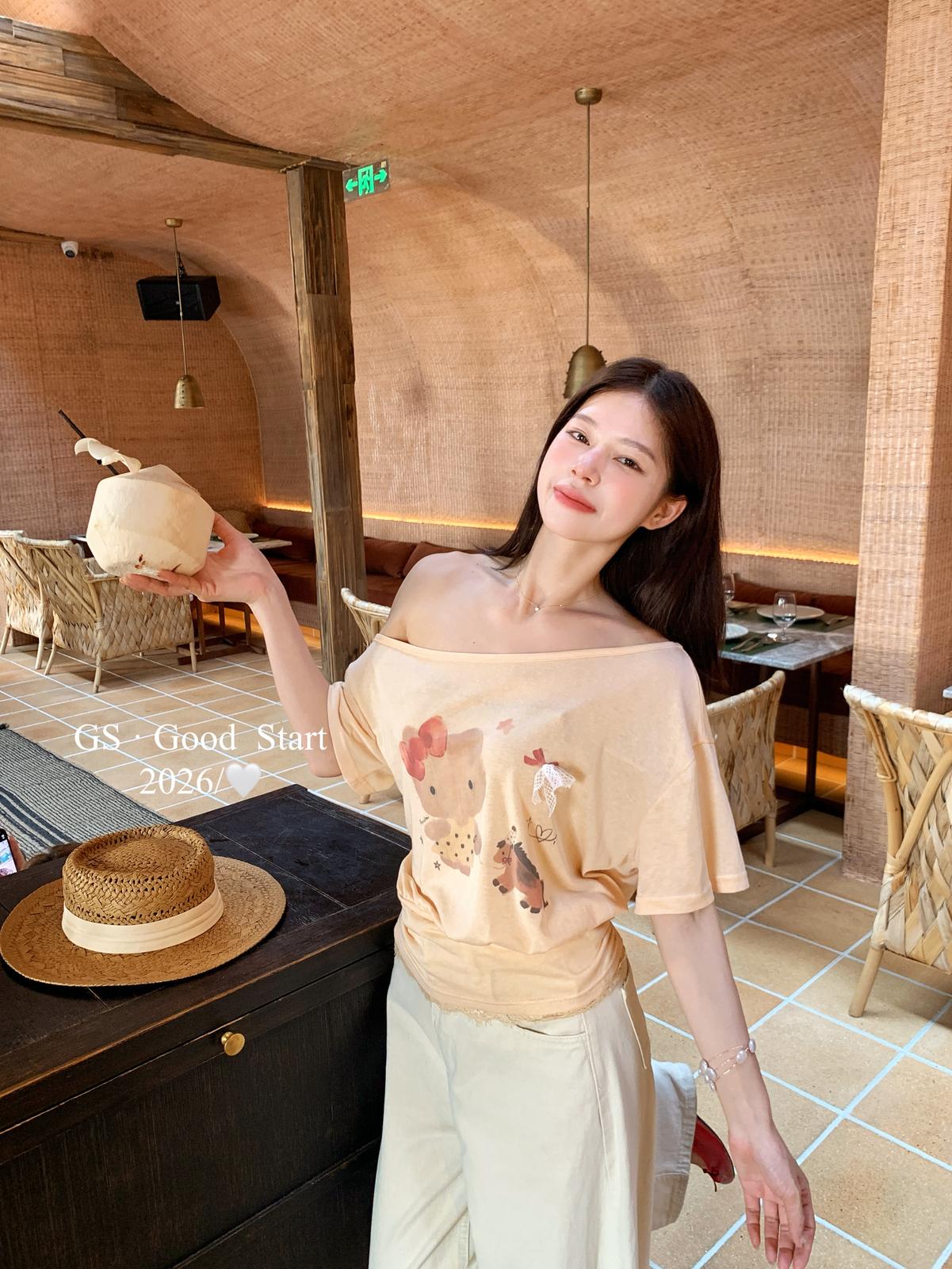 【C9247】好賣buff疊滿!鬆弛輕甜系*強推!夏季休閒趣味印花露肩短袖小衫(不含下裝)