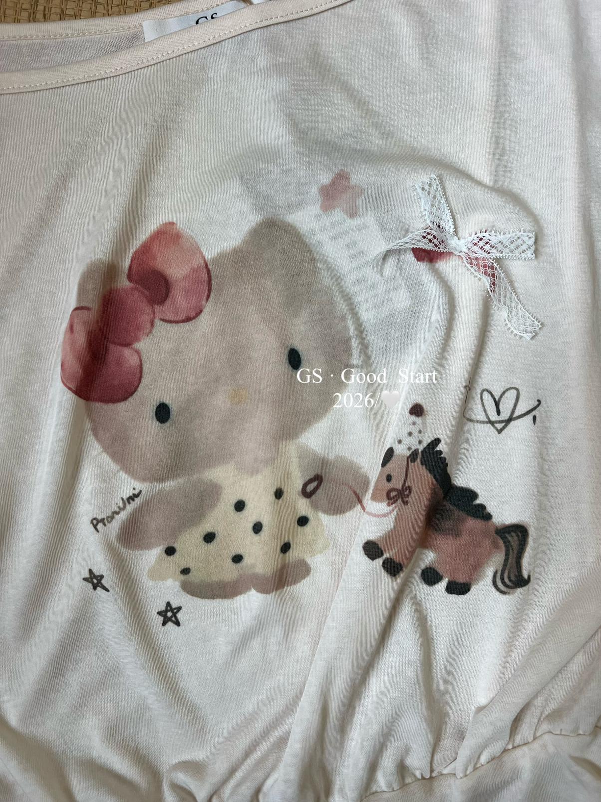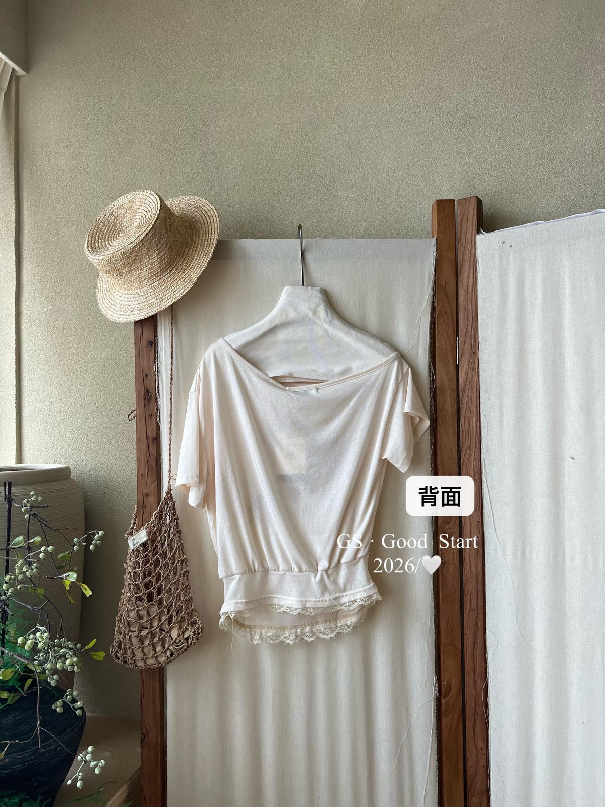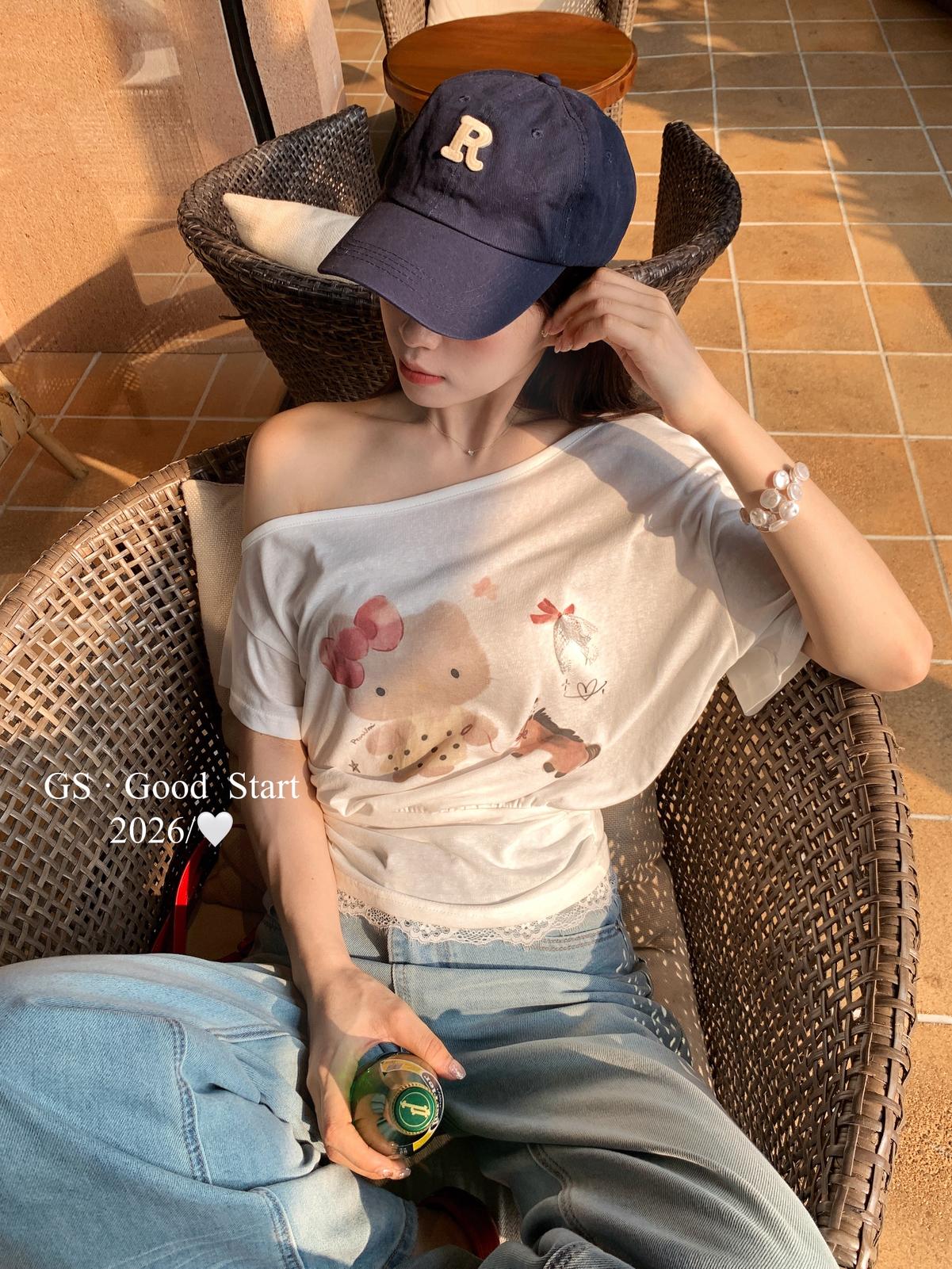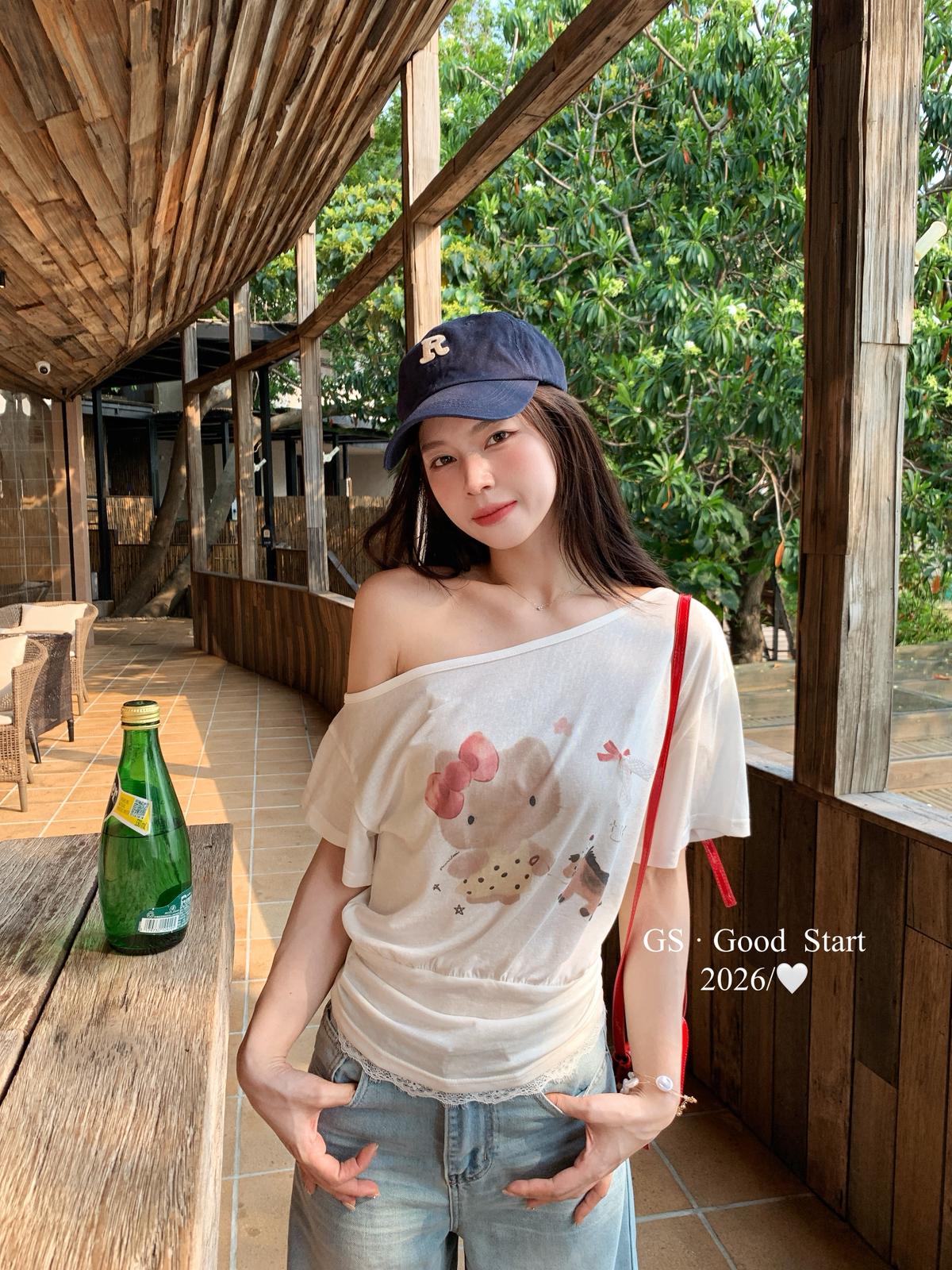 【C9247】好賣buff疊滿!鬆弛輕甜系*強推!夏季休閒趣味印花露肩短袖小衫(不含下裝)