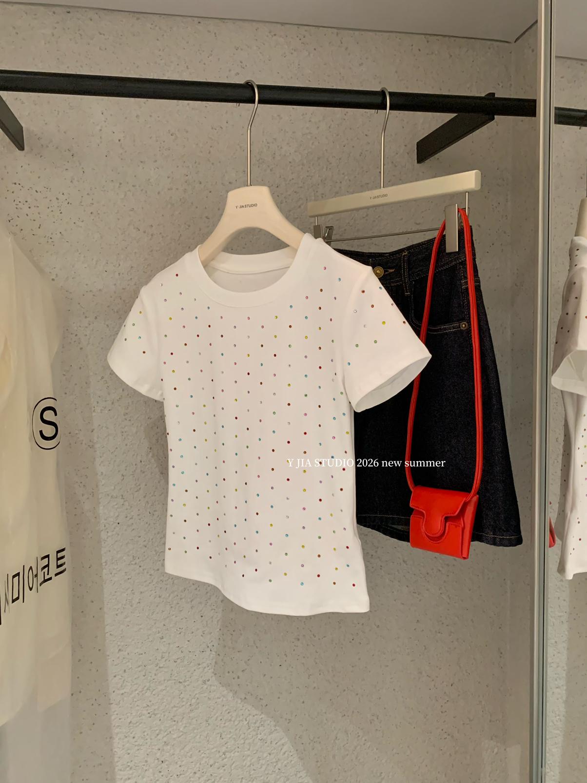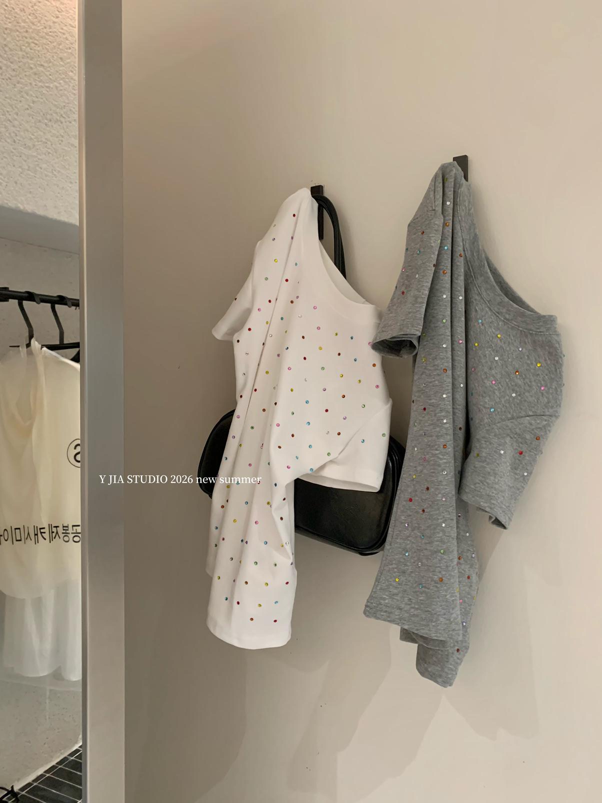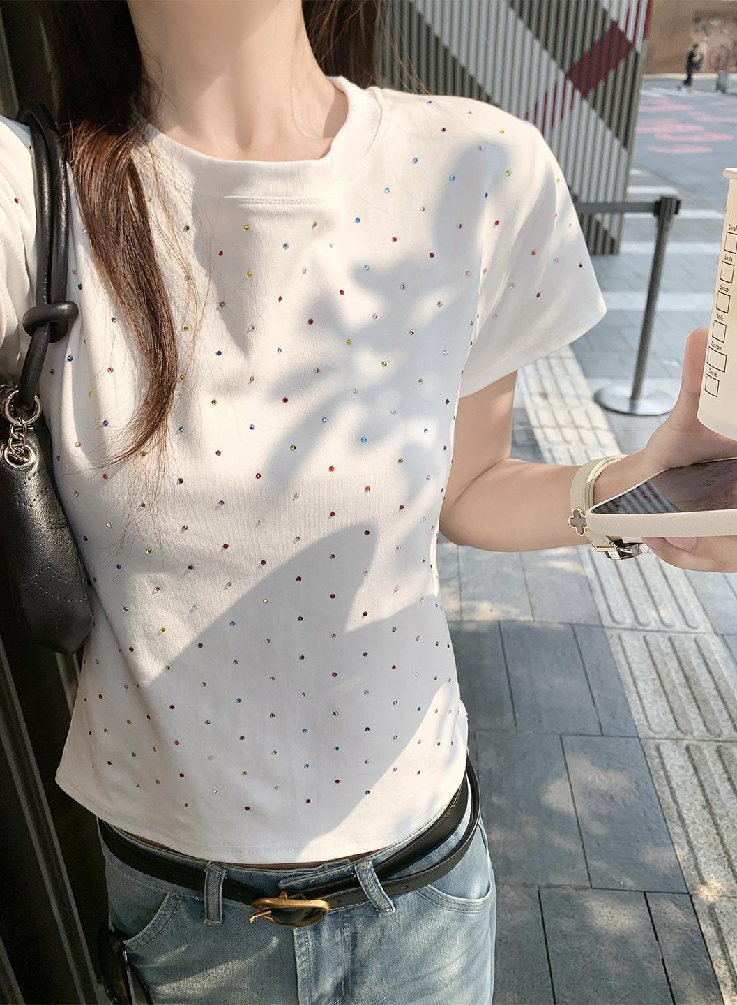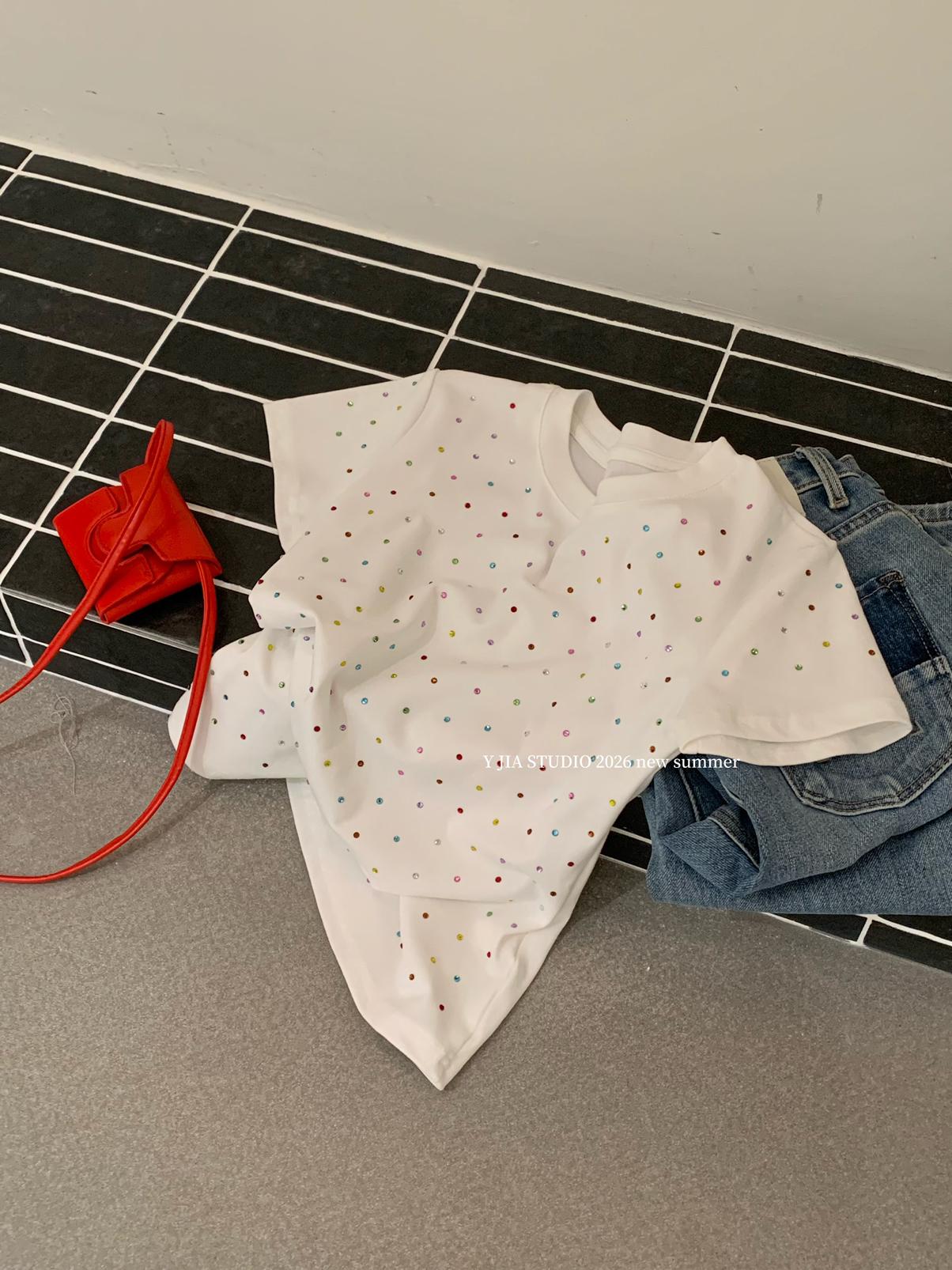 【C9296】Ins燙鑽波點短款正肩短袖T恤(不配包包只賣短袖)