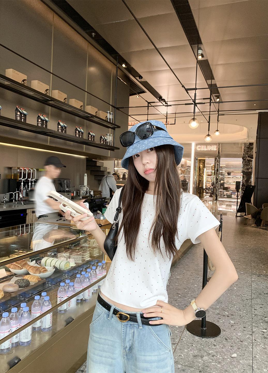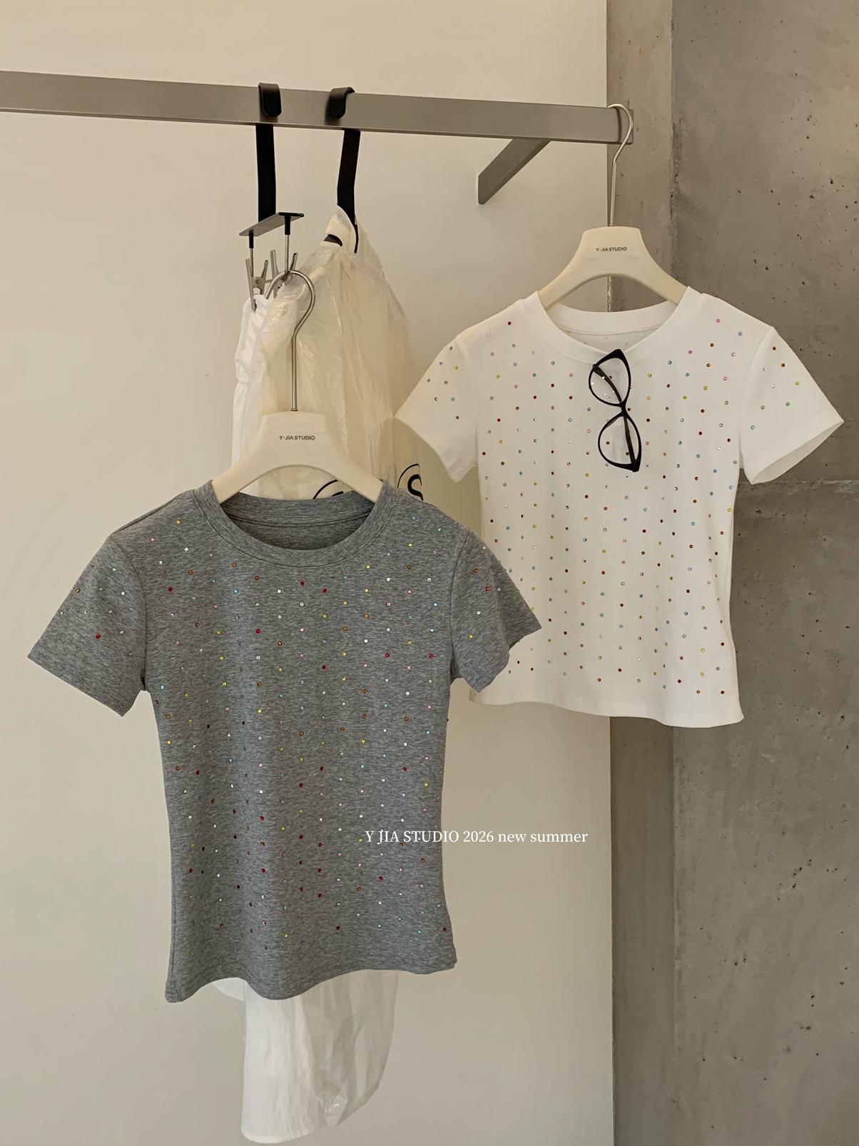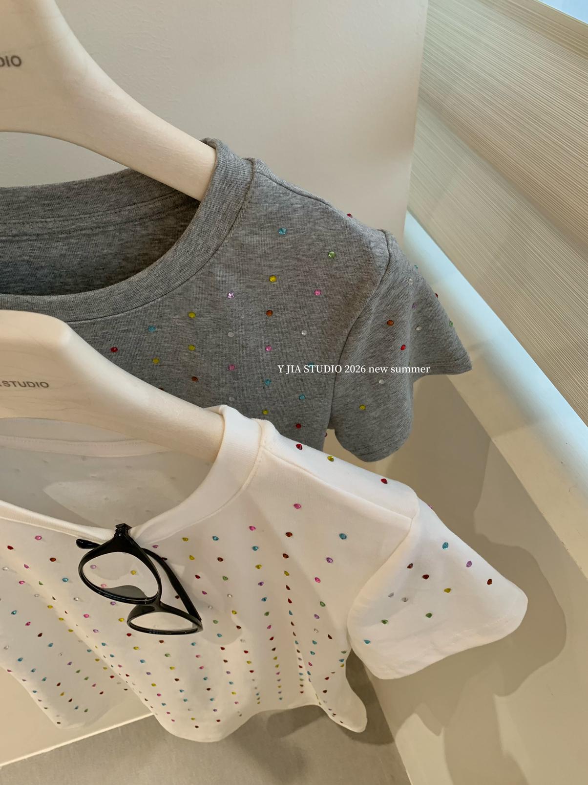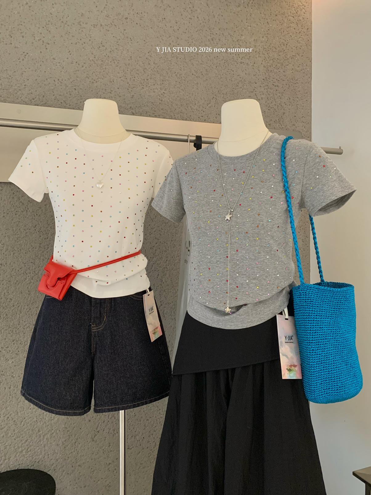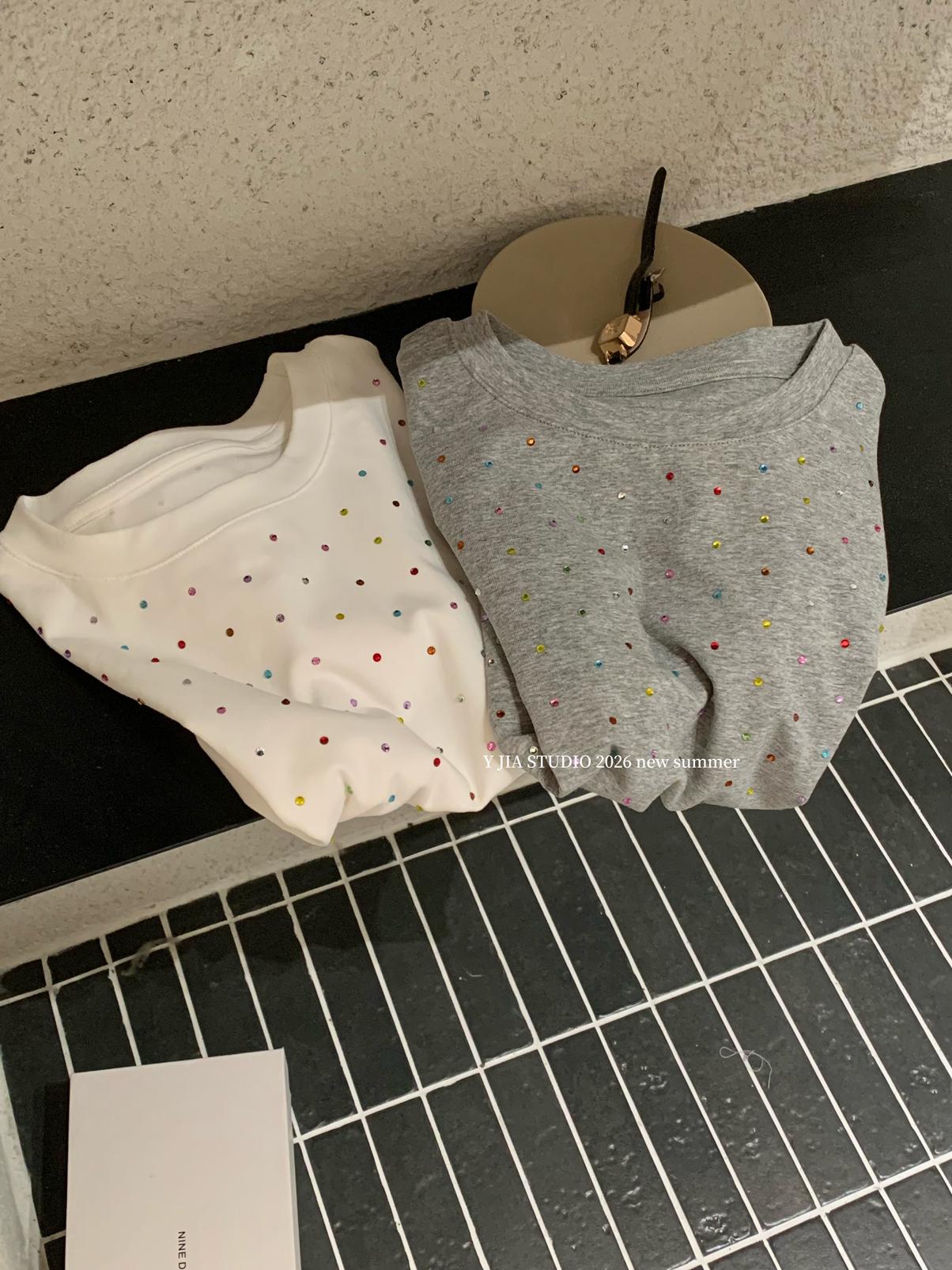 【C9296】Ins燙鑽波點短款正肩短袖T恤(不配包包只賣短袖)