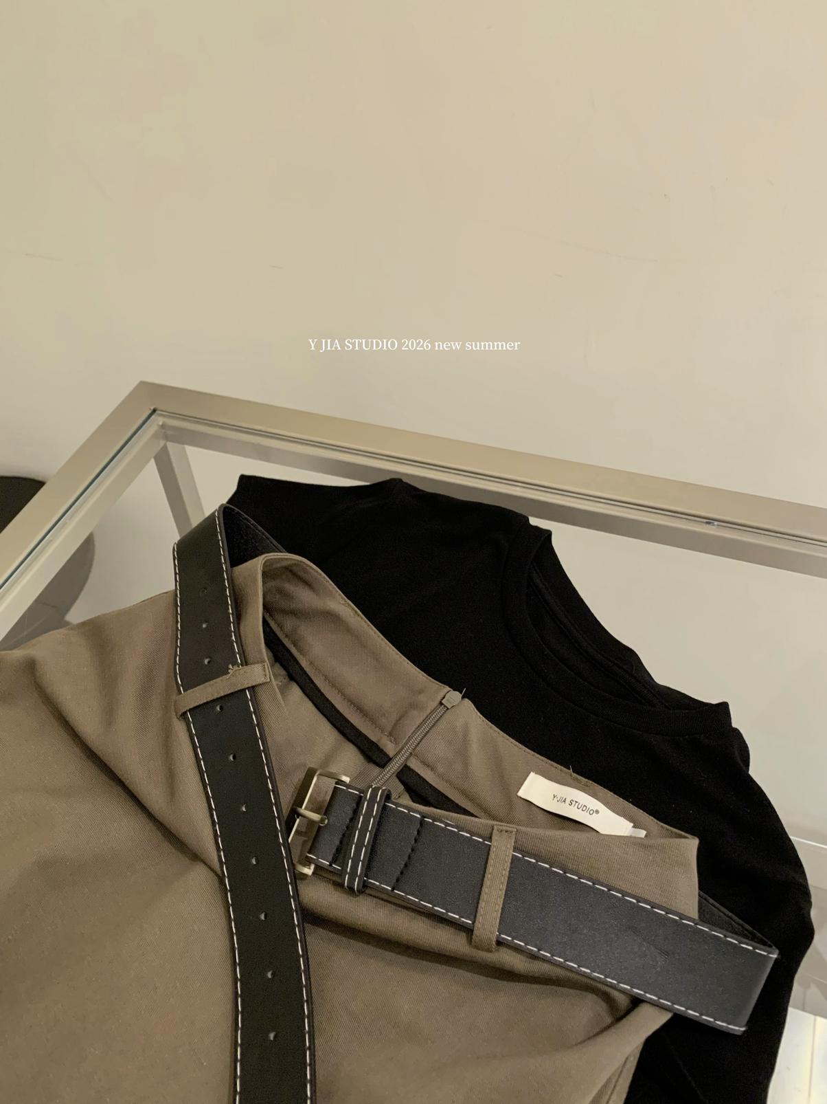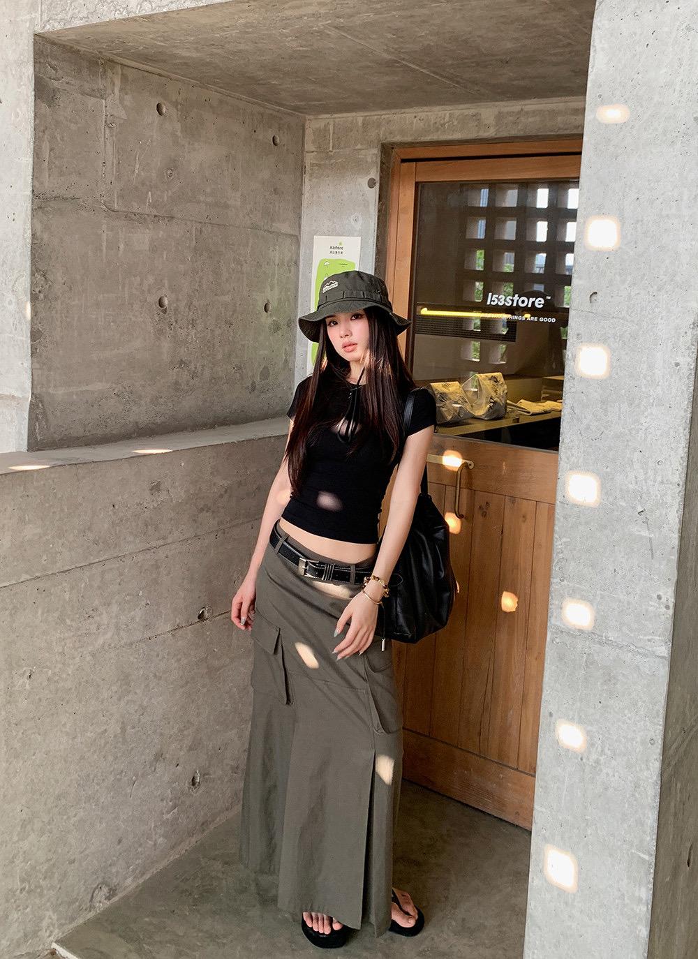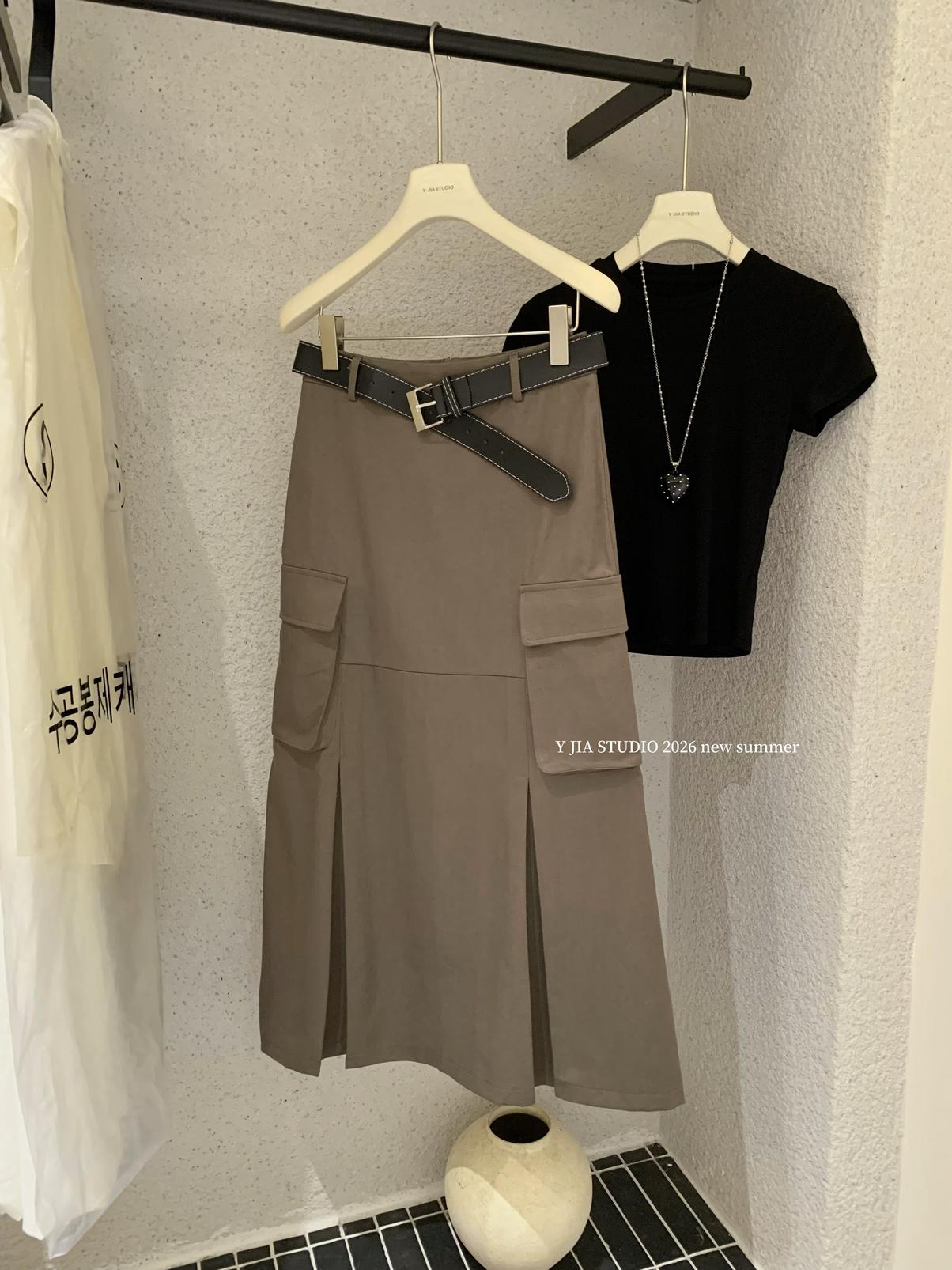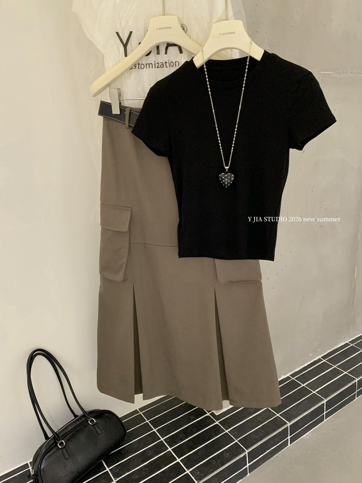 【C9297】甜酷辣妹ins修身正肩基礎短袖T恤+美式復古工裝半身裙兩件套套裝(配腰帶)(不配項鍊)