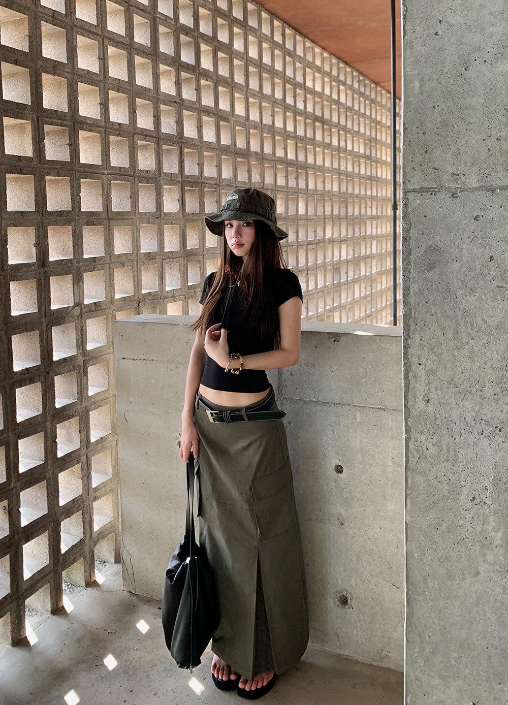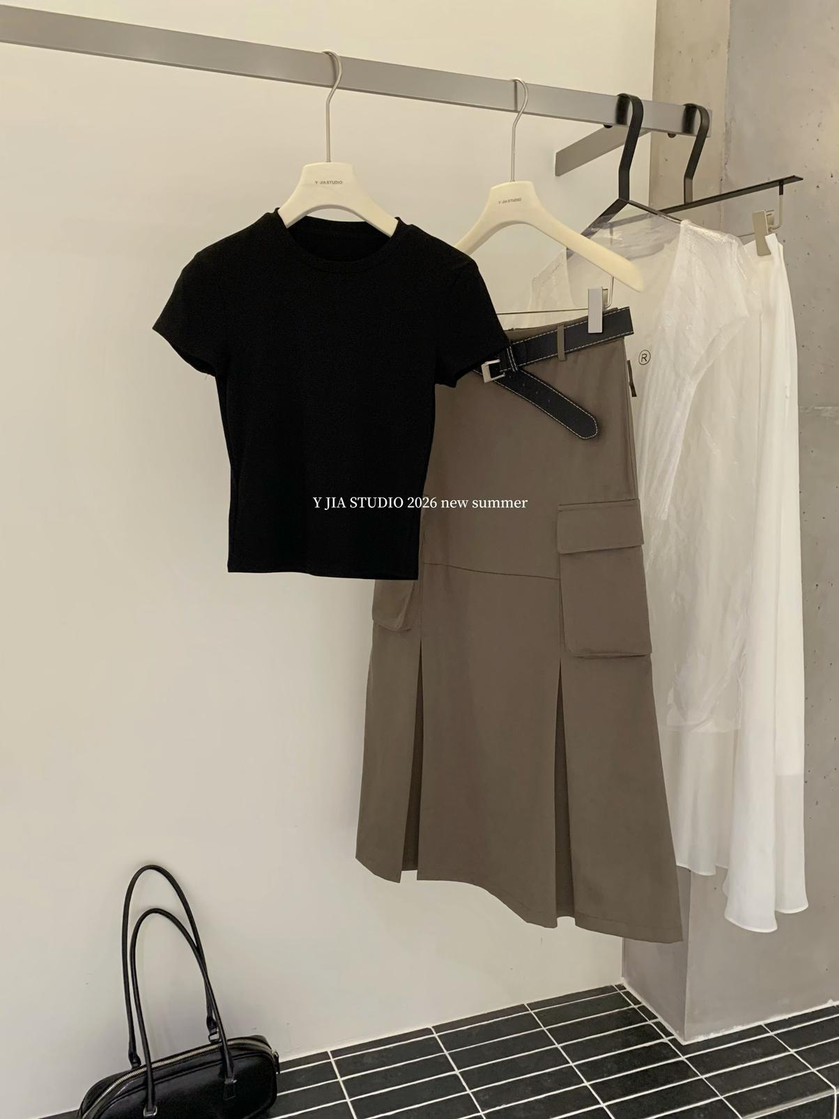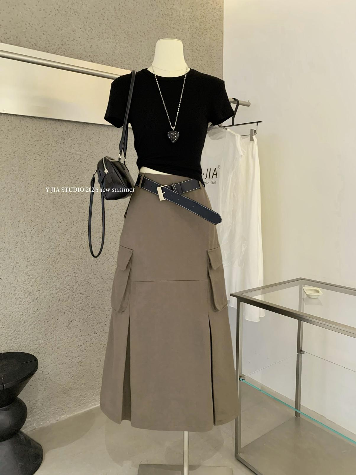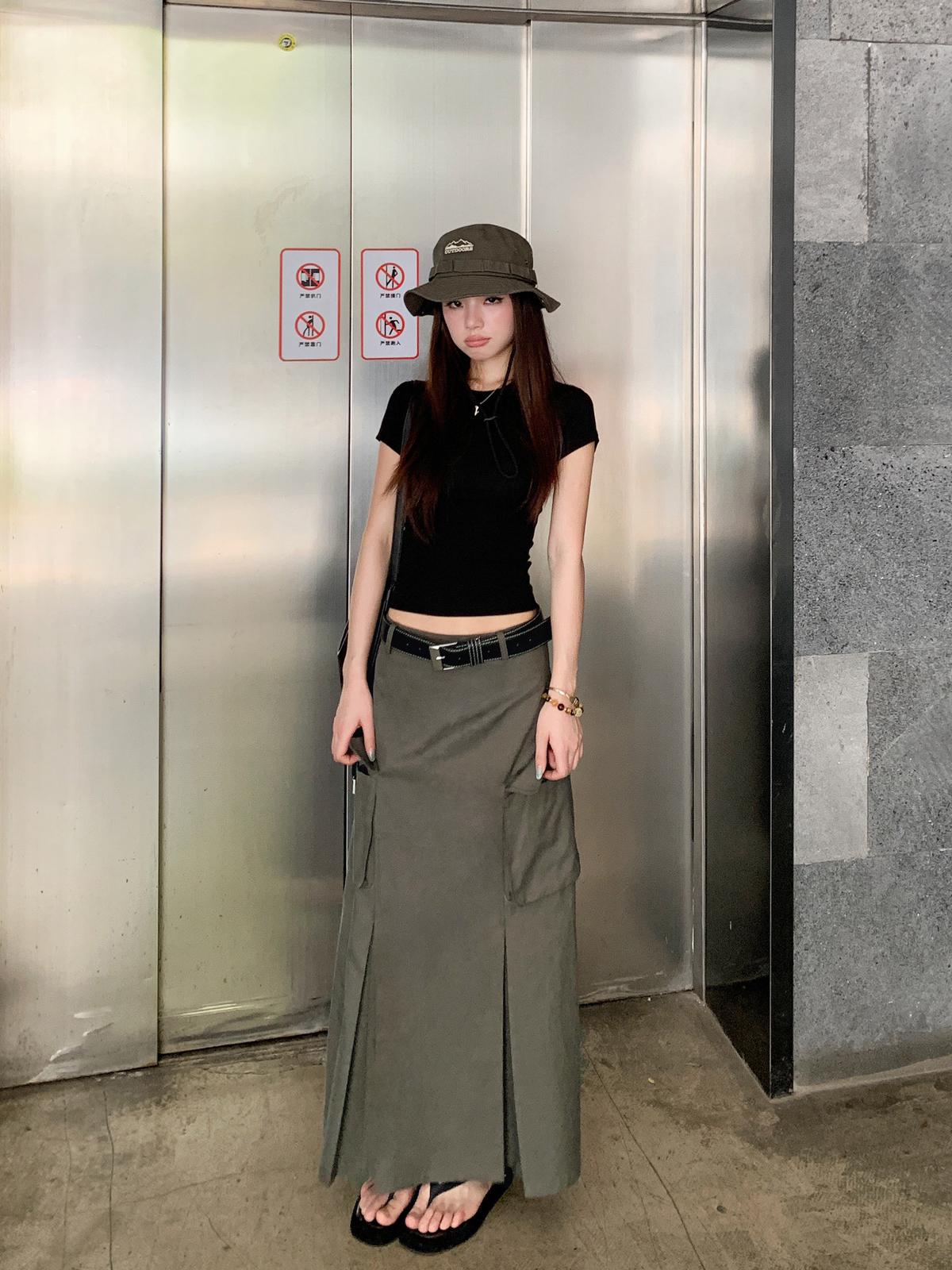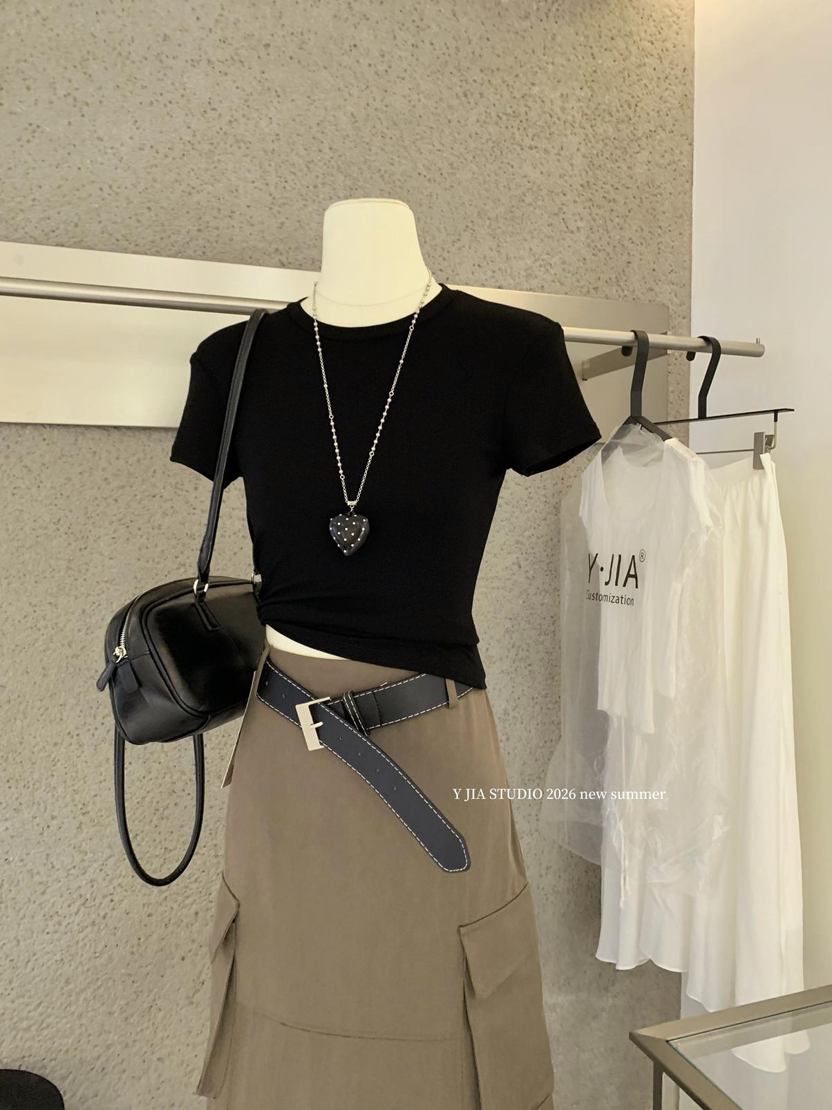 【C9297】甜酷辣妹ins修身正肩基礎短袖T恤+美式復古工裝半身裙兩件套套裝(配腰帶)(不配項鍊)