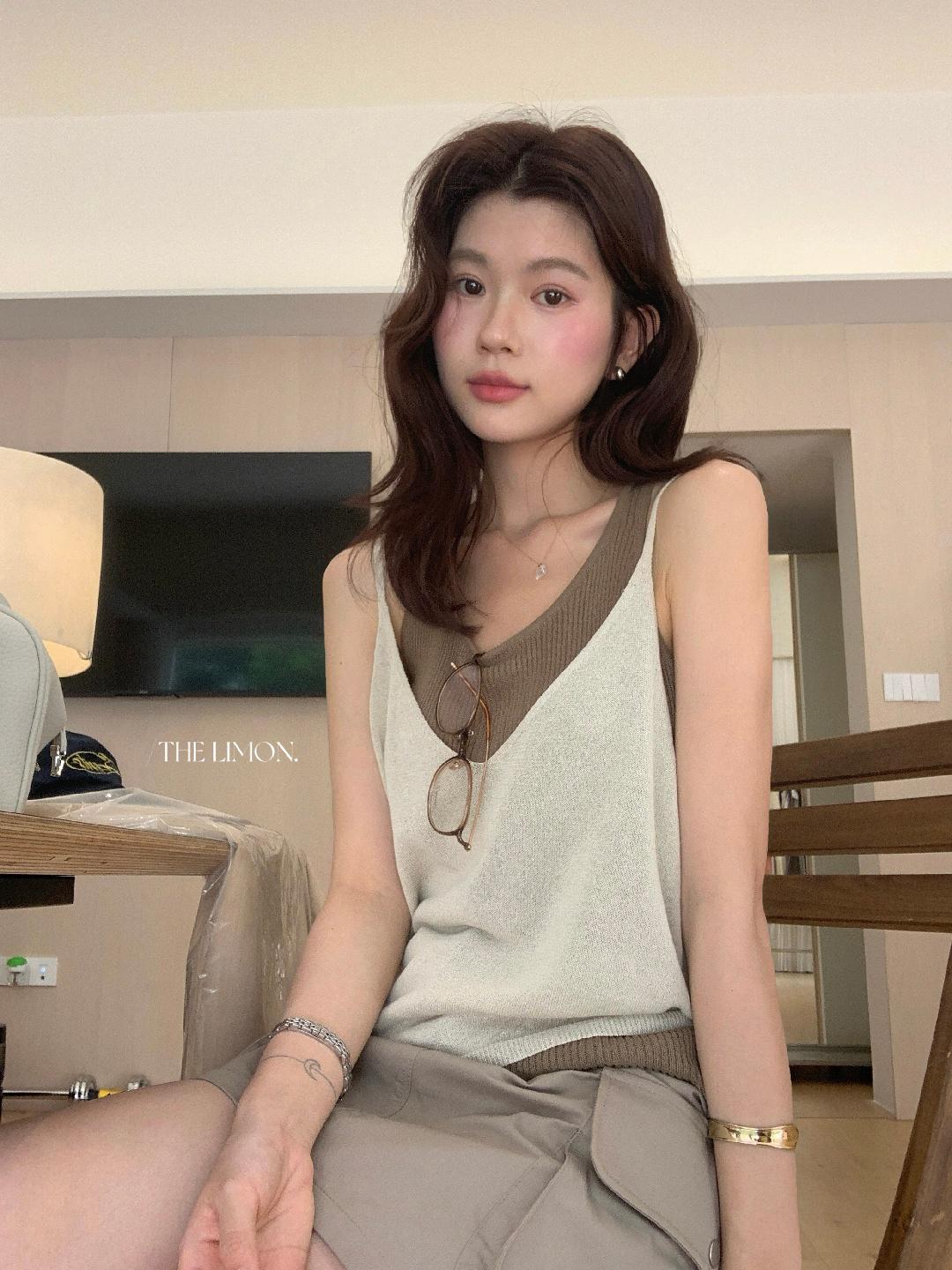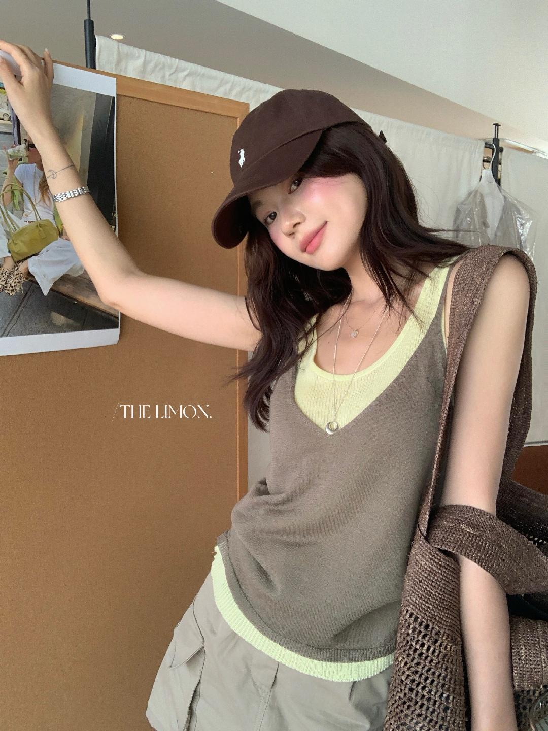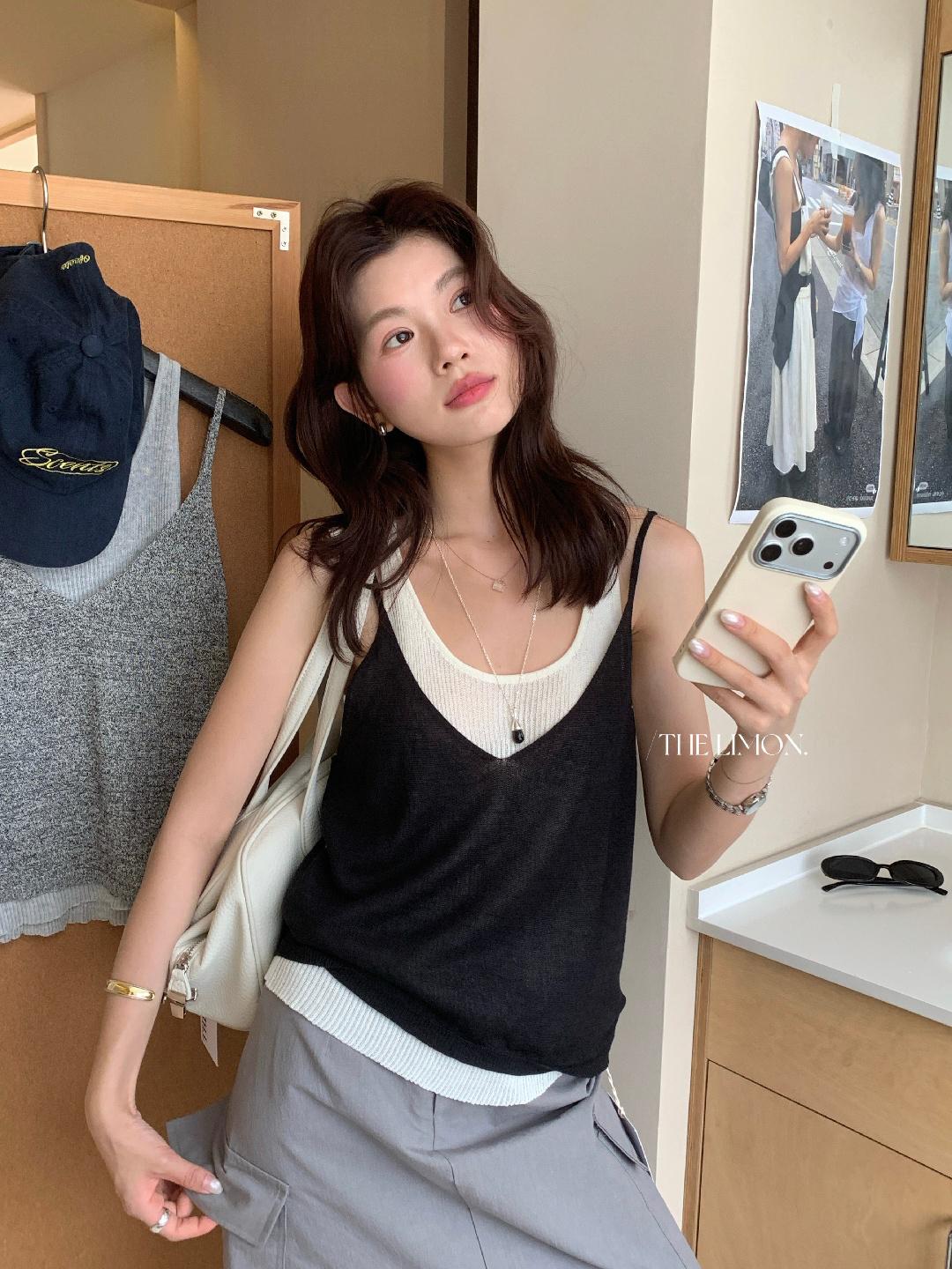 【C9306】撞色慵懶寬鬆V領背心+疊穿吊帶兩件套套裝(只賣套裝)