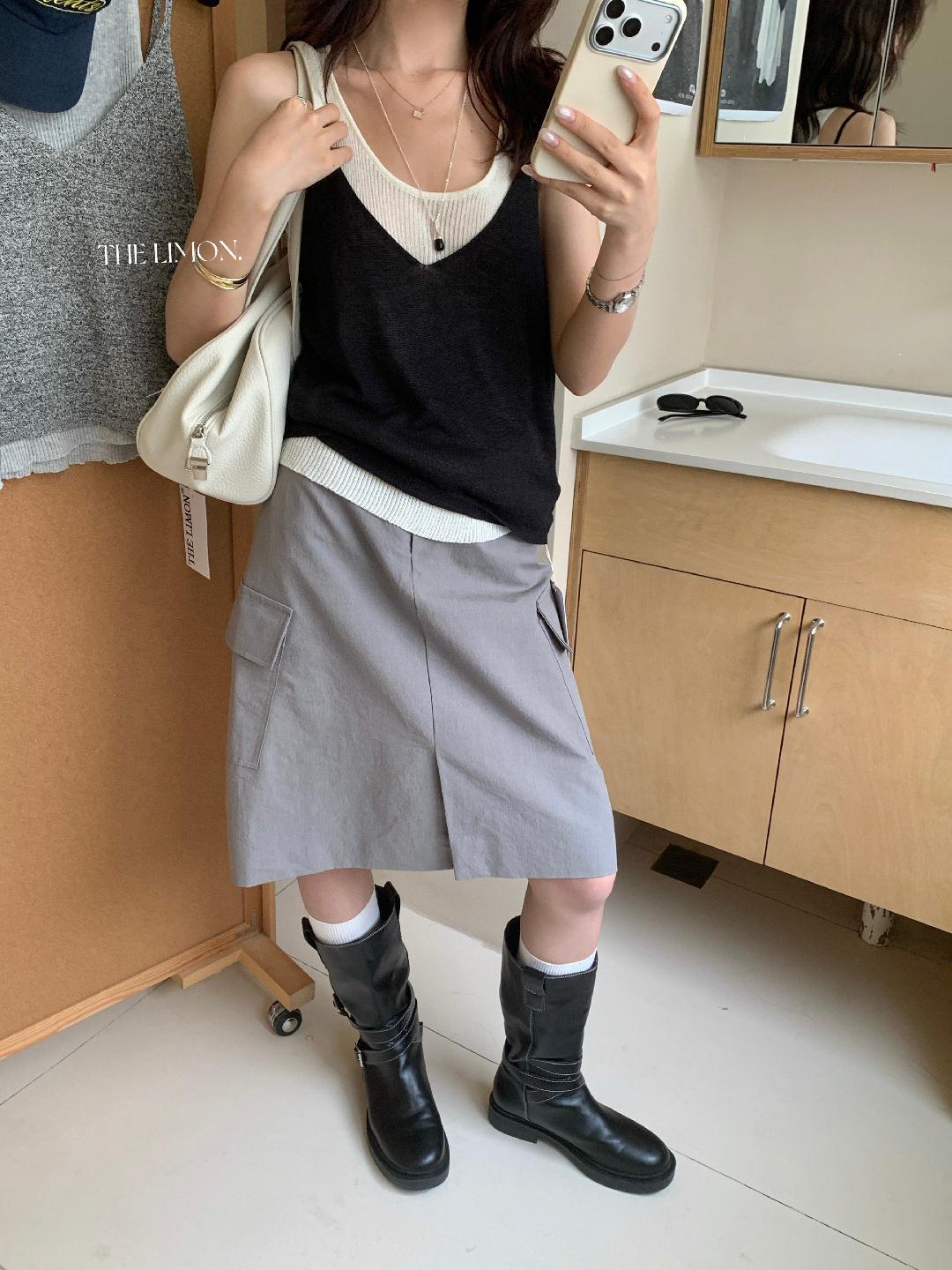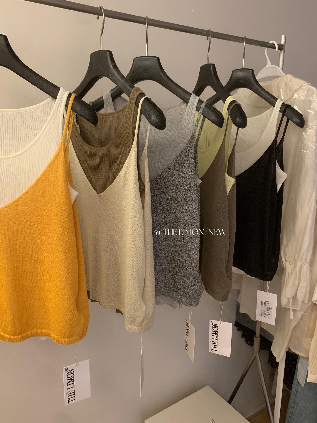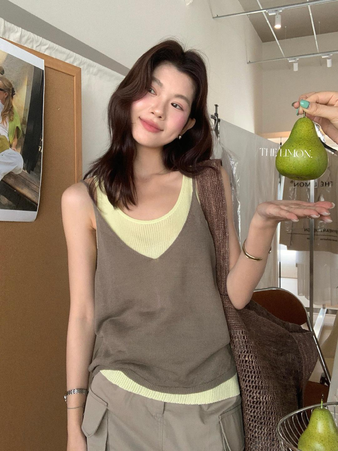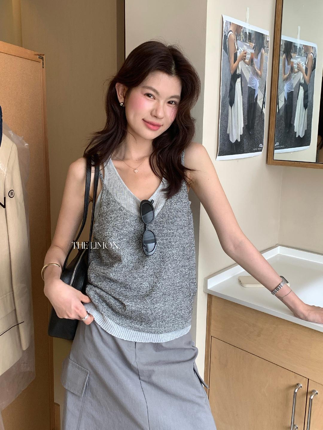 【C9306】撞色慵懶寬鬆V領背心+疊穿吊帶兩件套套裝(只賣套裝)