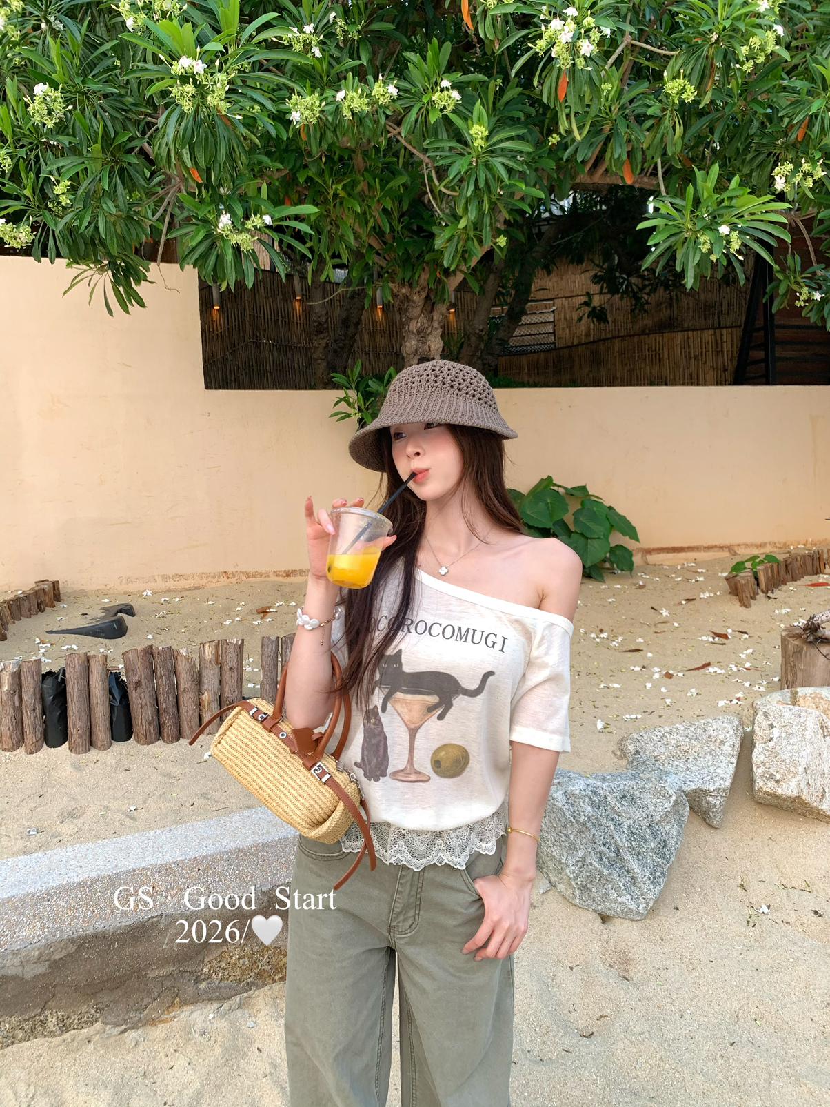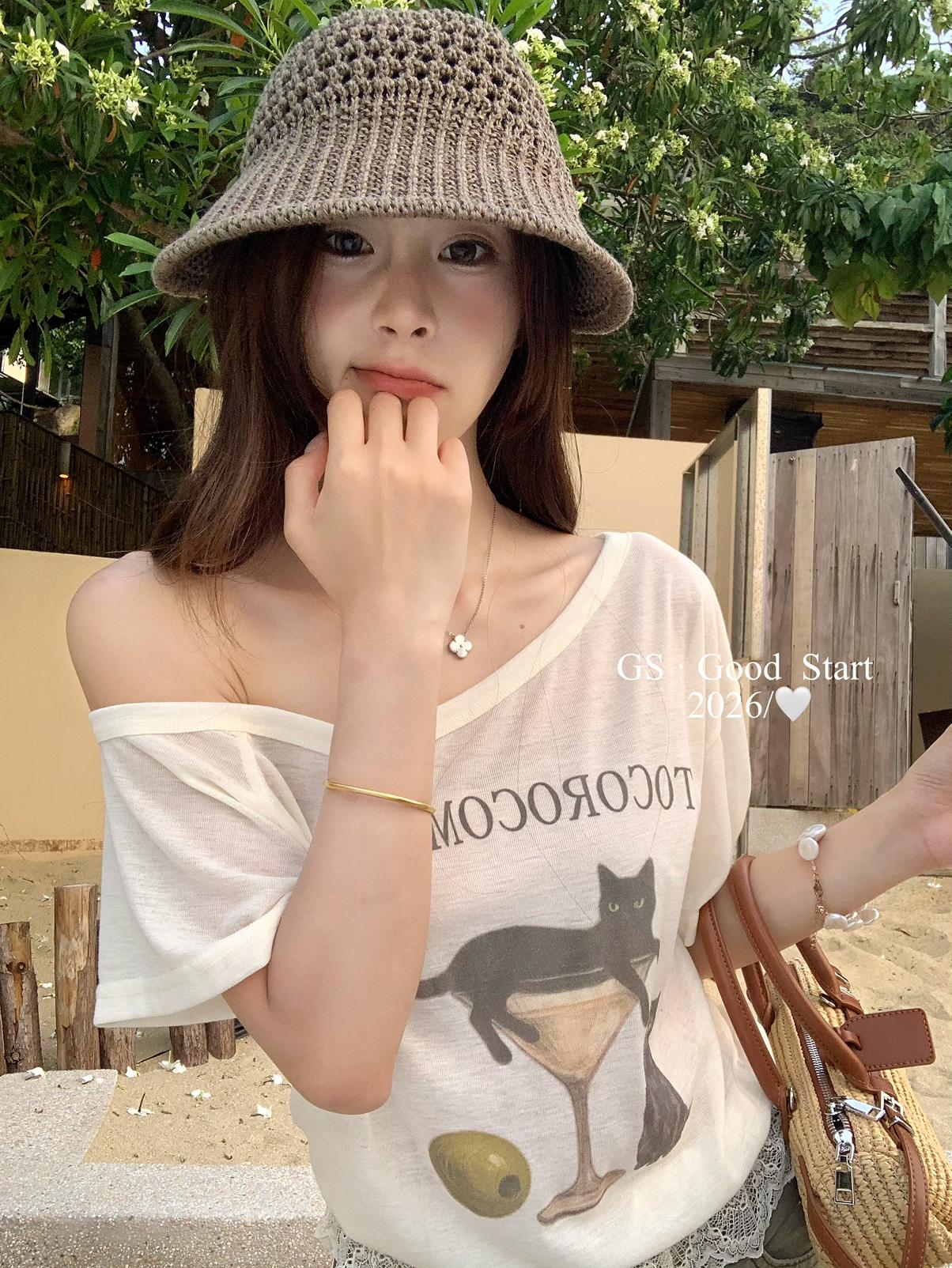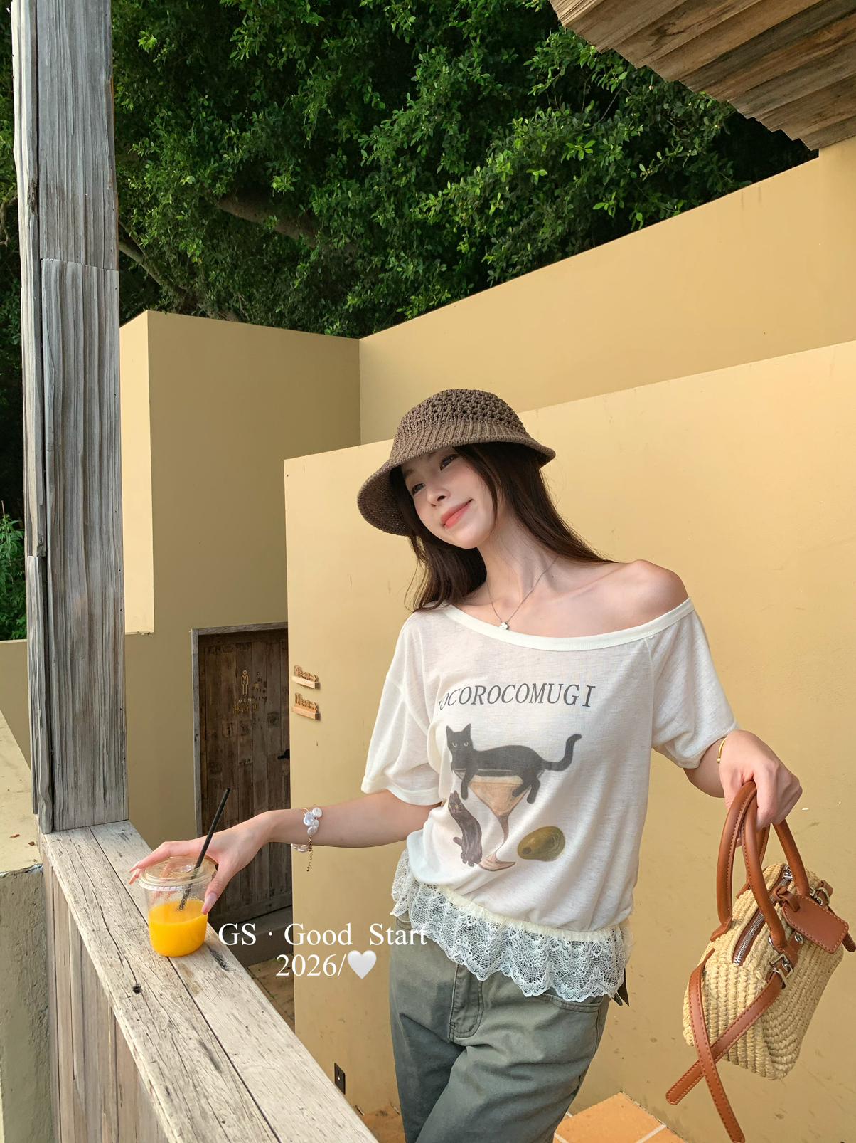 【C9314】韓網流量*小黑貓印花_秒變IG時髦精!夏季趣味印花蕾絲拼接短袖T恤