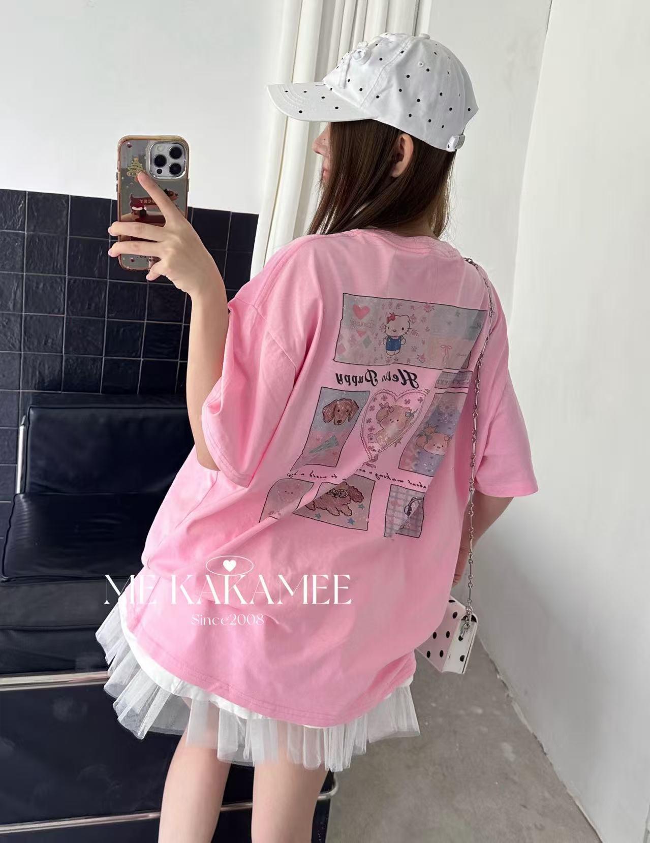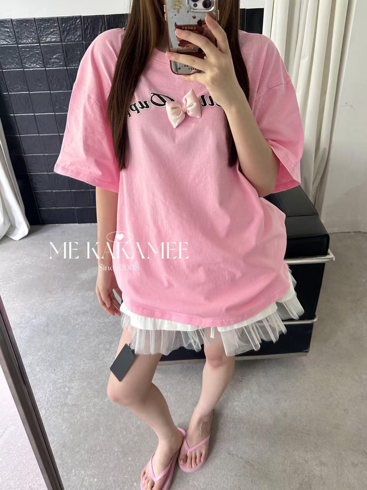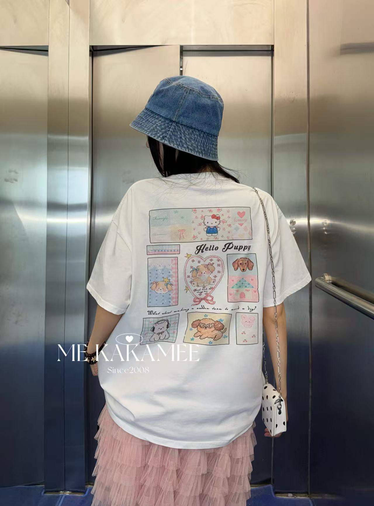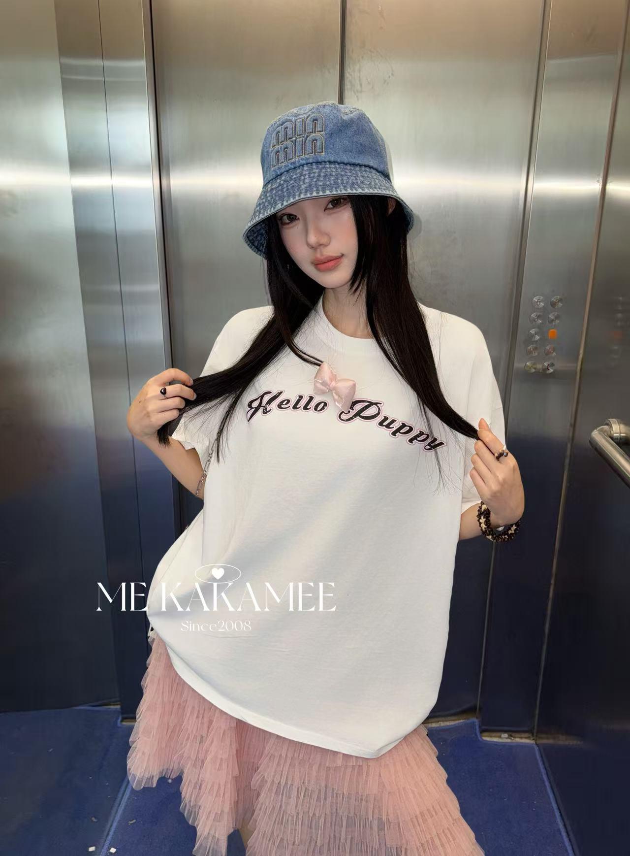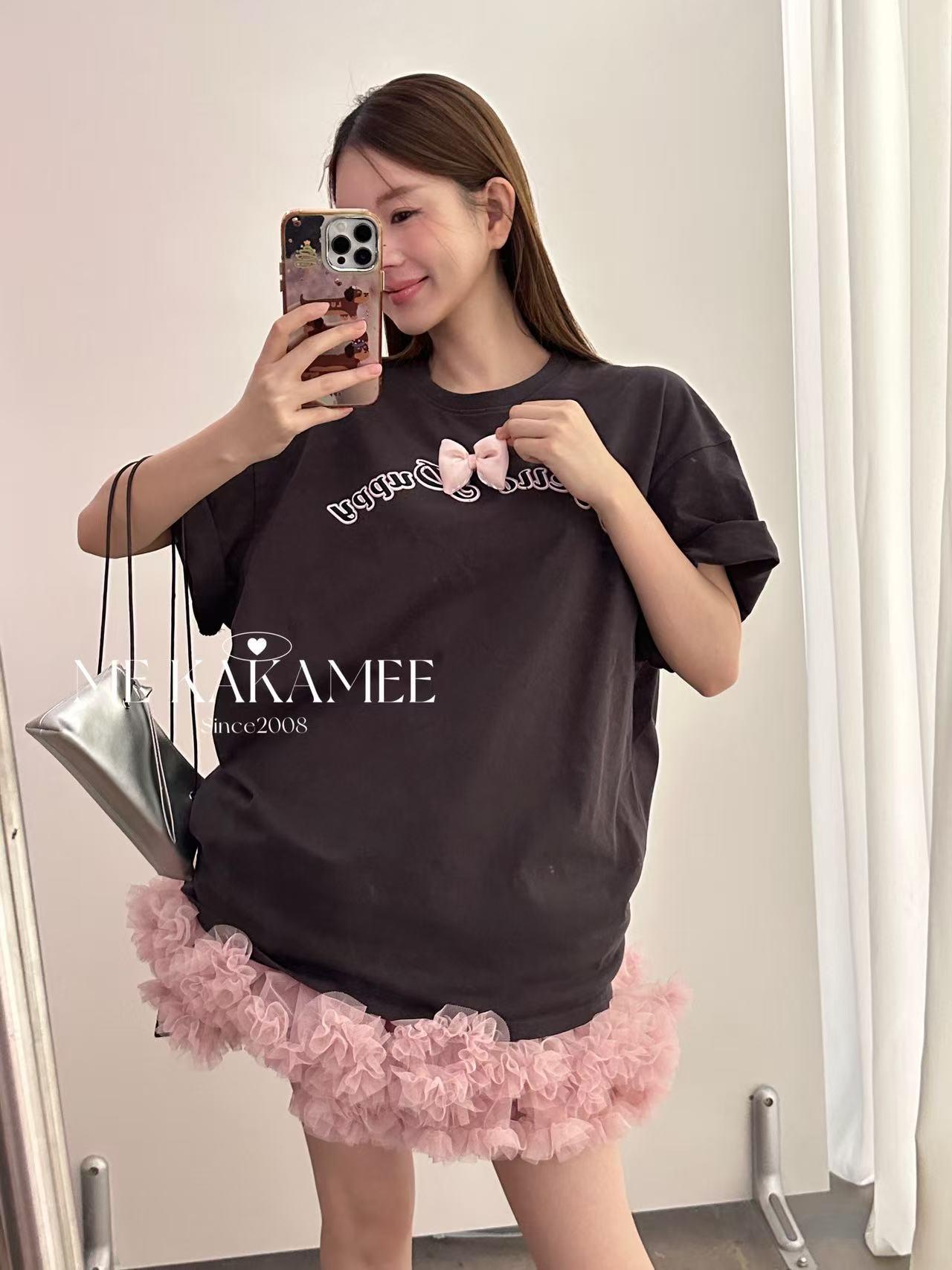 【C9319】夏新品設計感後背噴畫趣味小狗字母大版短袖T恤(配可拆卸蝴蝶結)(不配腰包)