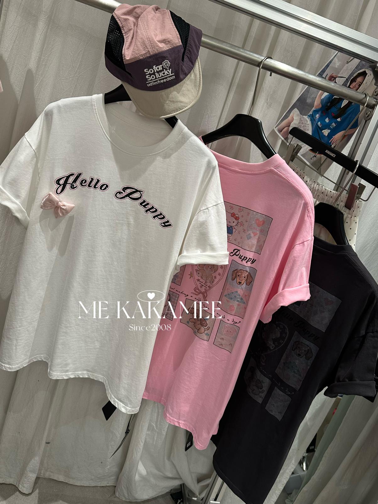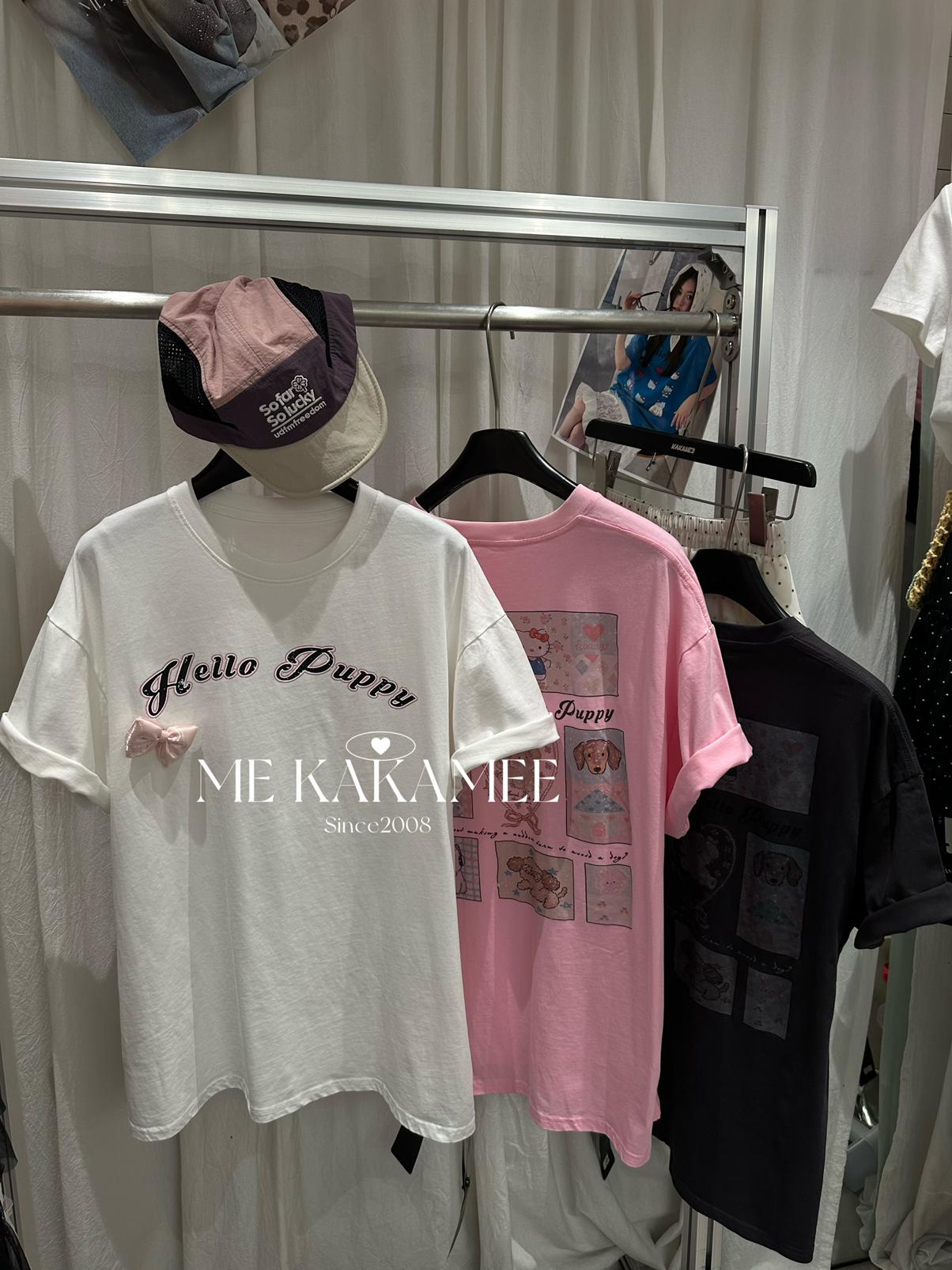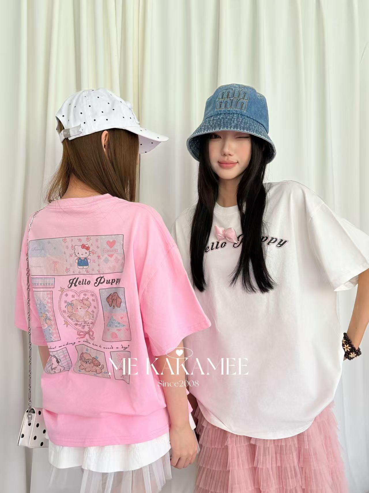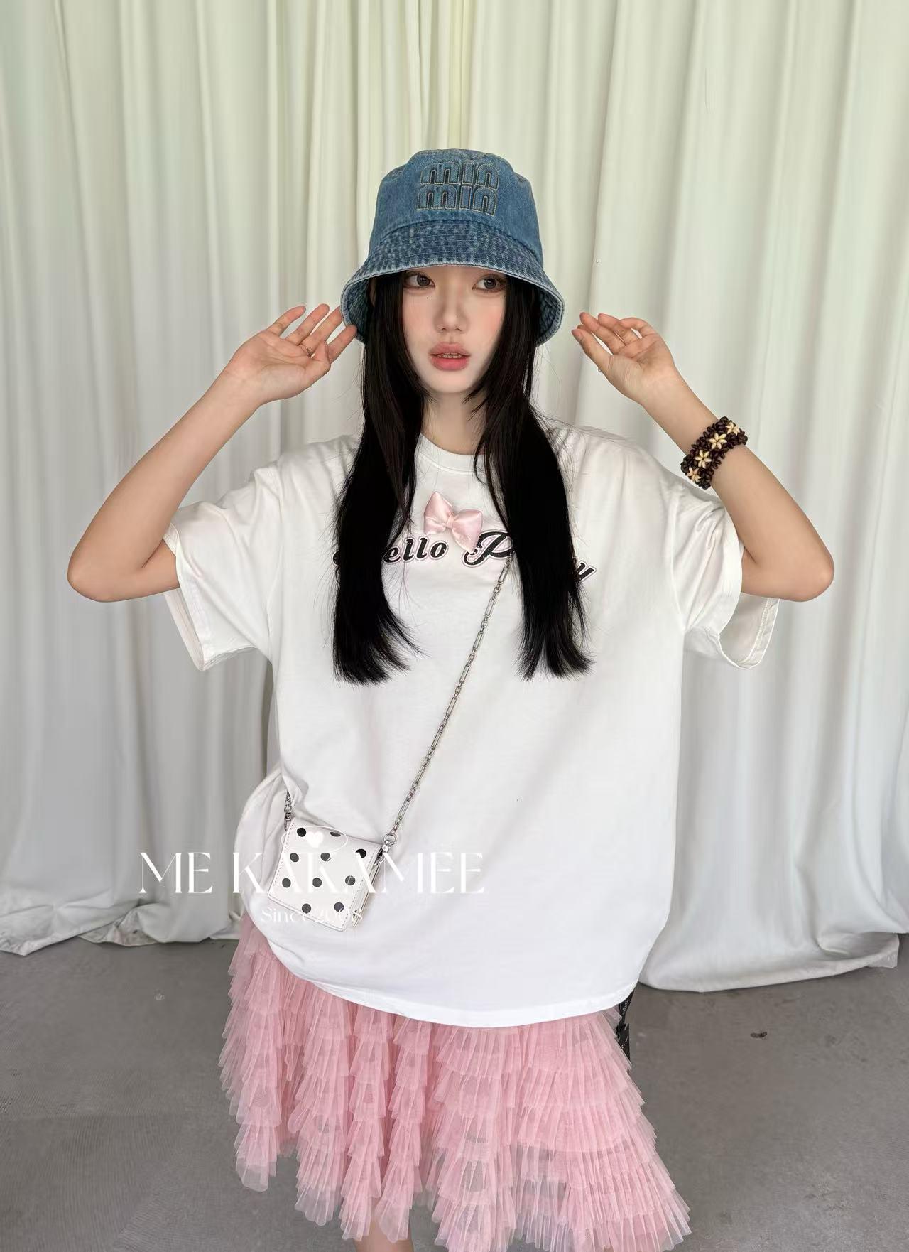 【C9319】夏新品設計感後背噴畫趣味小狗字母大版短袖T恤(配可拆卸蝴蝶結)(不配腰包)