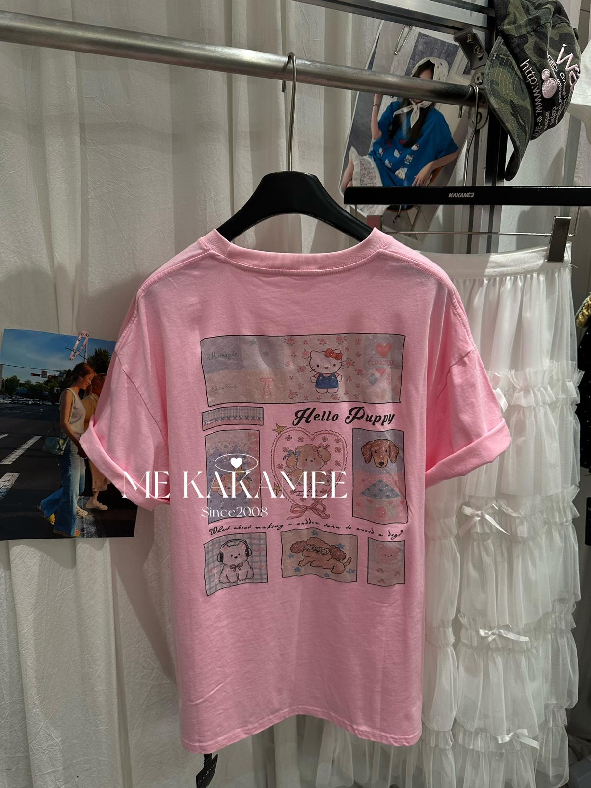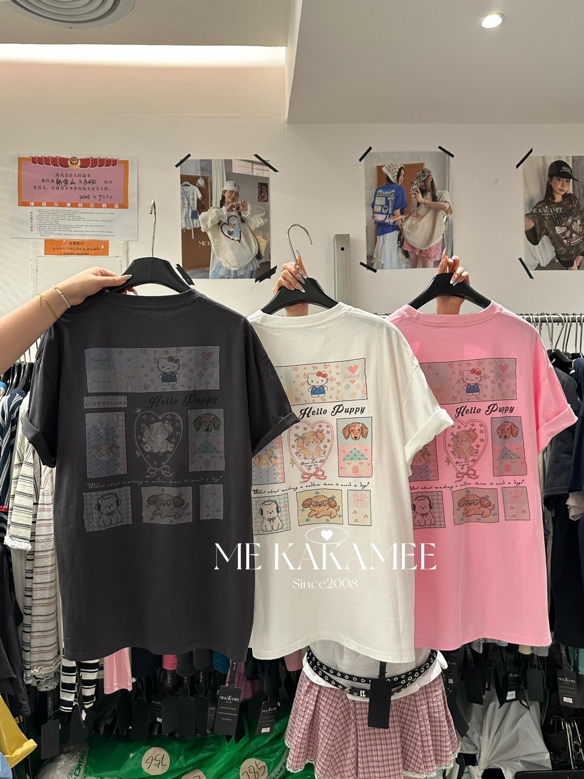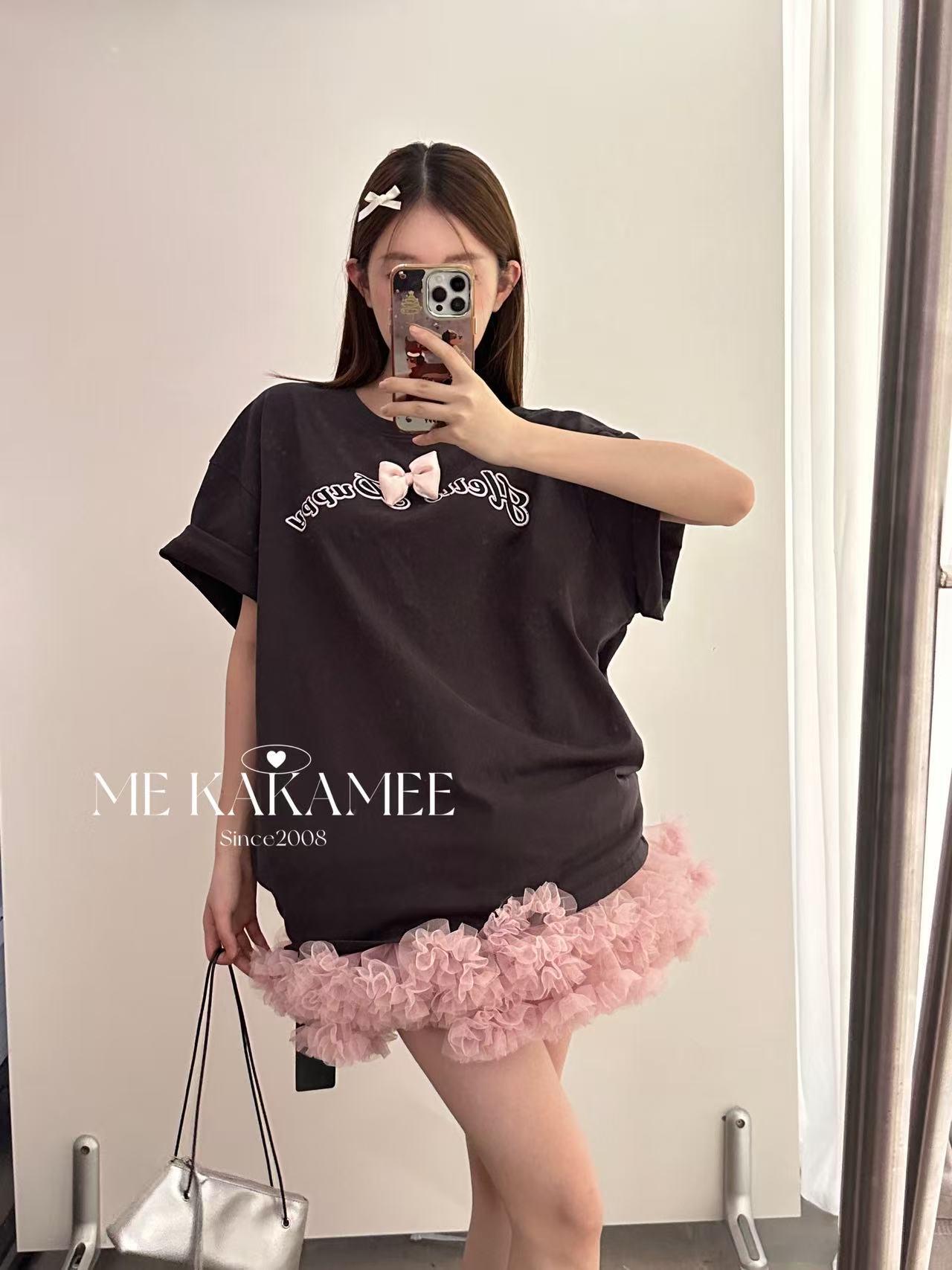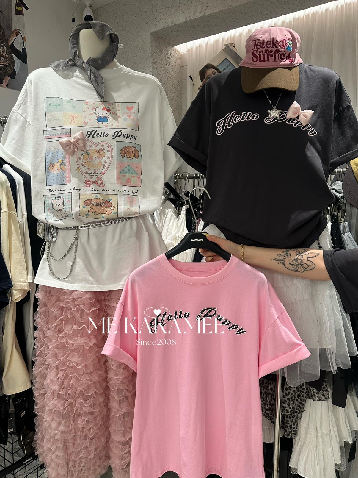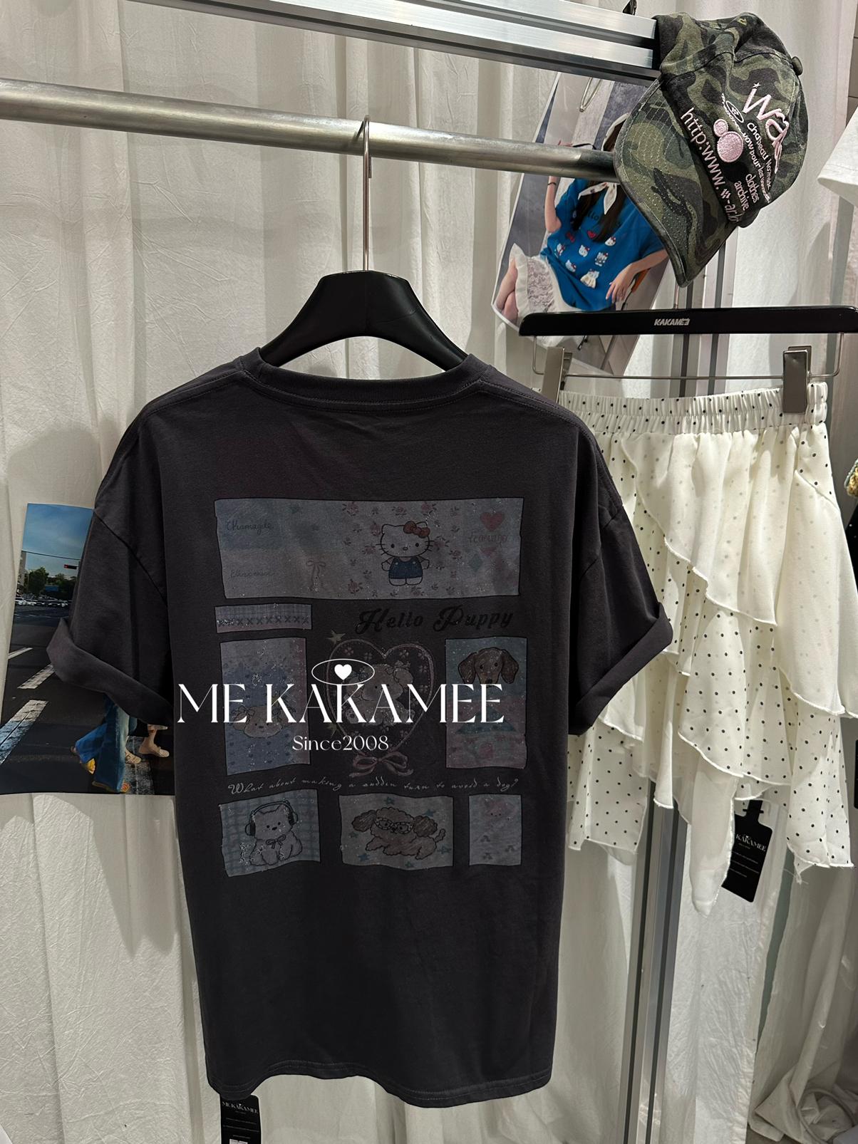 【C9319】夏新品設計感後背噴畫趣味小狗字母大版短袖T恤(配可拆卸蝴蝶結)(不配腰包)