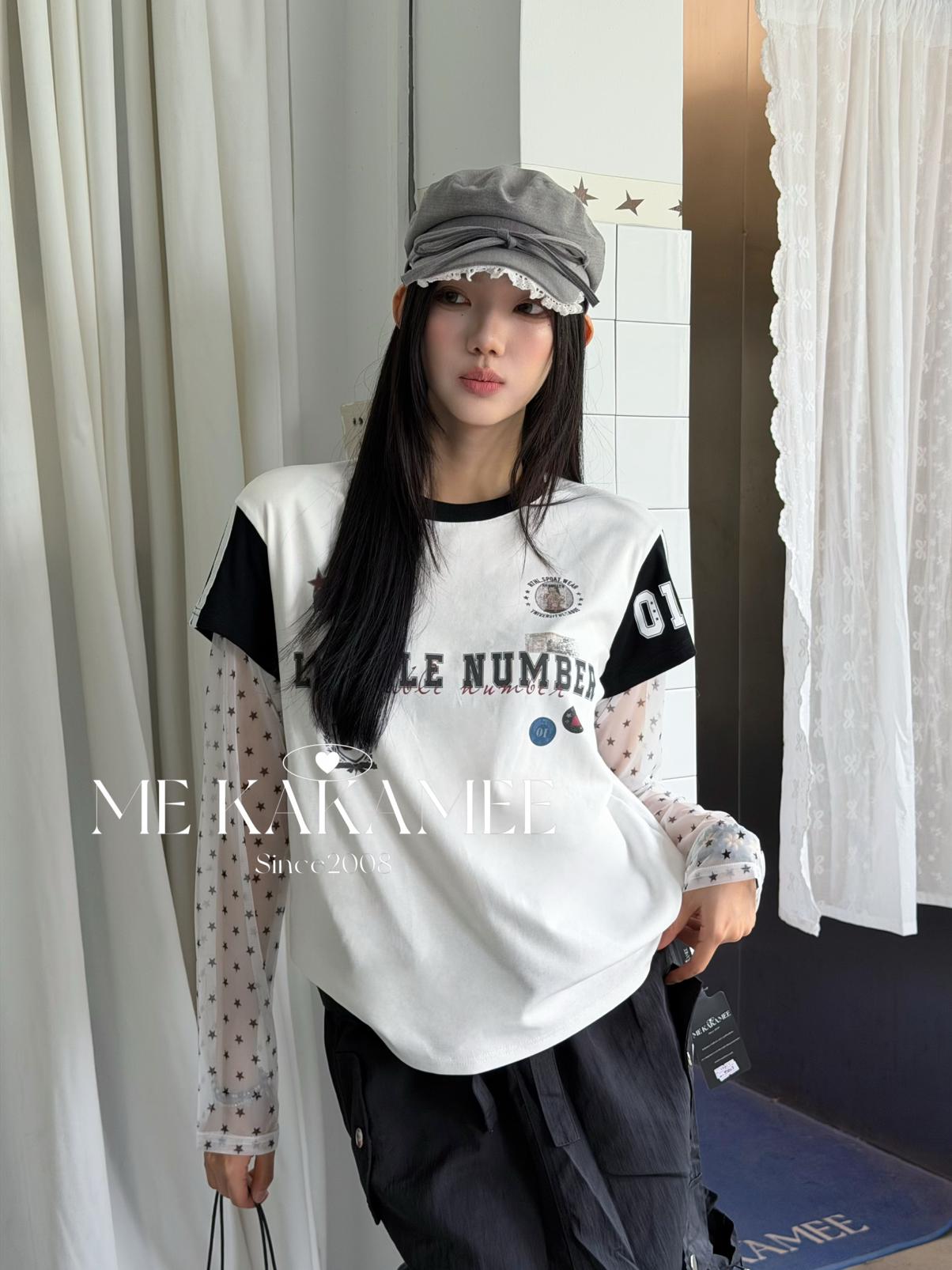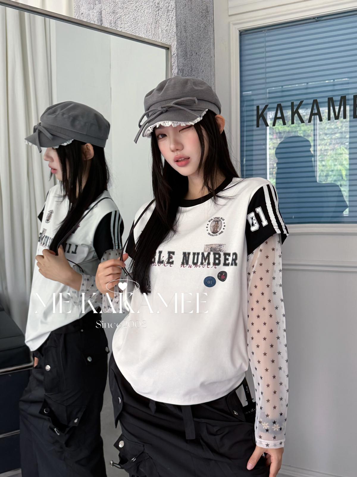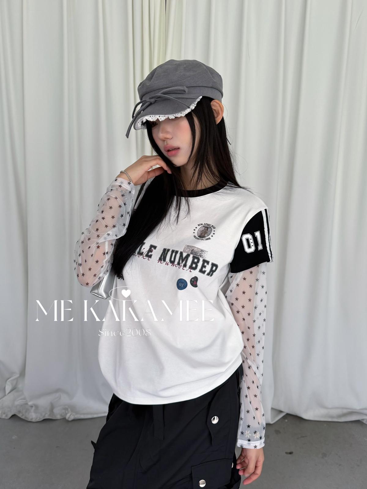 【C9320】夏新品美式復古假兩件星星網紗拼接防曬袖長袖T恤(只賣T恤)