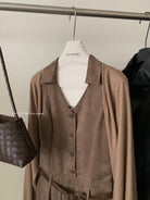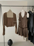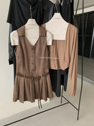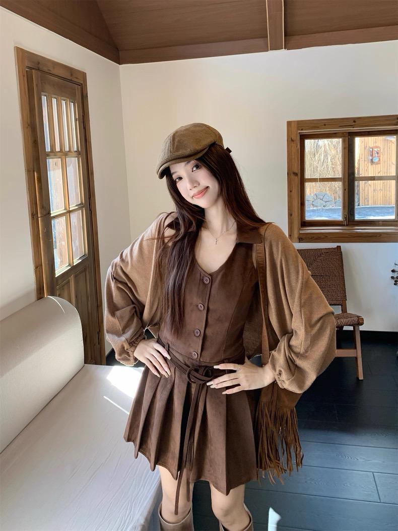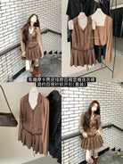 3. 【C7350】焦糖摩卡麂皮掛脖百褶顯瘦連衣裙+簡約百搭針織開衫套裝(配腰帶)