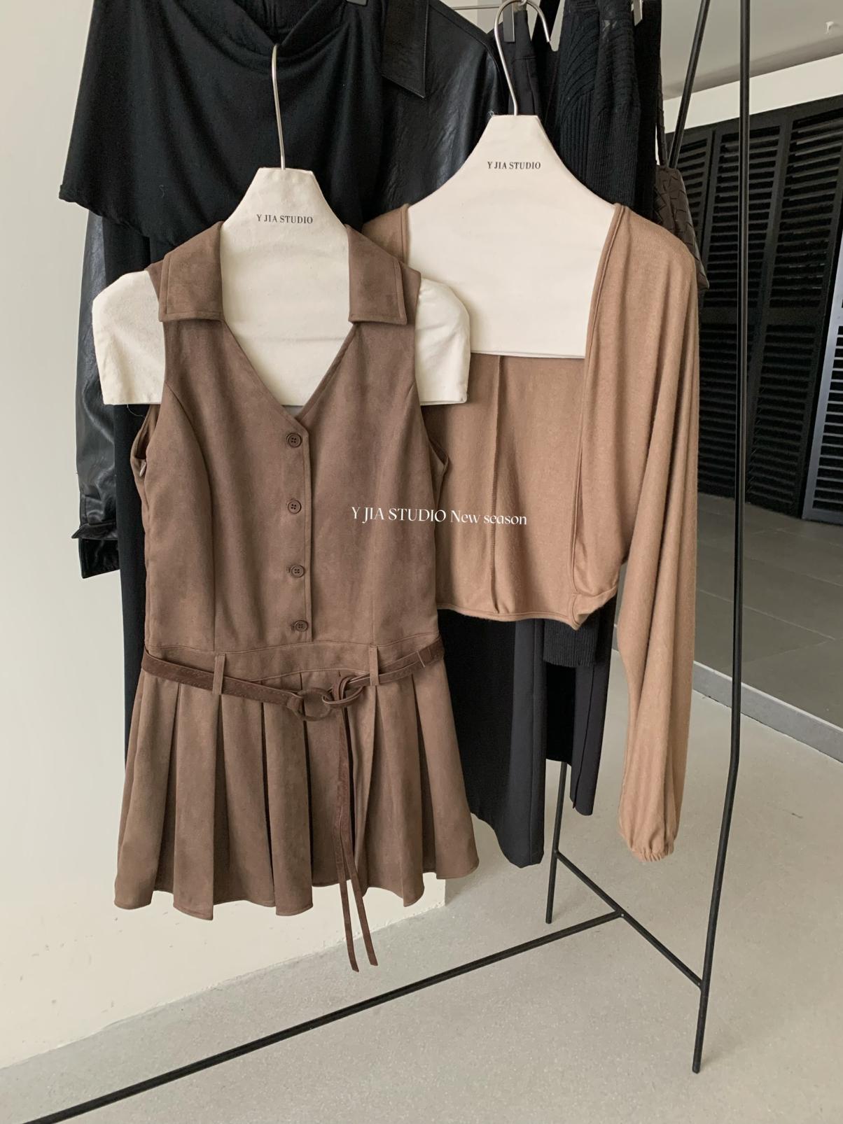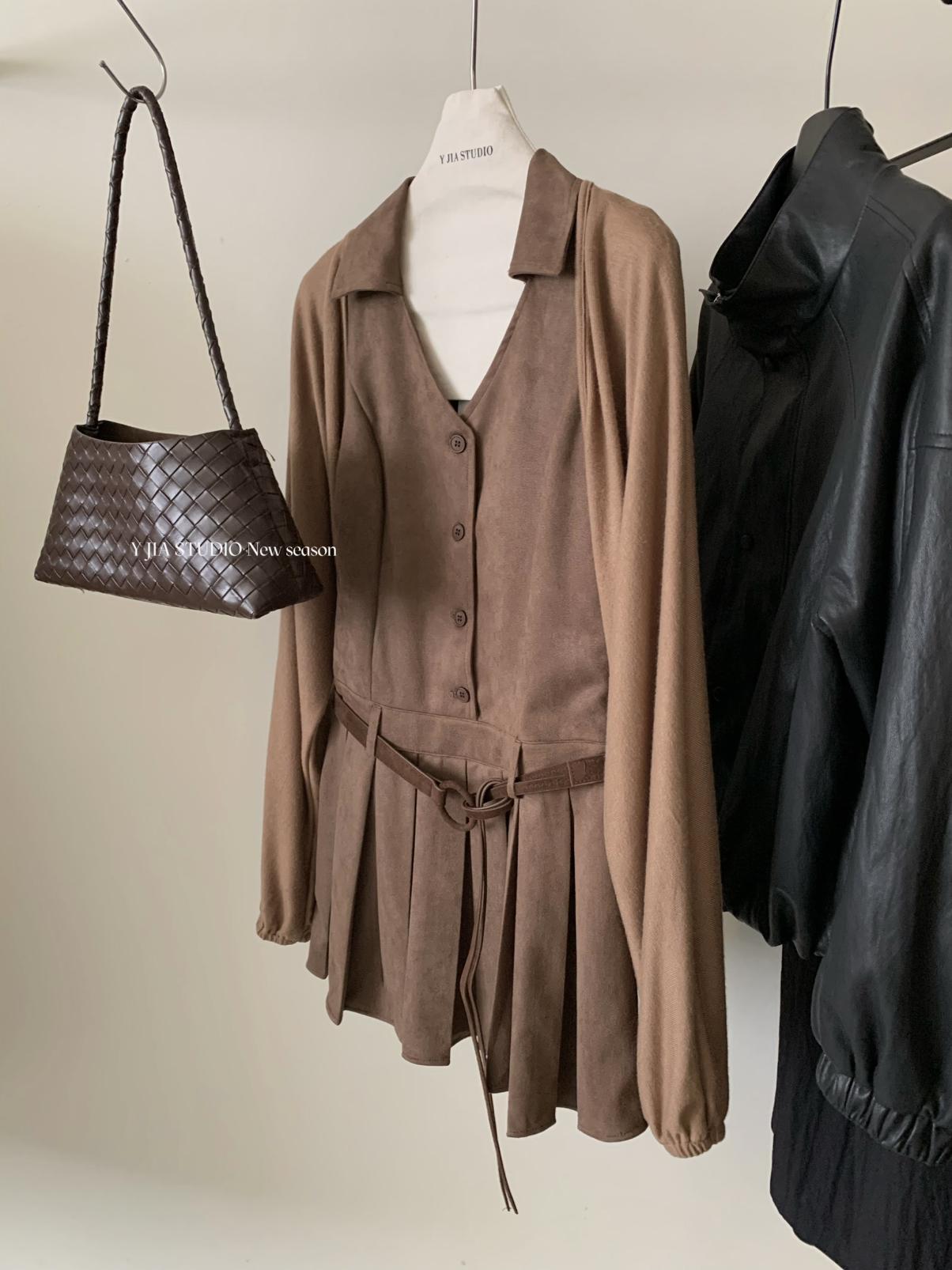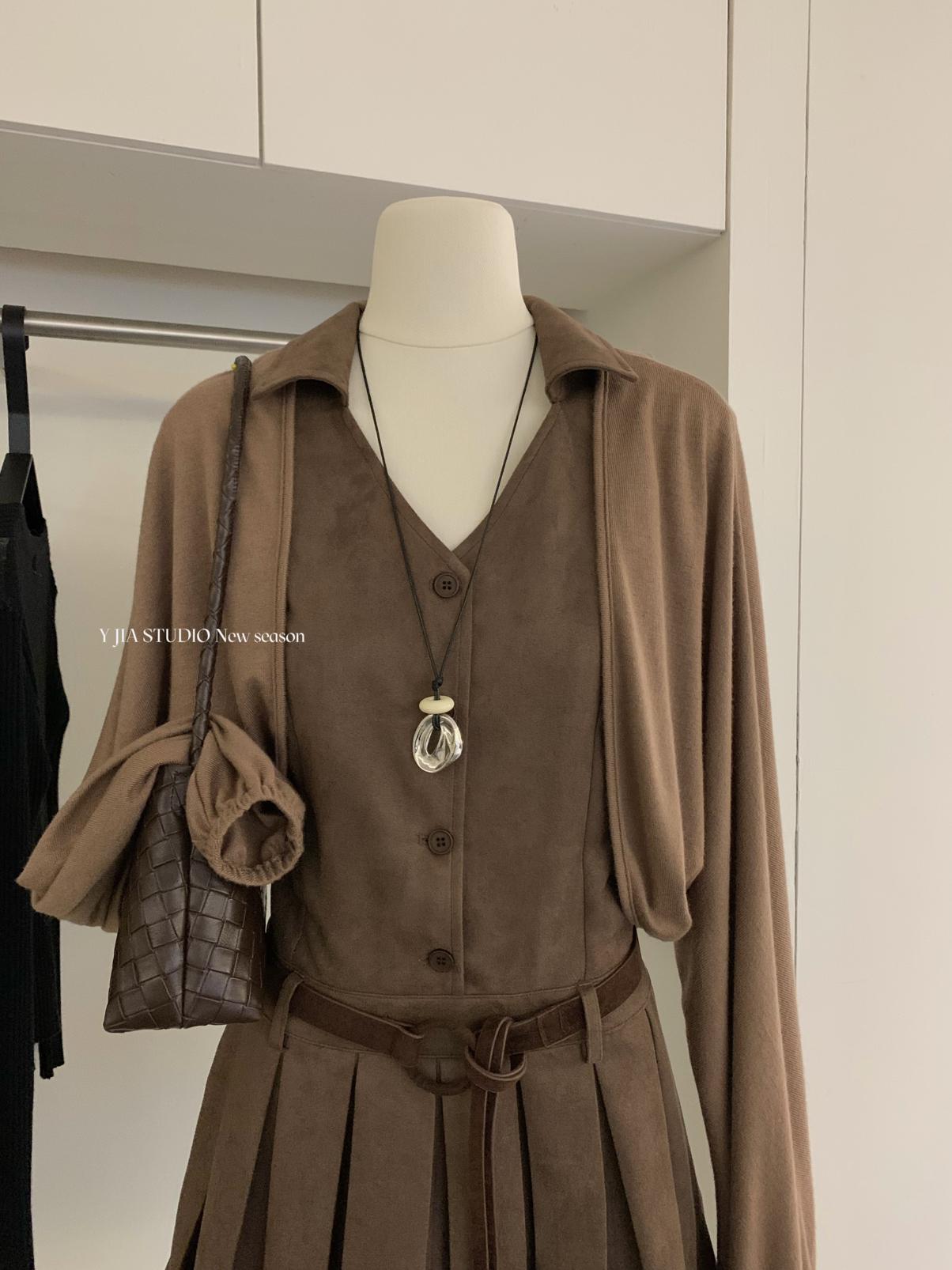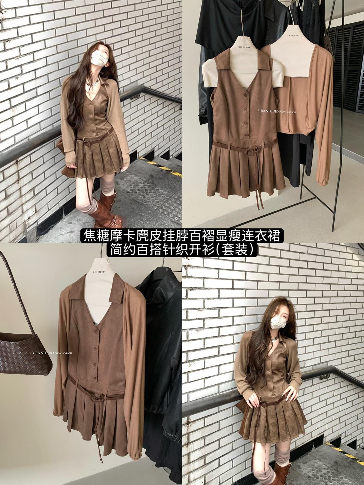 【C7350】焦糖摩卡麂皮掛脖百褶顯瘦連衣裙+簡約百搭針織開衫套裝(配腰帶)