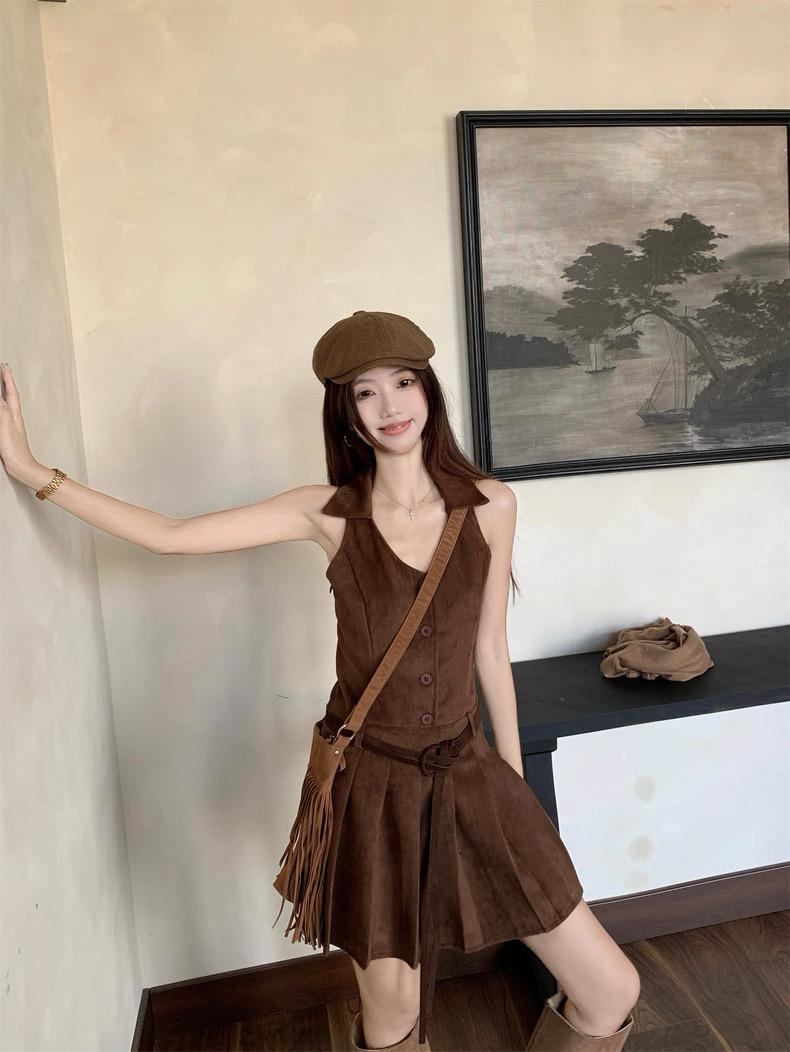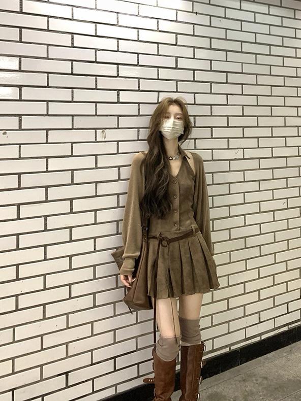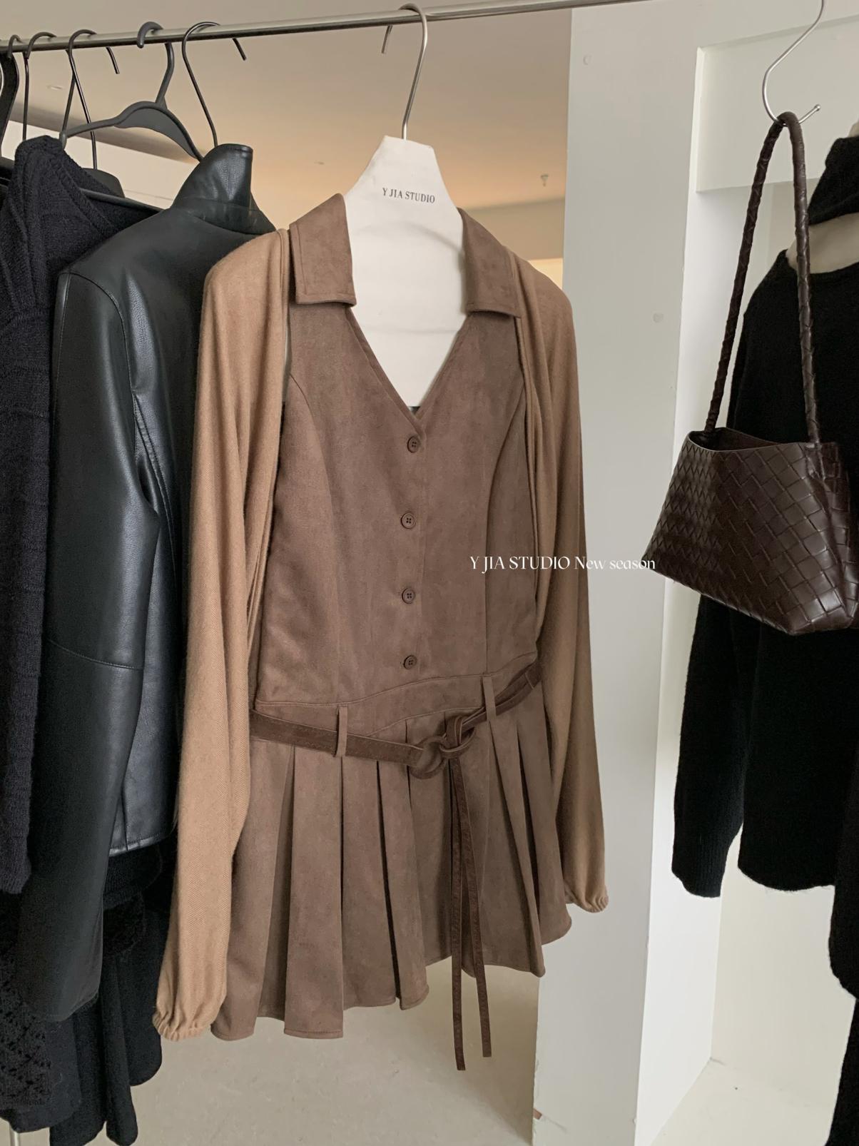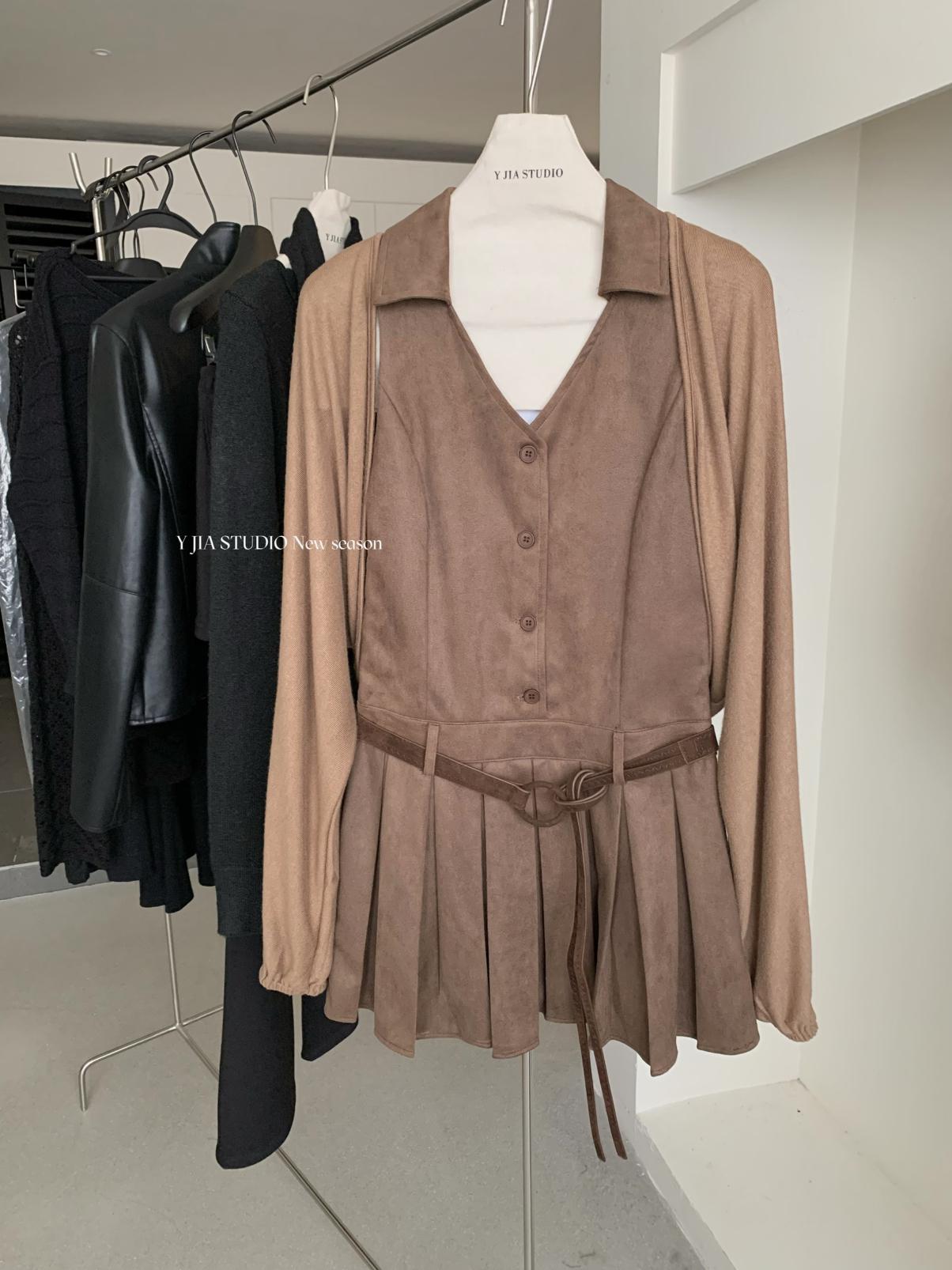 【C7350】焦糖摩卡麂皮掛脖百褶顯瘦連衣裙+簡約百搭針織開衫套裝(配腰帶)