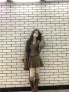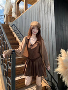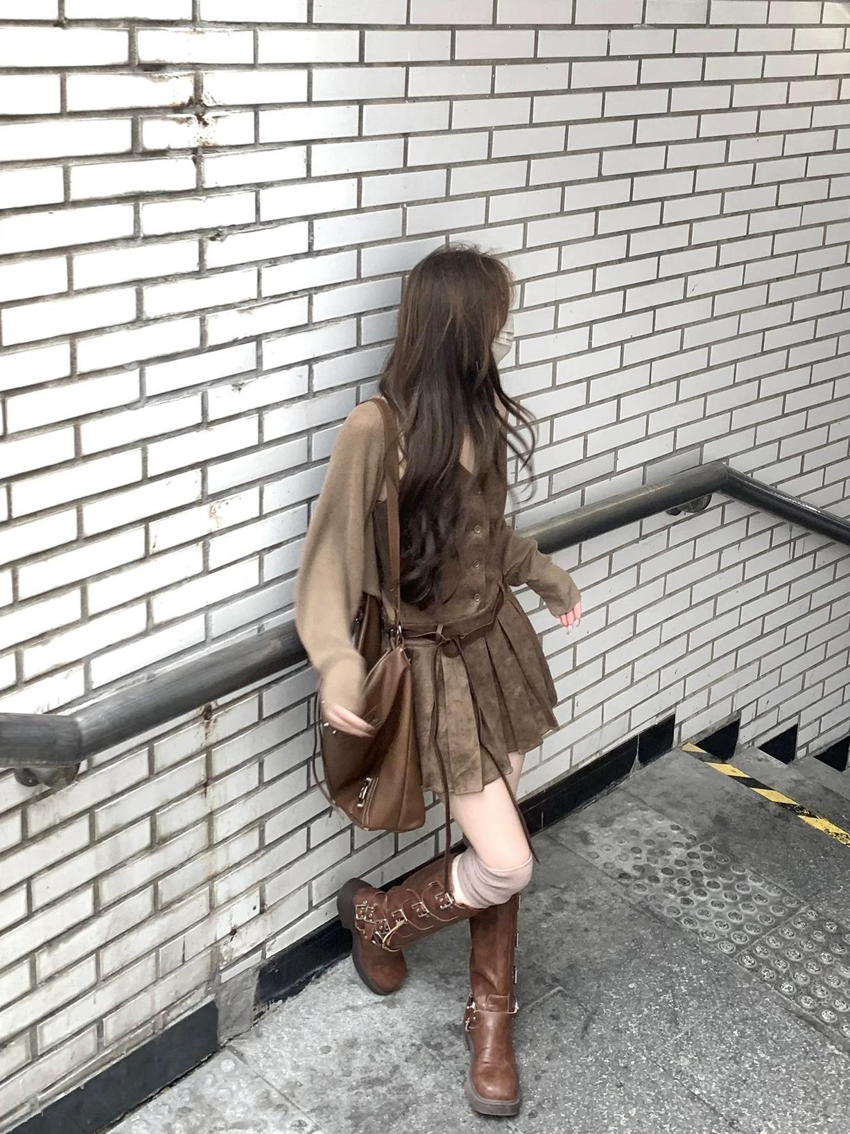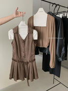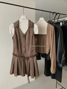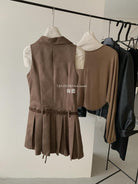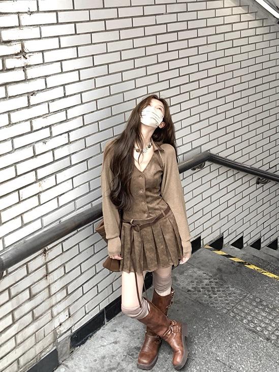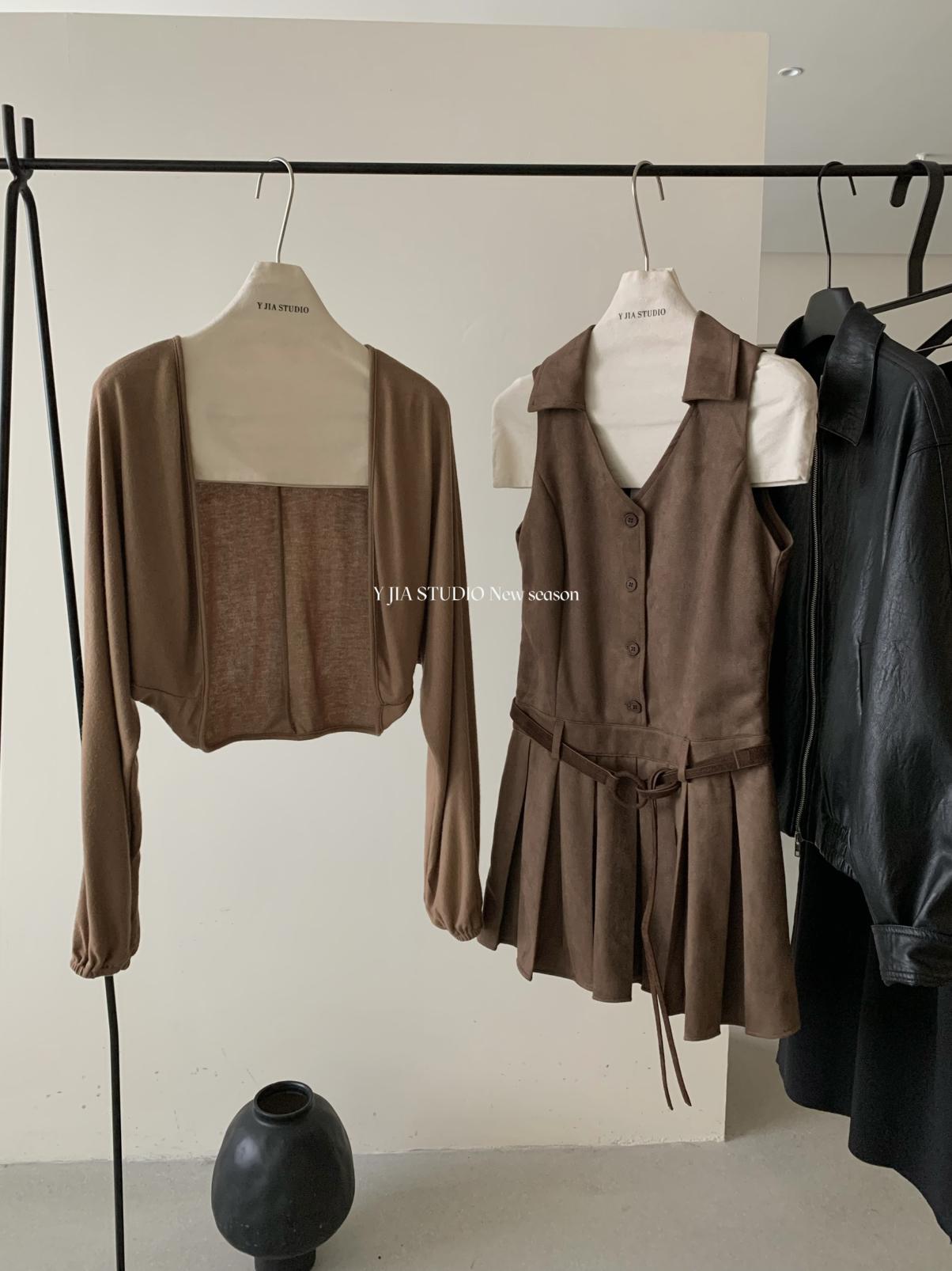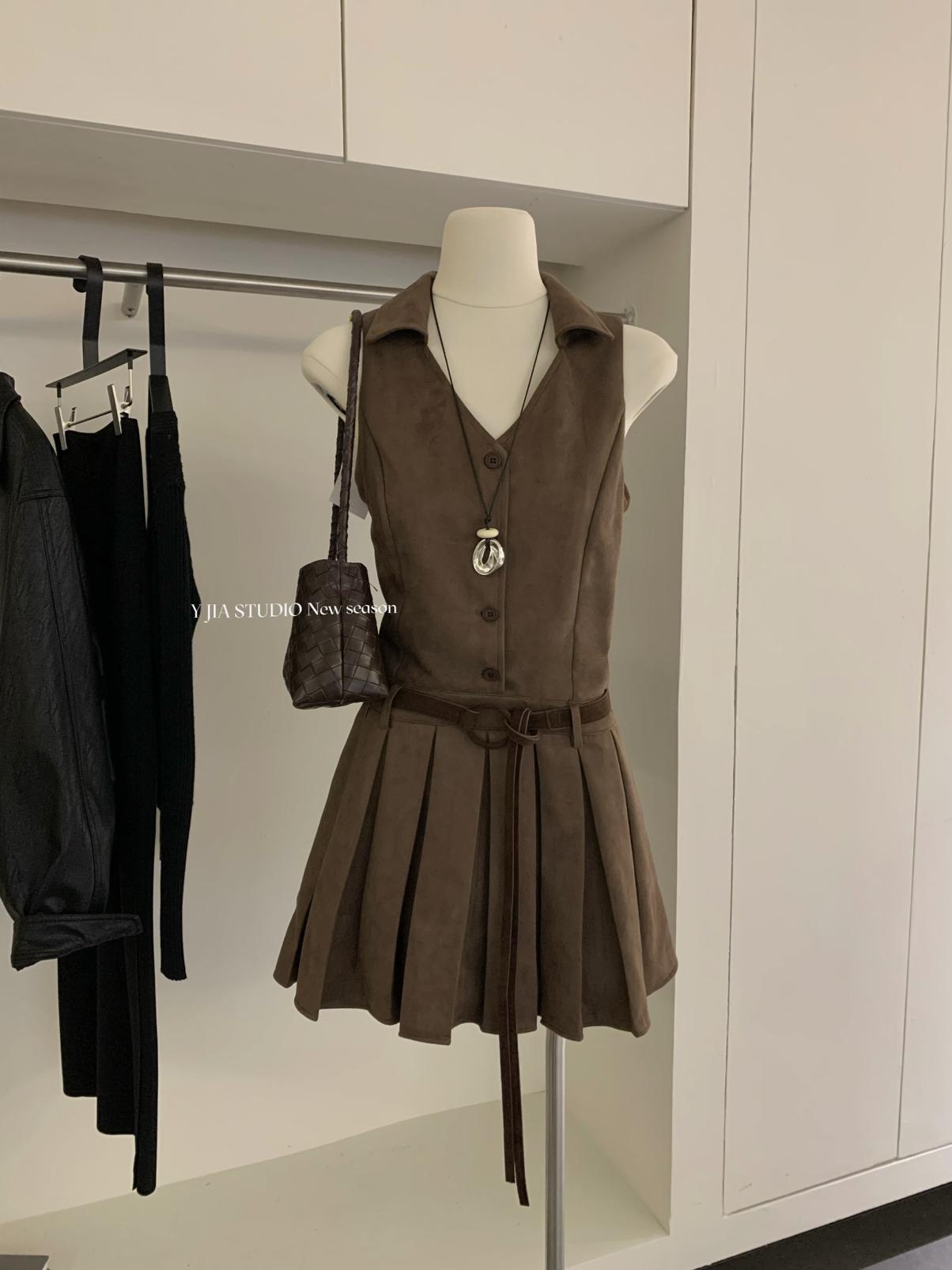【C7350】焦糖摩卡麂皮掛脖百褶顯瘦連衣裙+簡約百搭針織開衫套裝(配腰帶)
