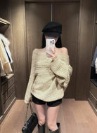【C7668】洋氣百搭純色慵懶鬆弛一字領露肩提花肌理感寬鬆加厚長袖針織保暖毛衣