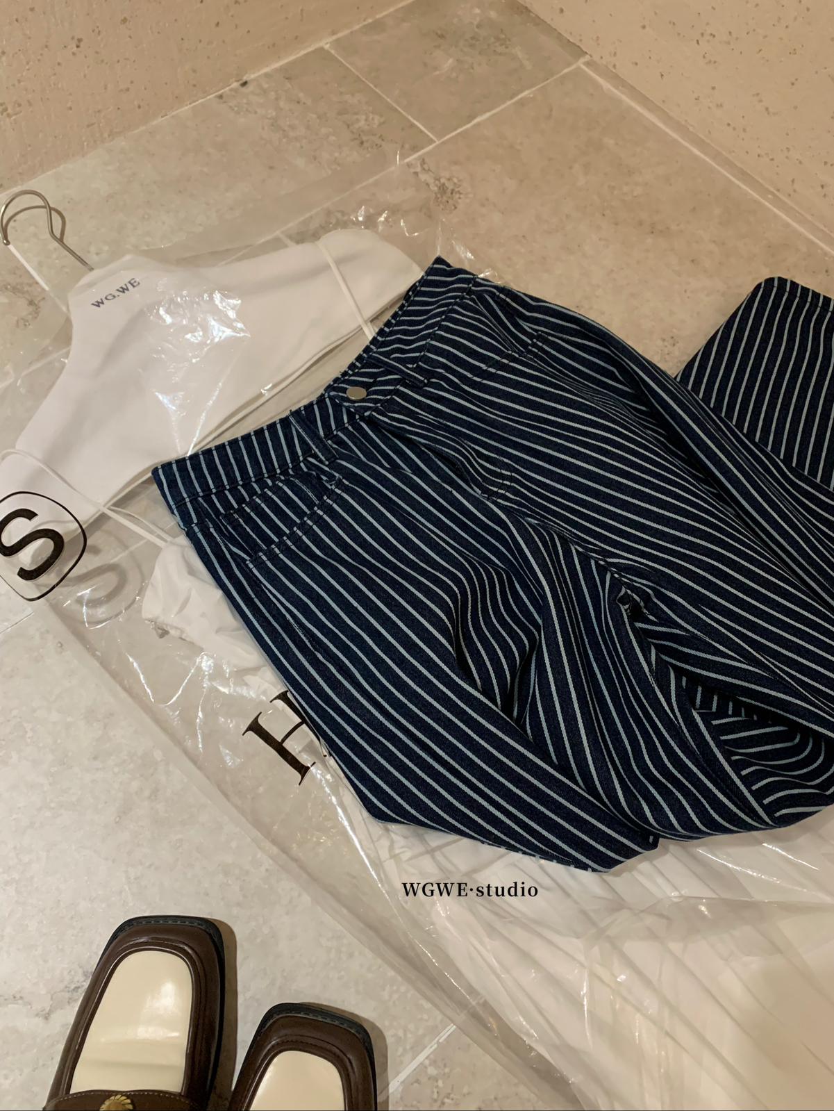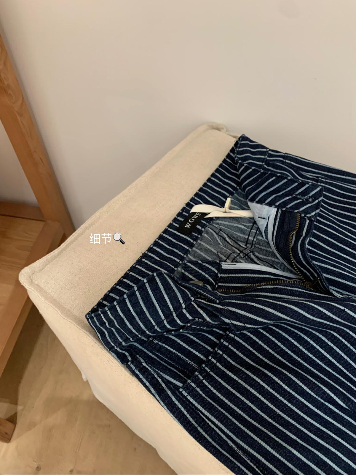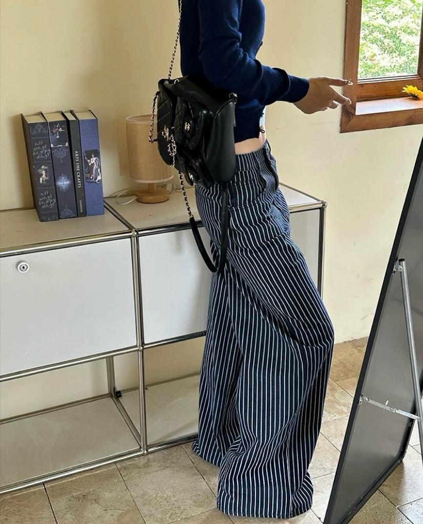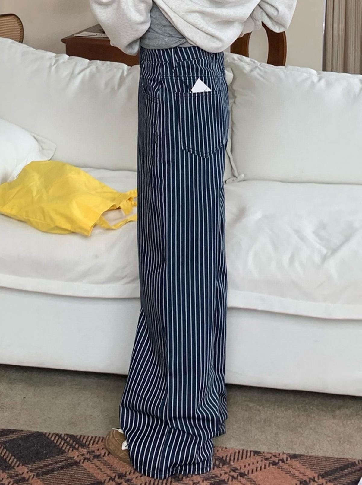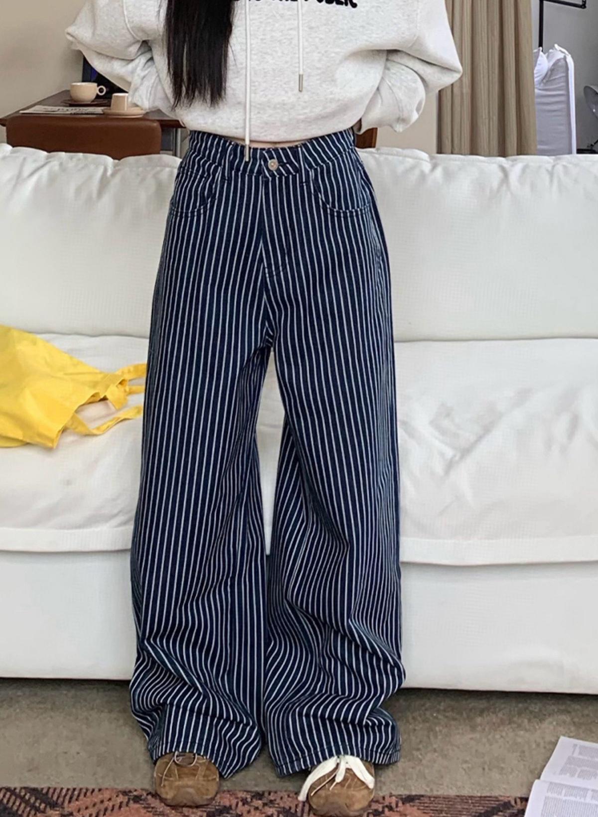 3. 【C7711】復古藍白條紋闊腿牛仔褲女設計感休閒直筒拖地褲牛仔褲
