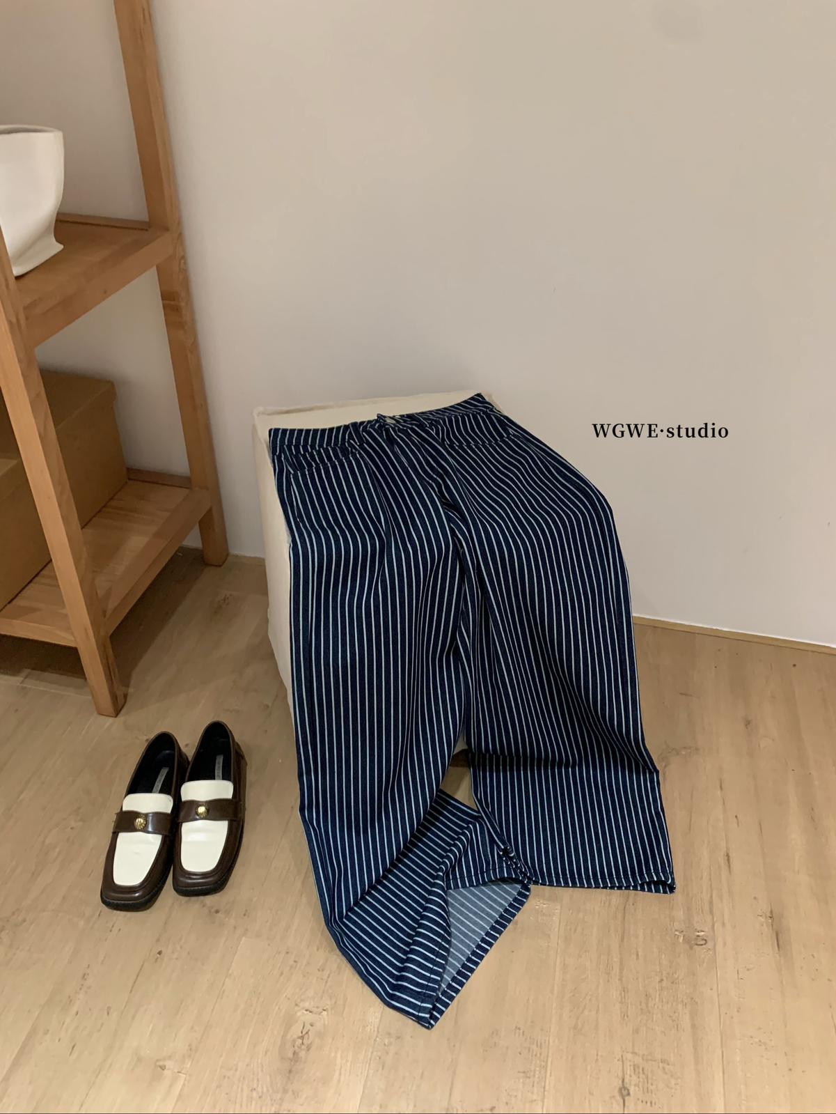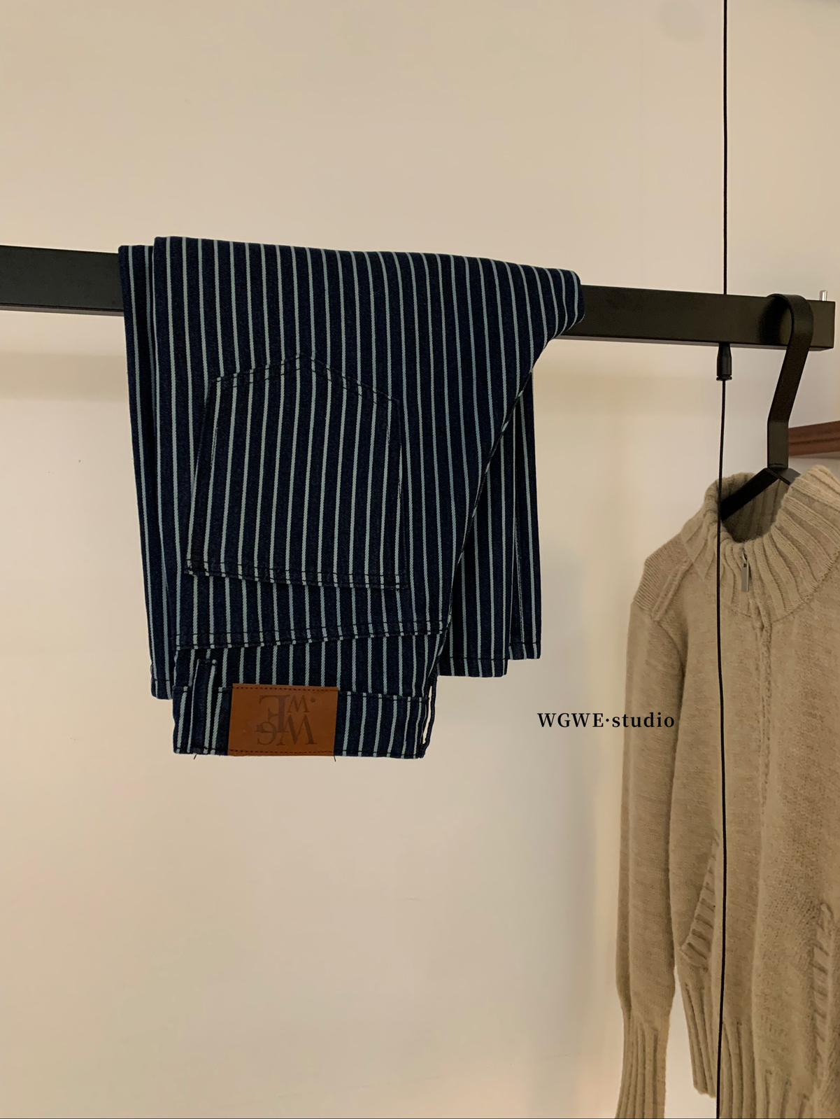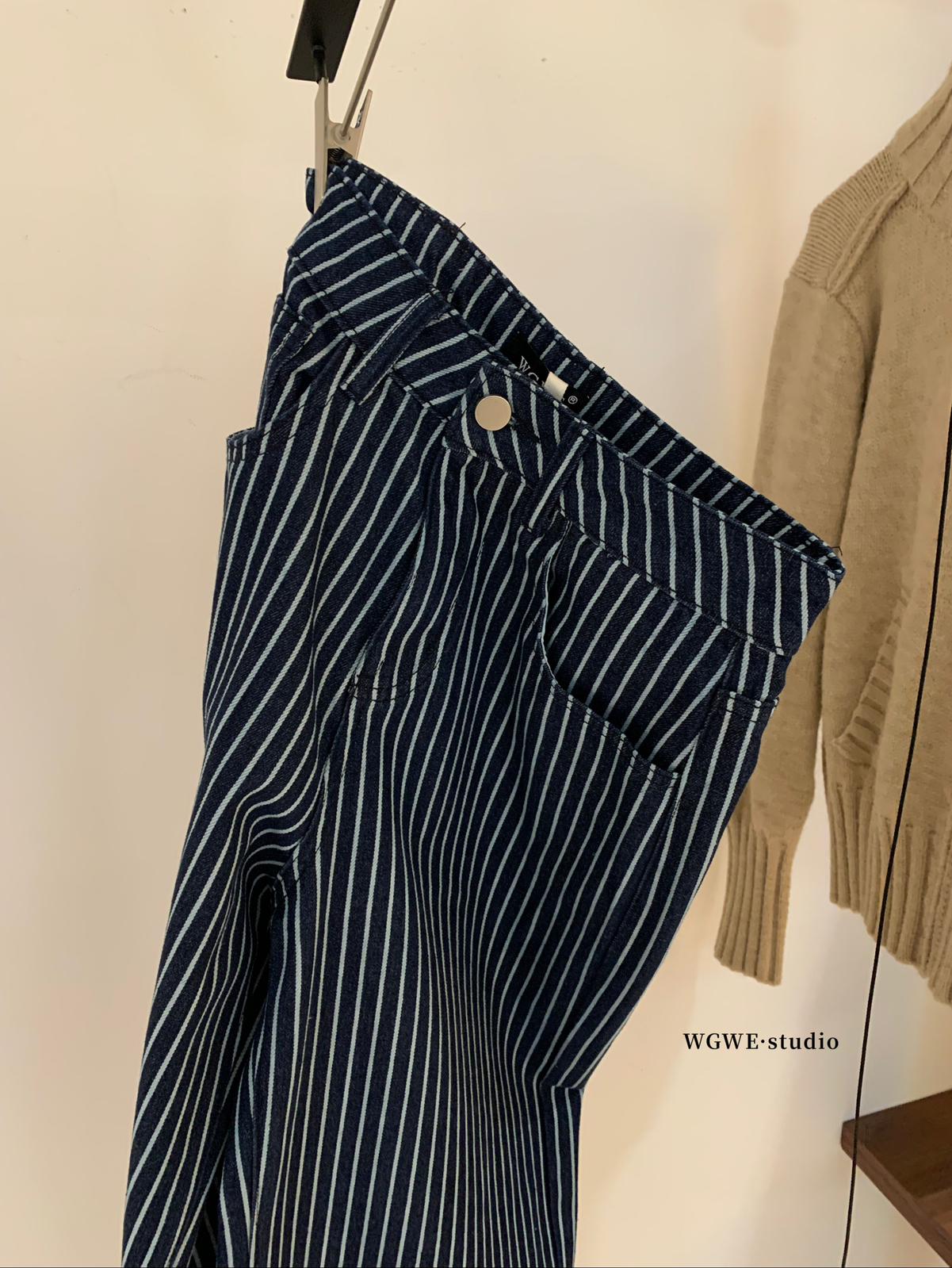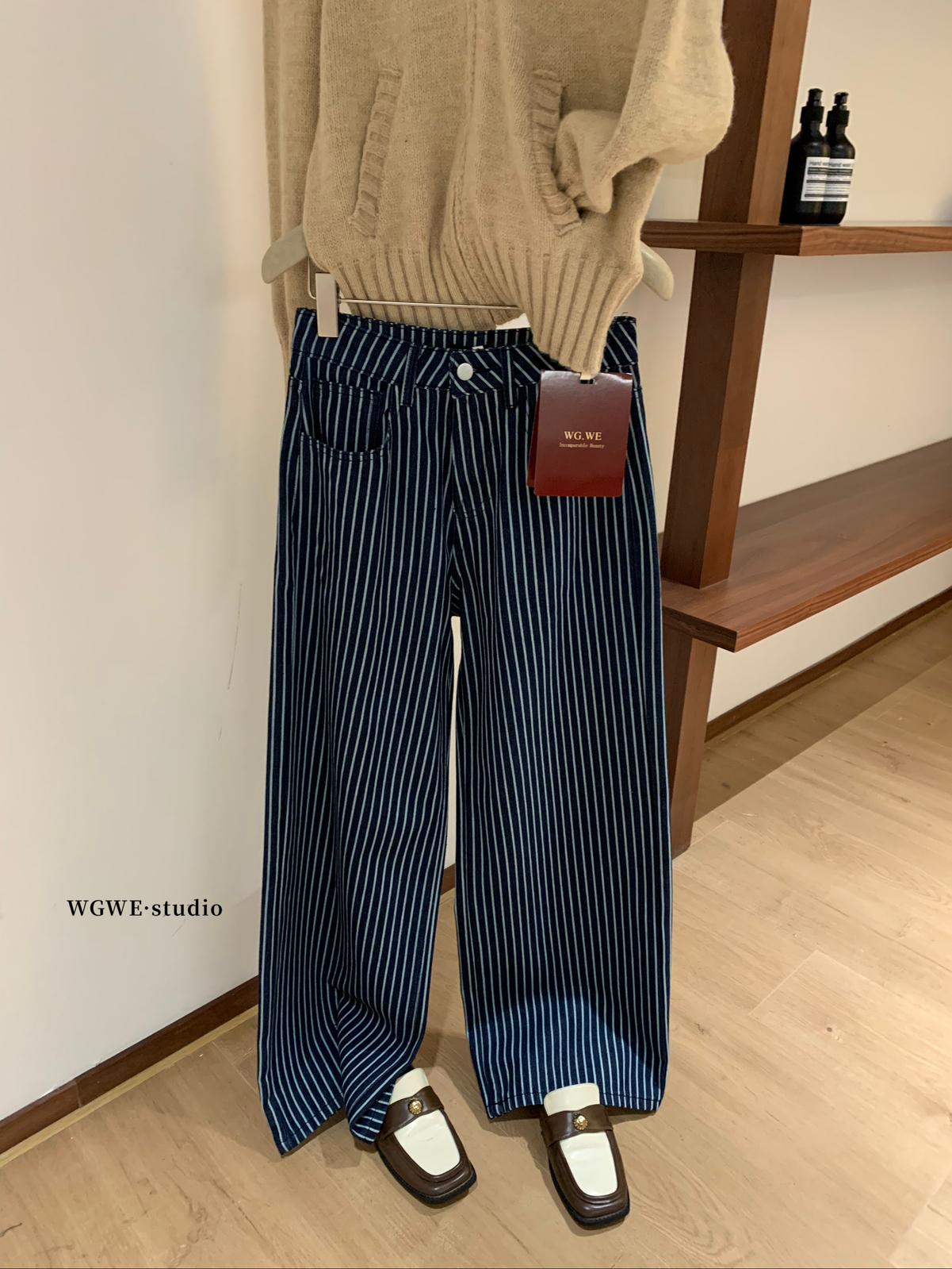 【C7711】復古藍白條紋闊腿牛仔褲女設計感休閒直筒拖地褲牛仔褲