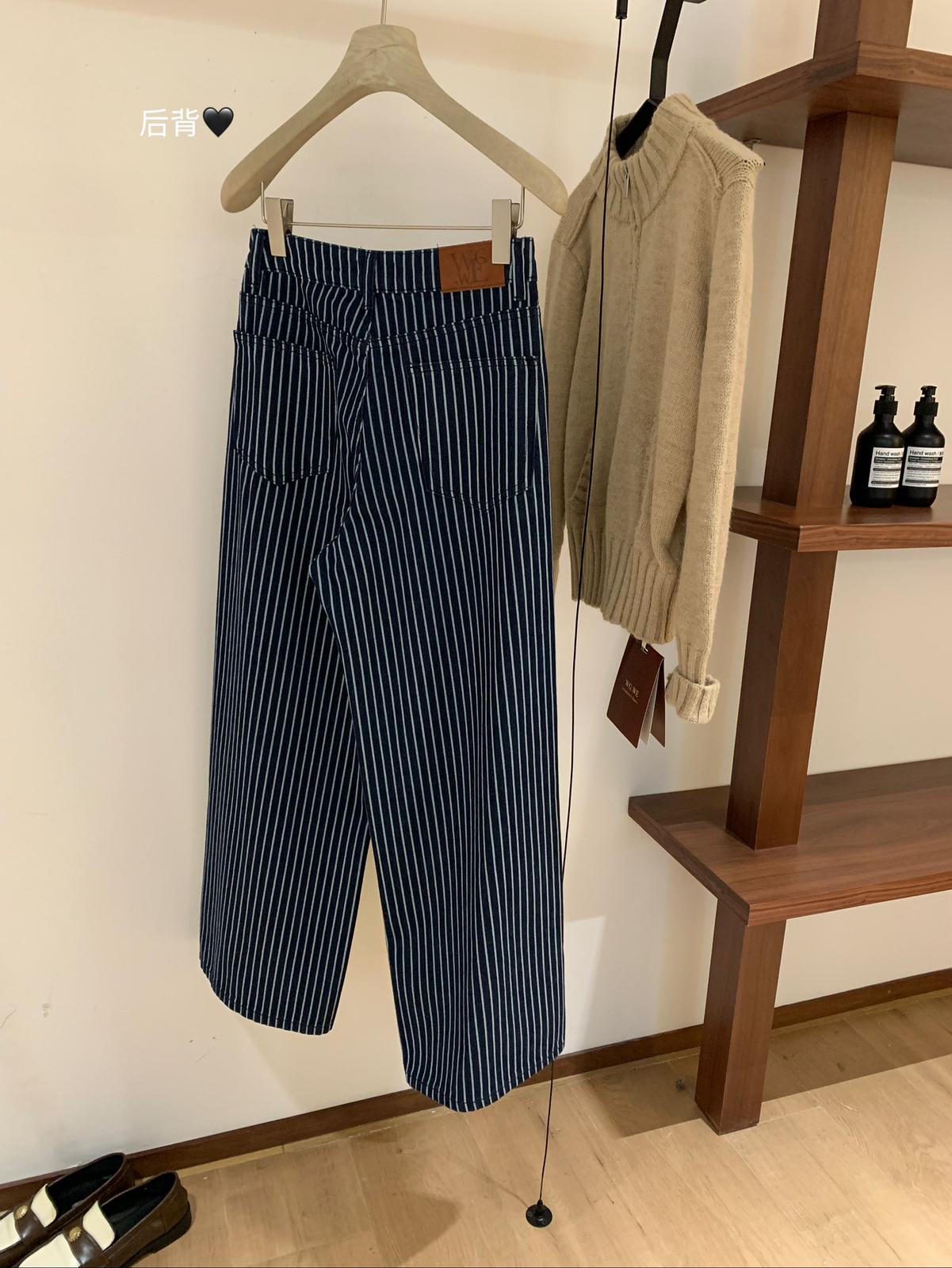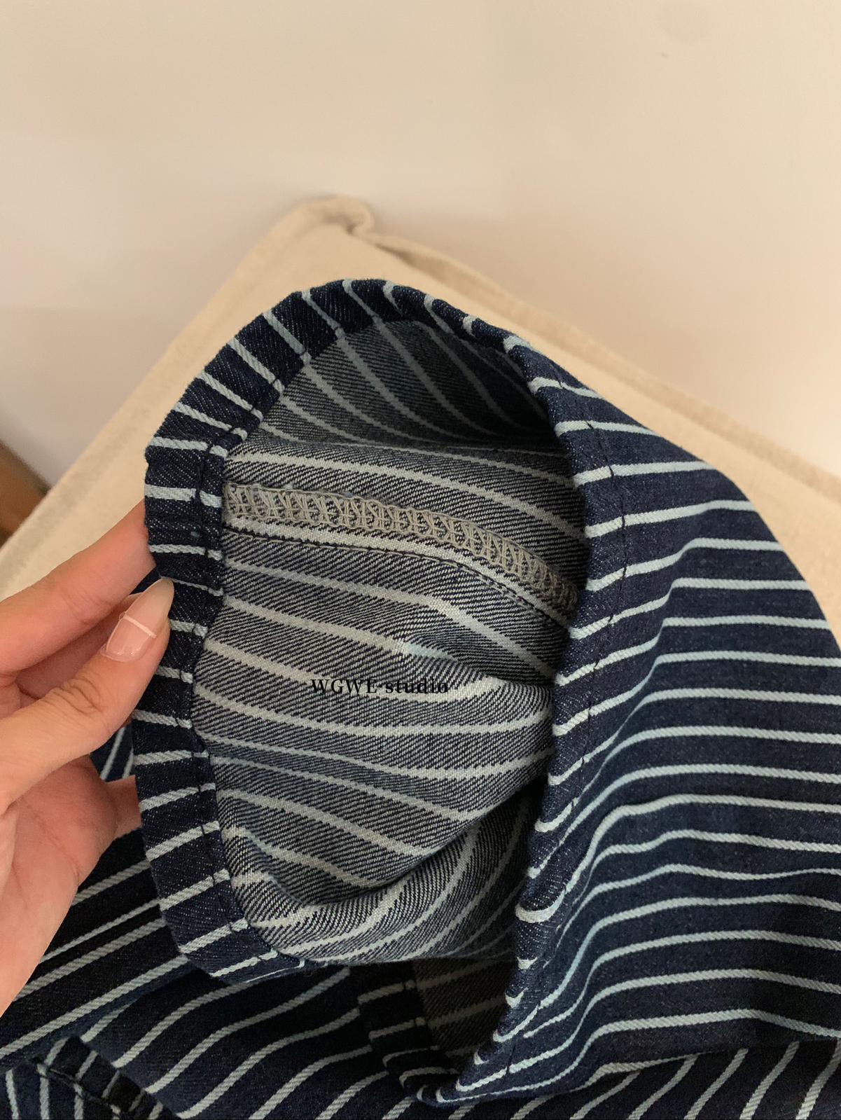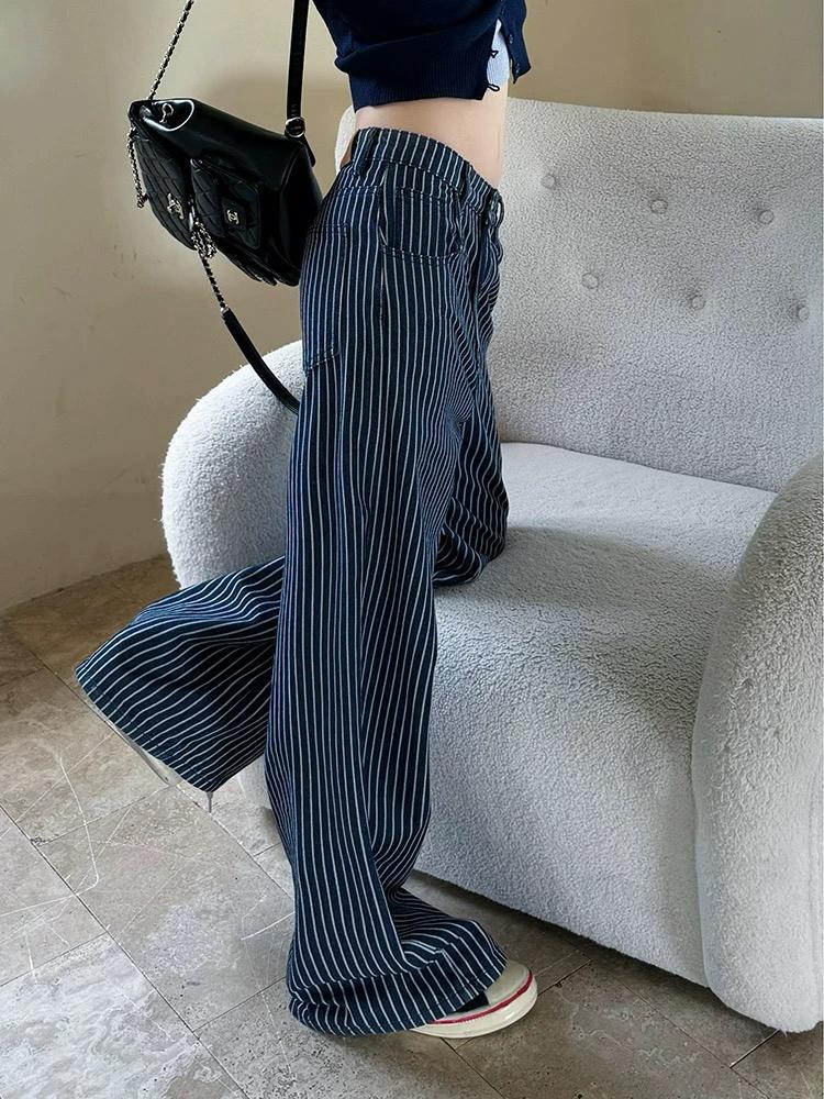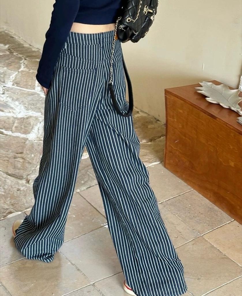 【C7711】復古藍白條紋闊腿牛仔褲女設計感休閒直筒拖地褲牛仔褲