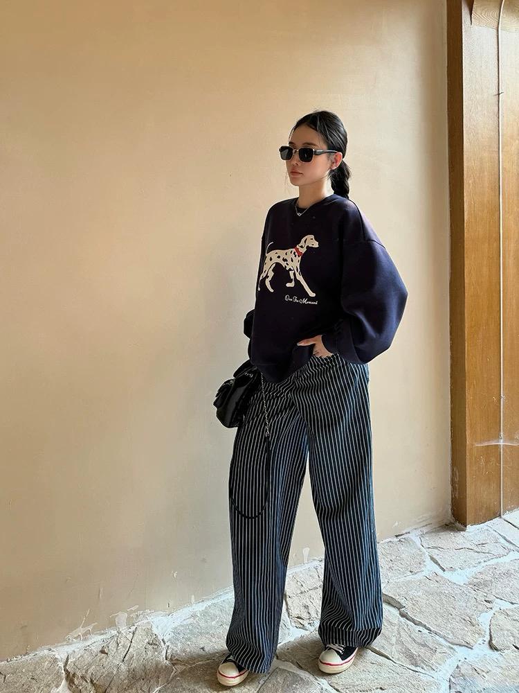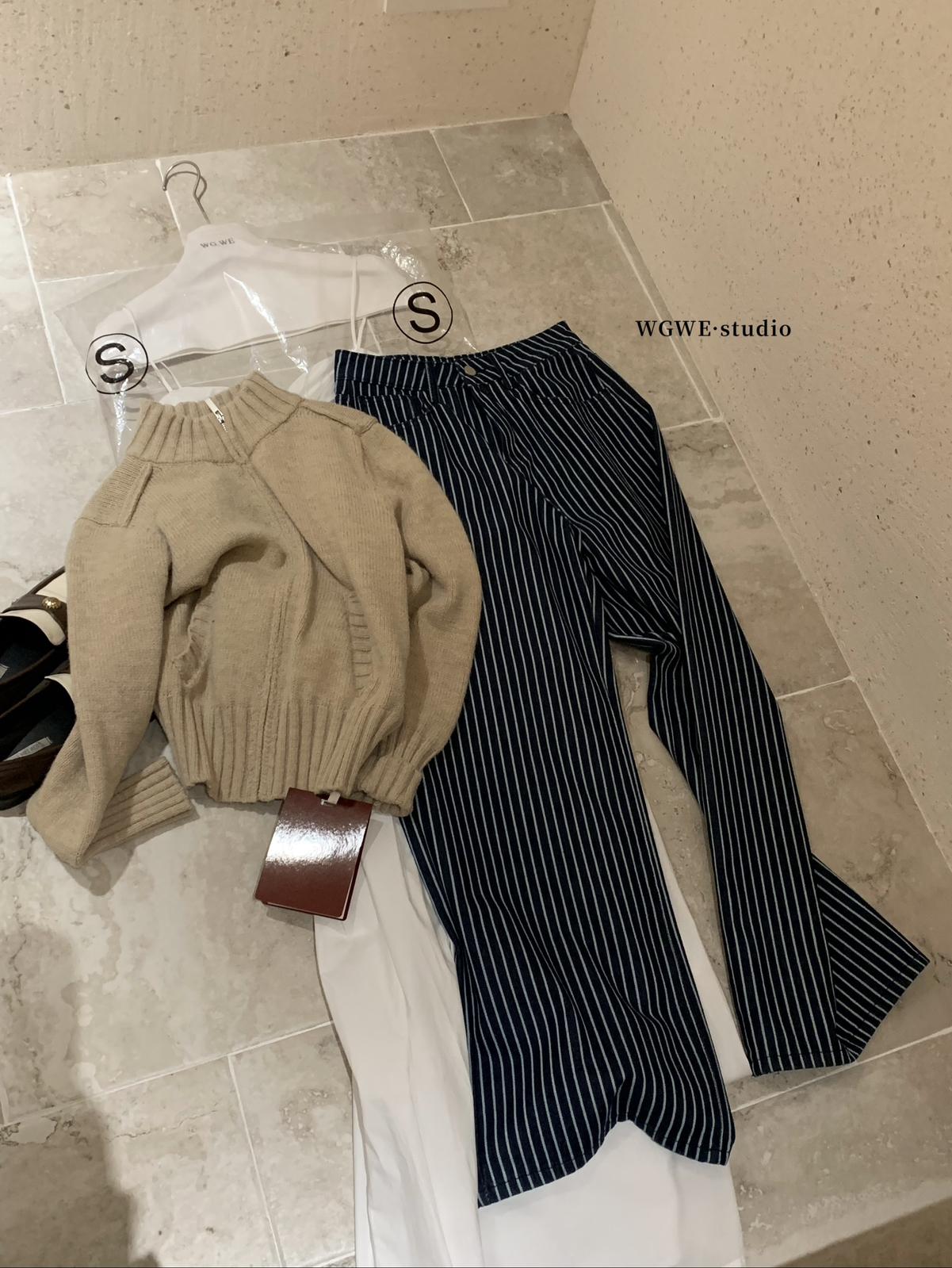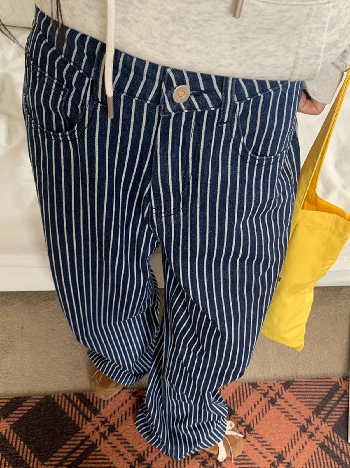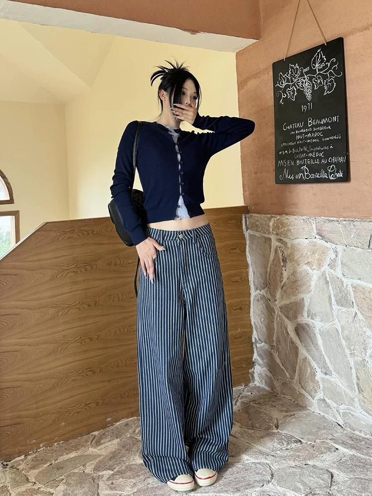 【C7711】復古藍白條紋闊腿牛仔褲女設計感休閒直筒拖地褲牛仔褲