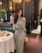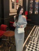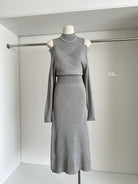 【C7719】韓系氣質收腰針織設計感露肩假兩件長裙連衣裙