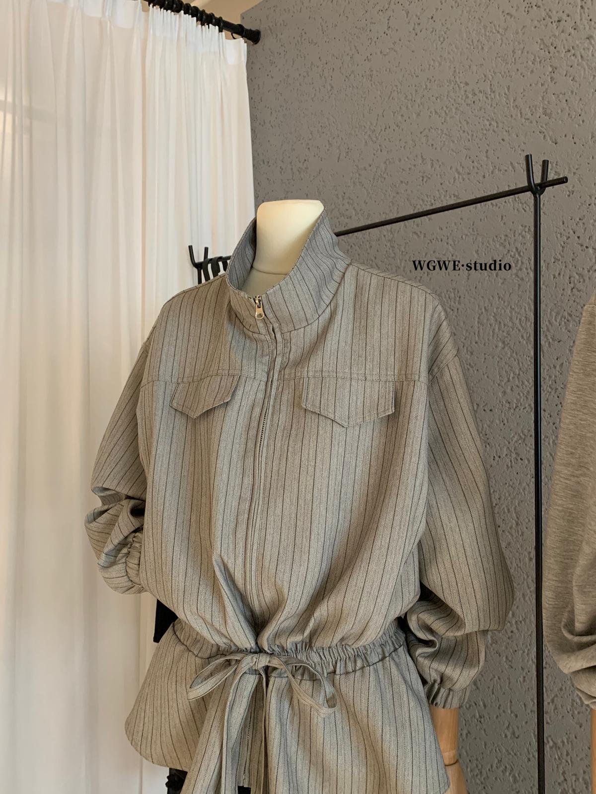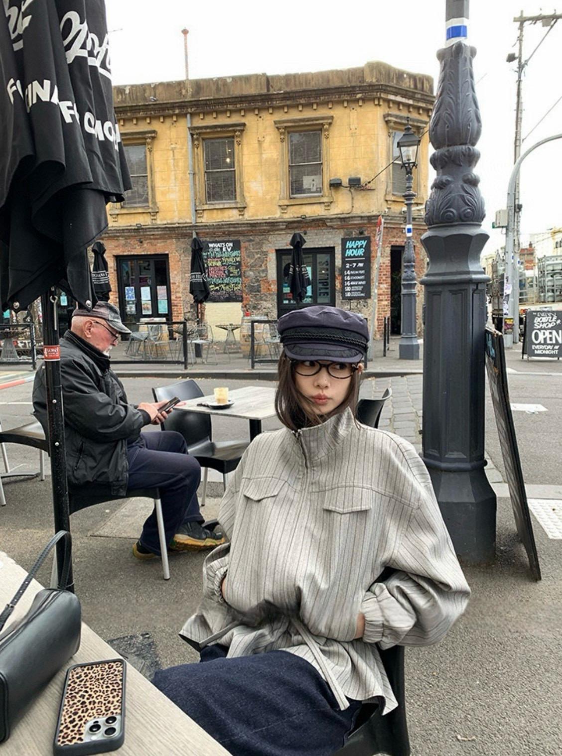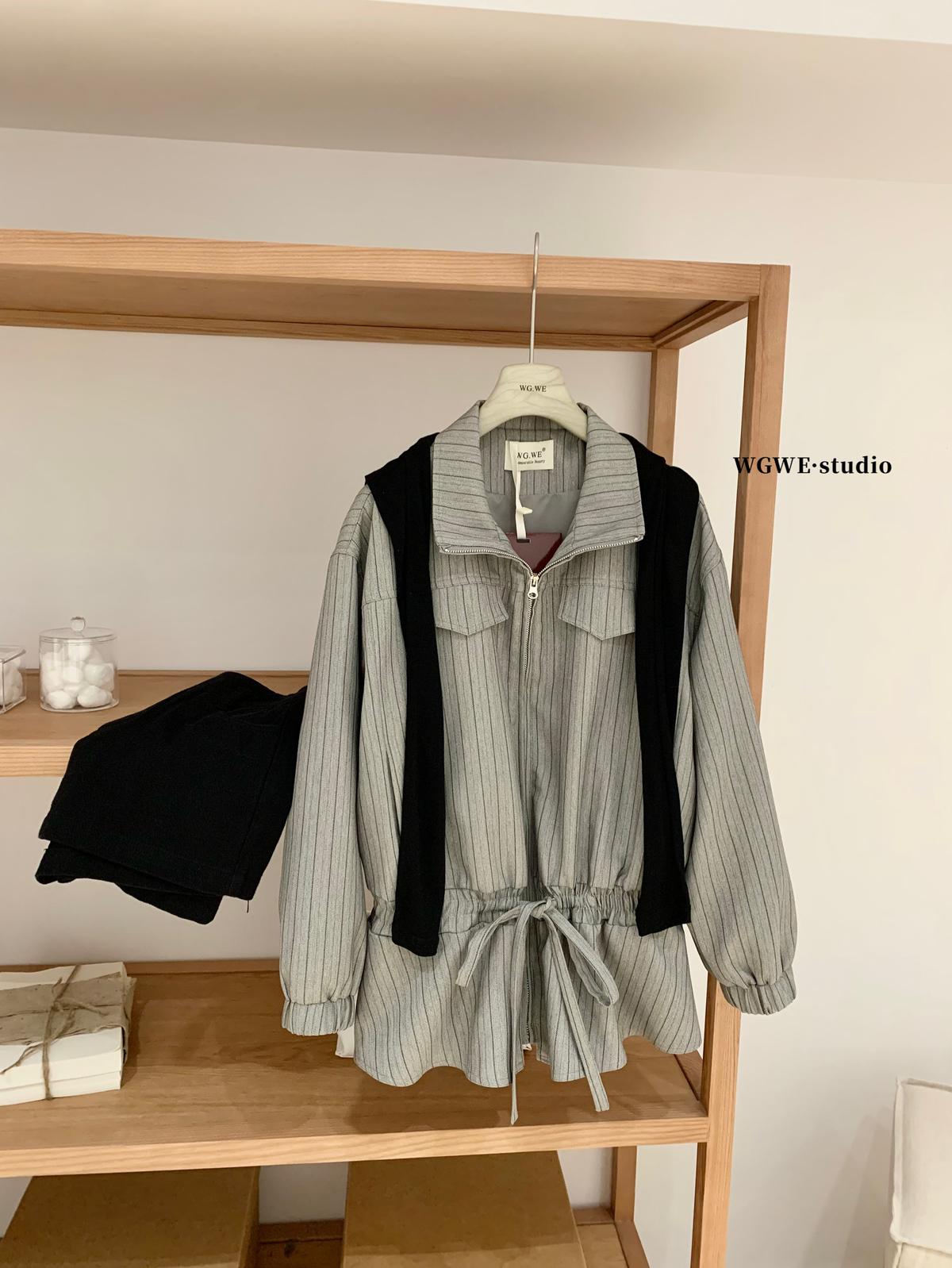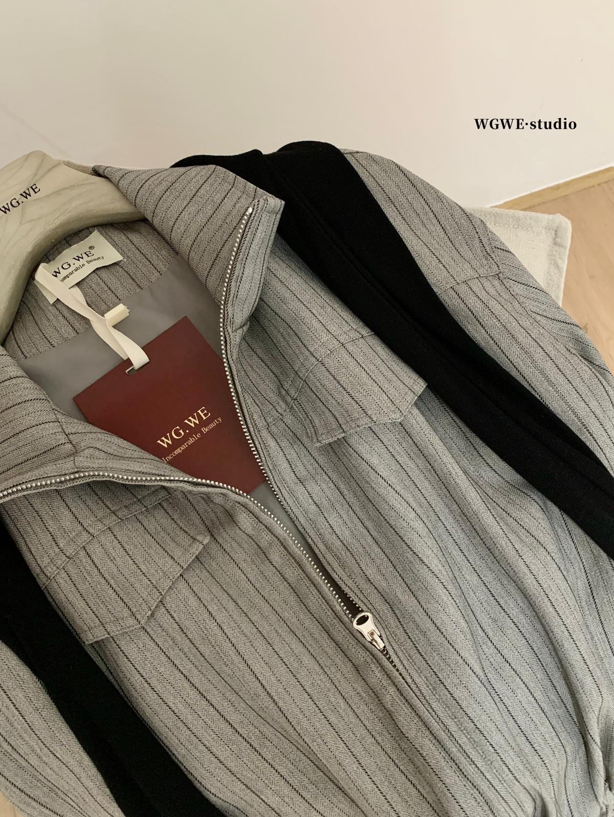 3. 【C7758】復古條紋立領長袖開衫外套美式寬鬆休閒氣質夾克