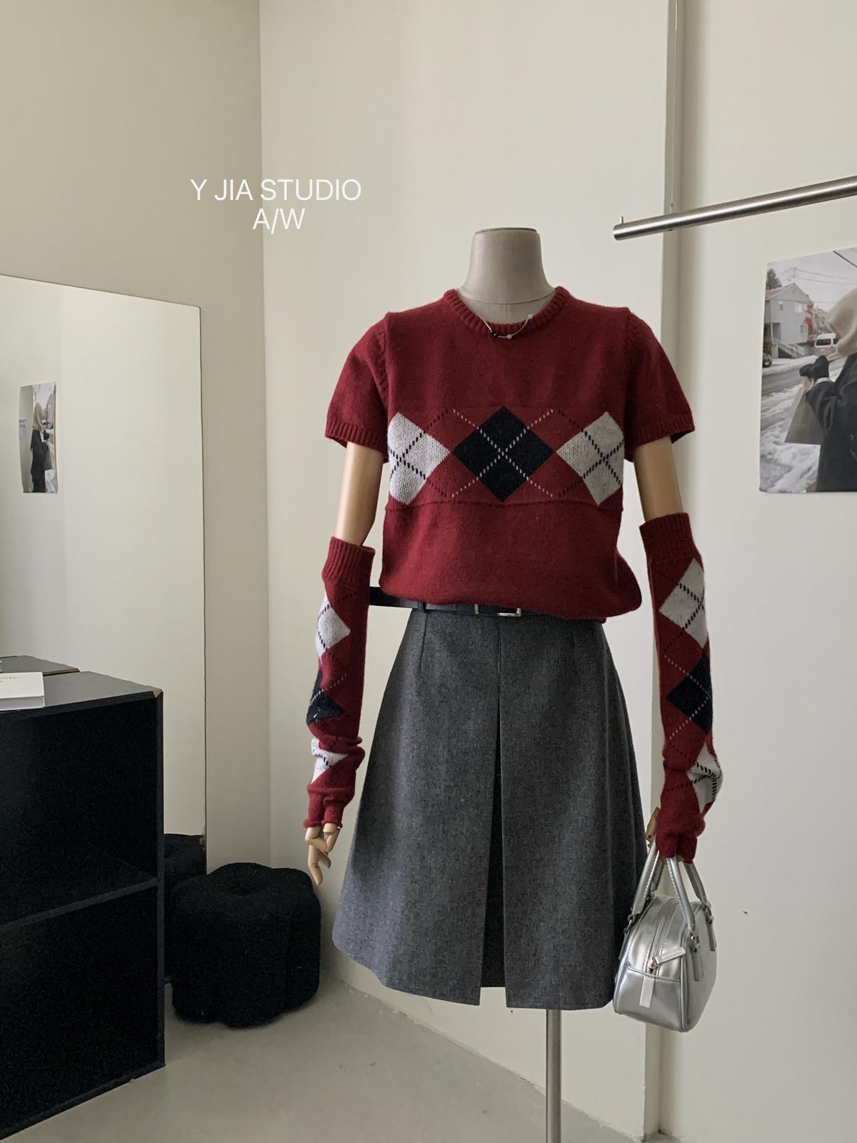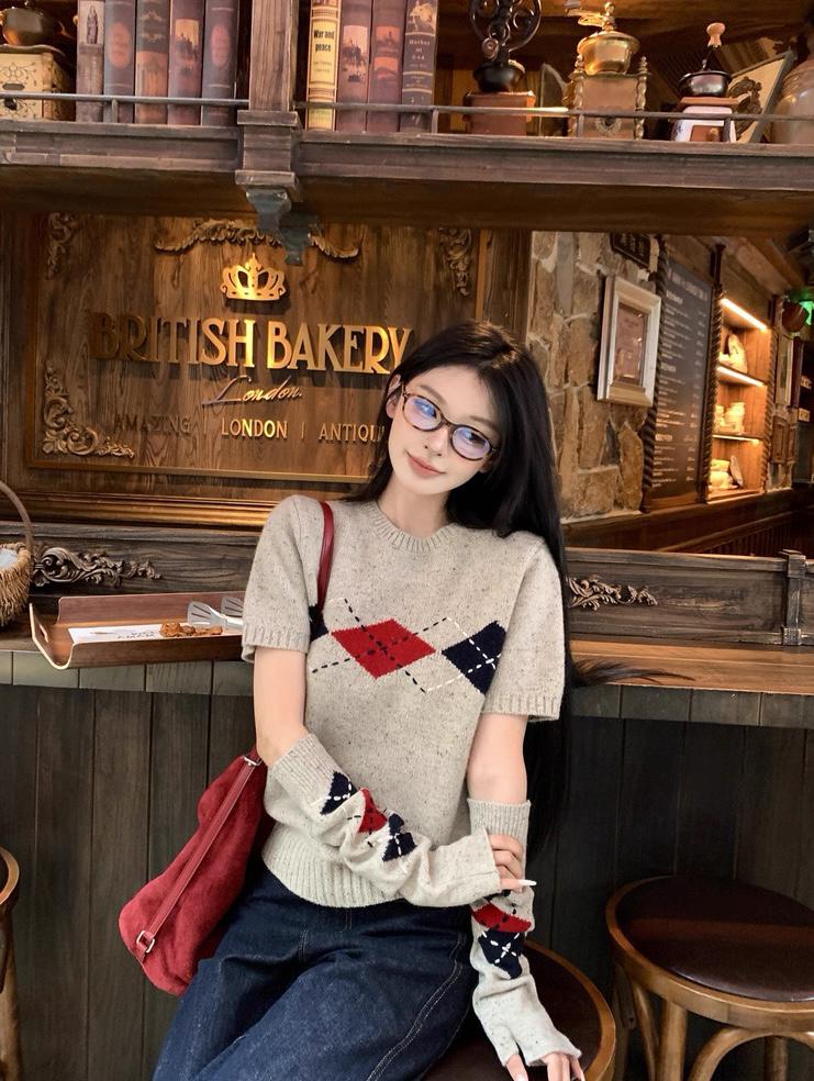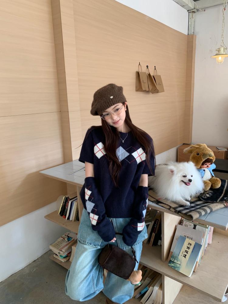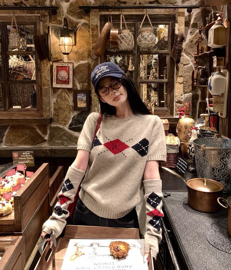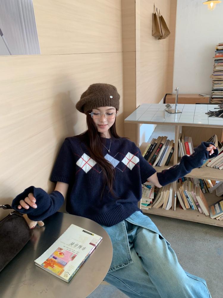 3. 【C8095】元氣歐尼~復古菱格設計感圓領短袖保暖毛衣(配袖套)