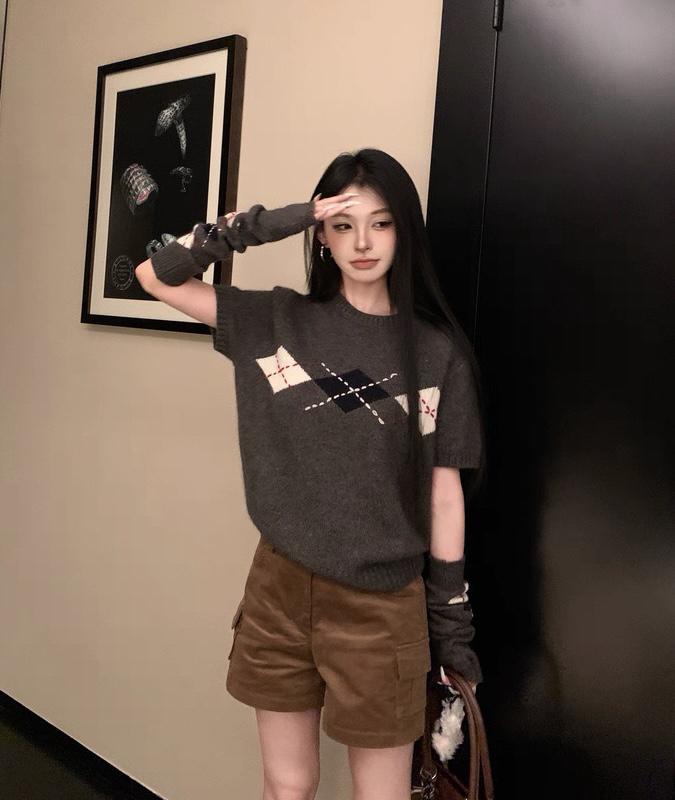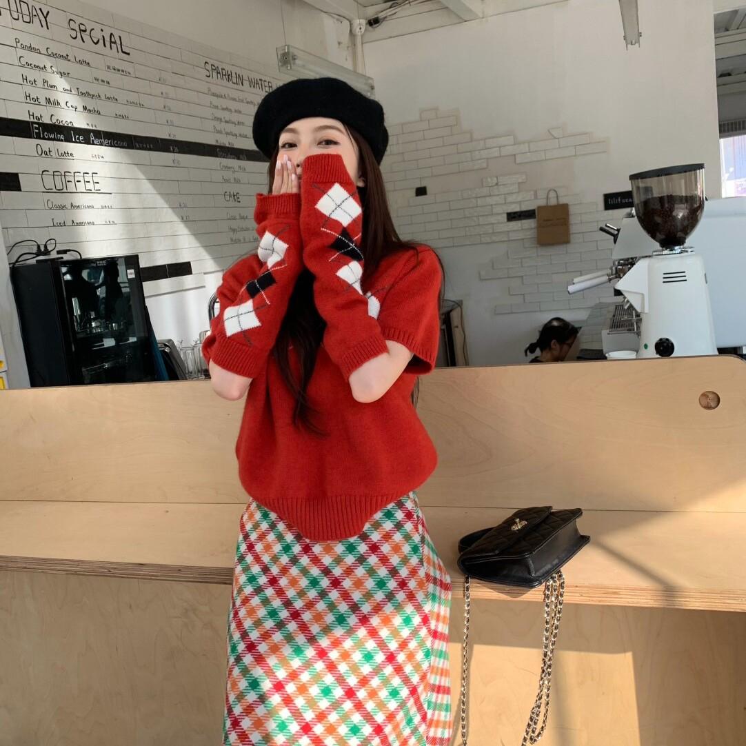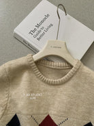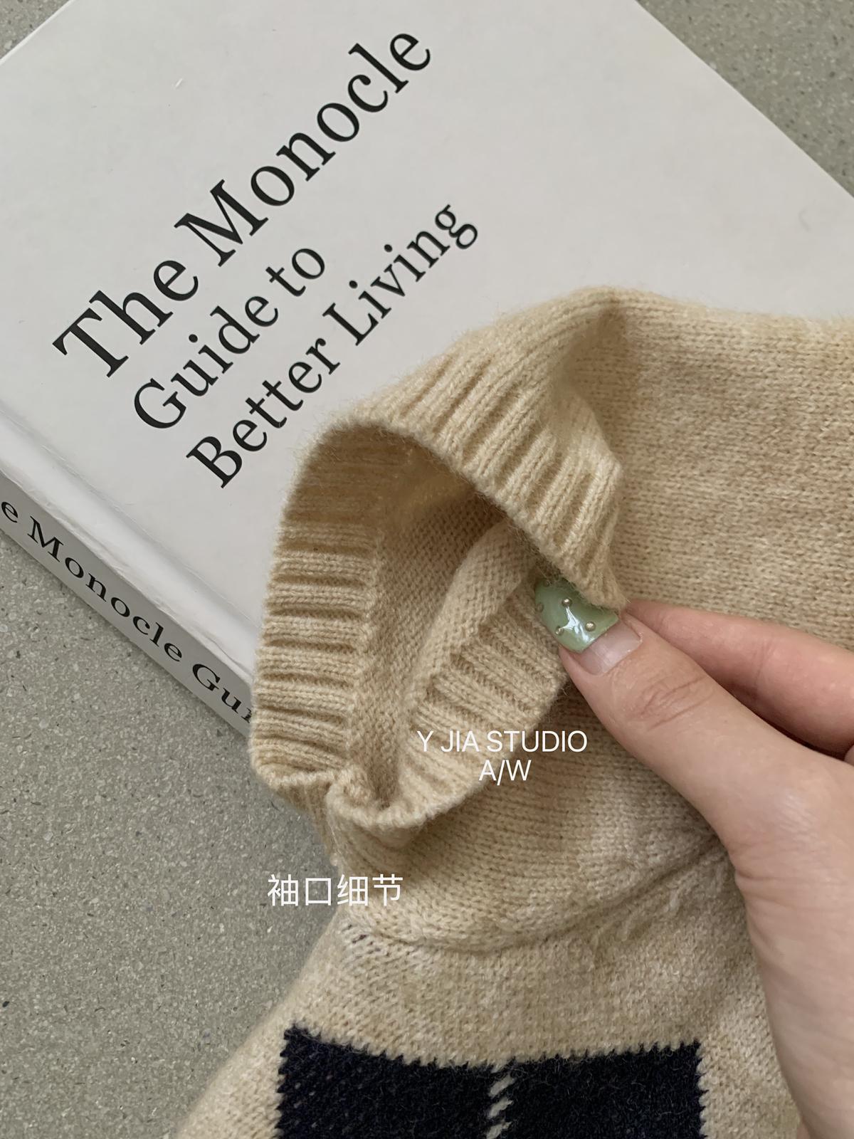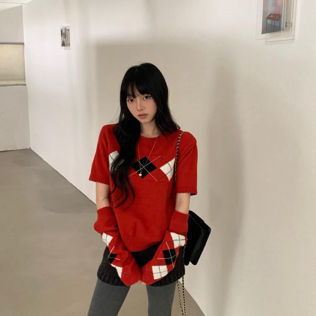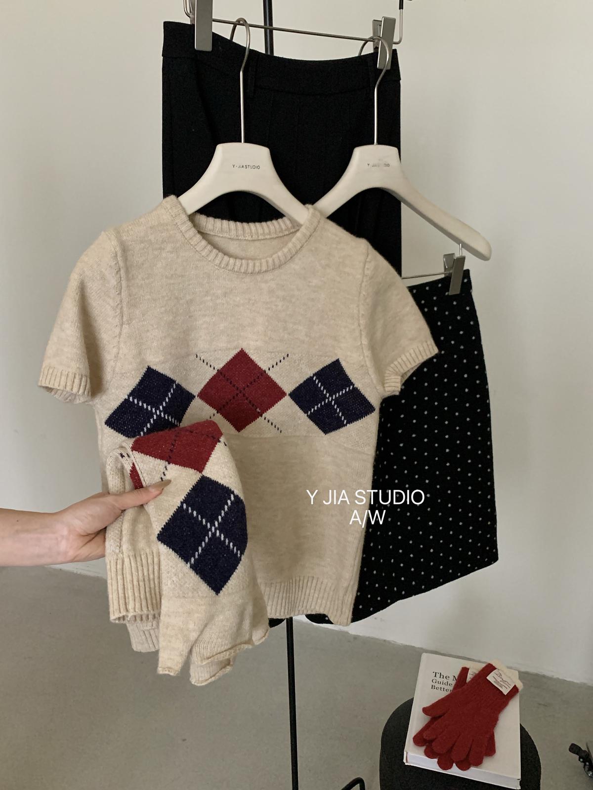 3. 【C8095】元氣歐尼~復古菱格設計感圓領短袖保暖毛衣(配袖套)