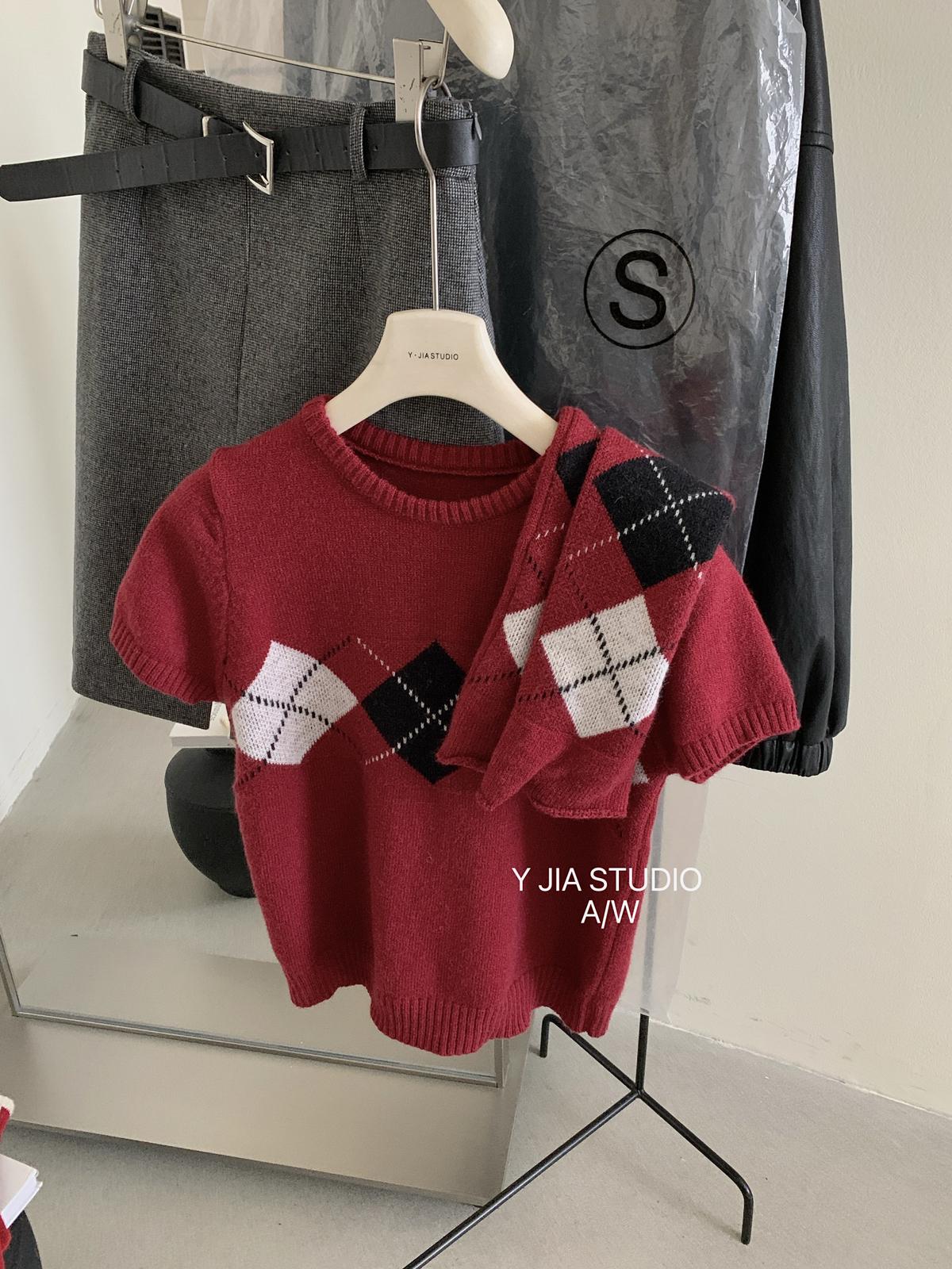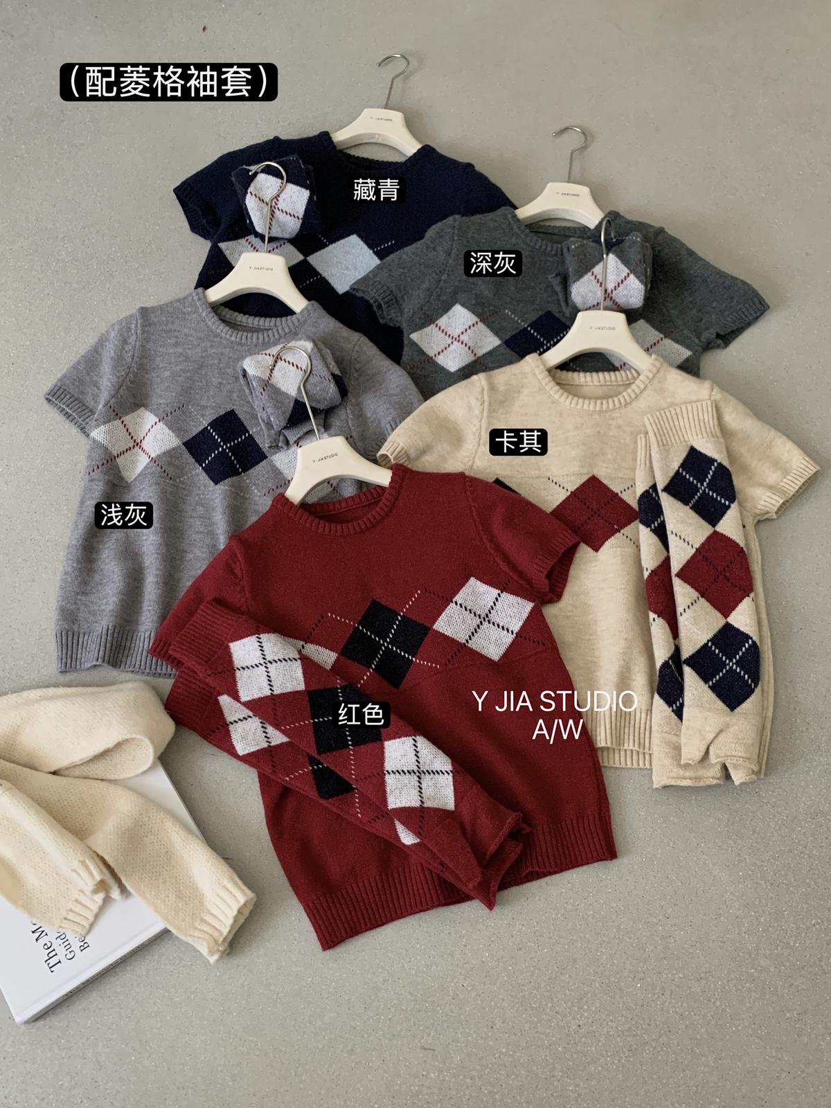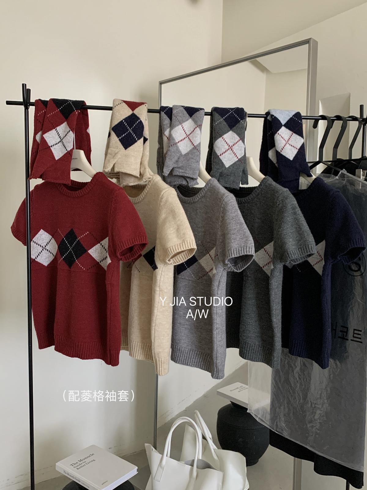 【C8095】元氣歐尼~復古菱格設計感圓領短袖保暖毛衣(配袖套)
