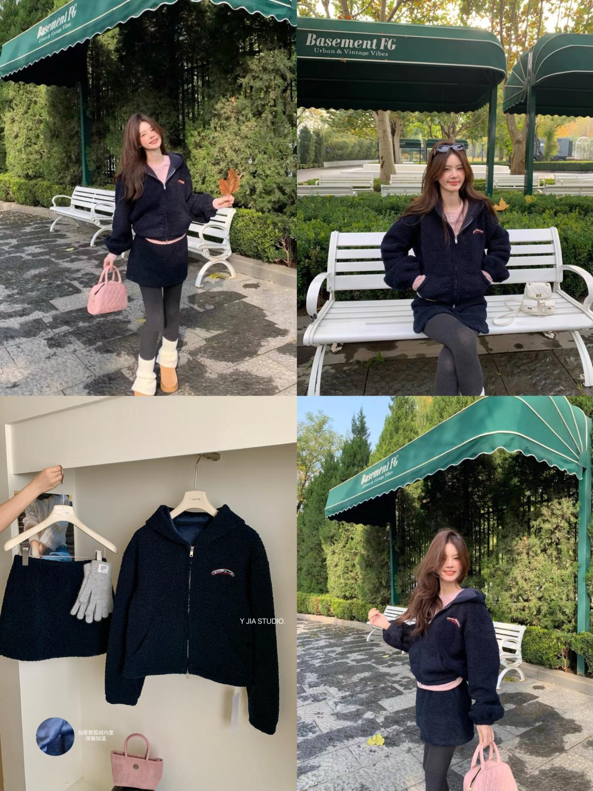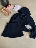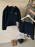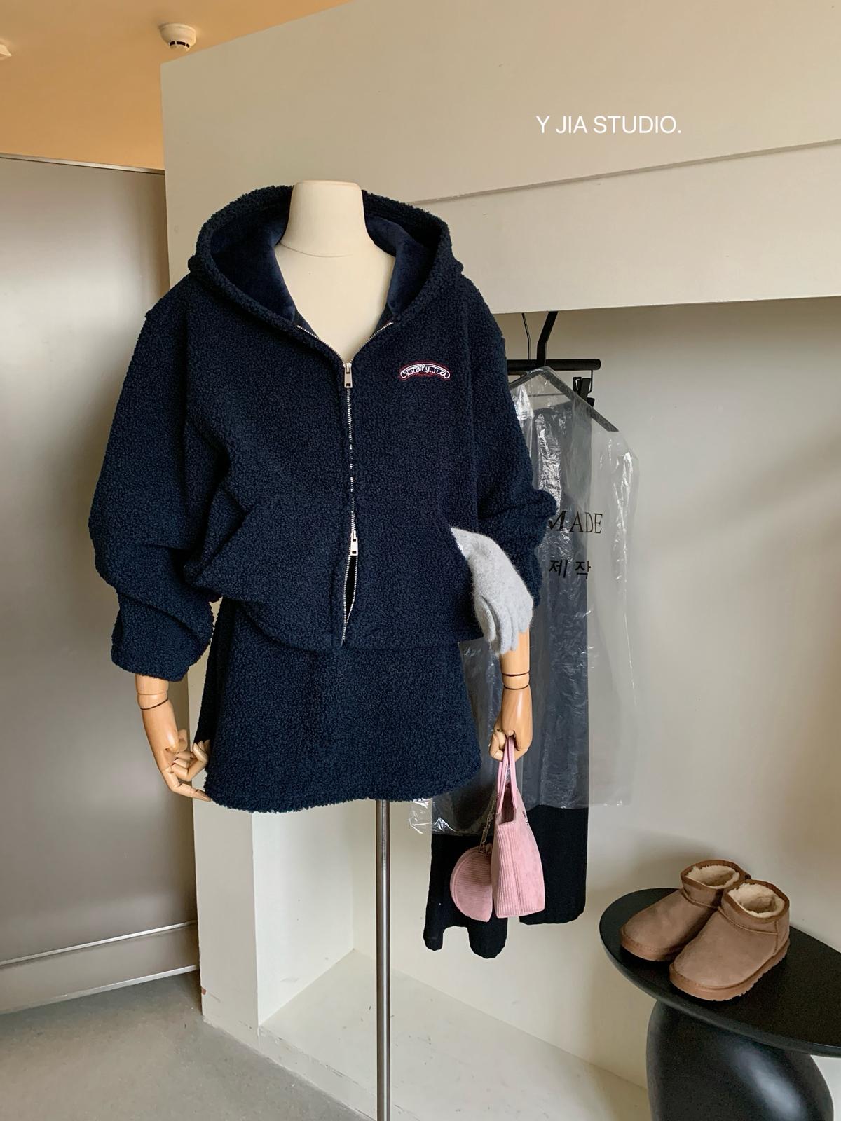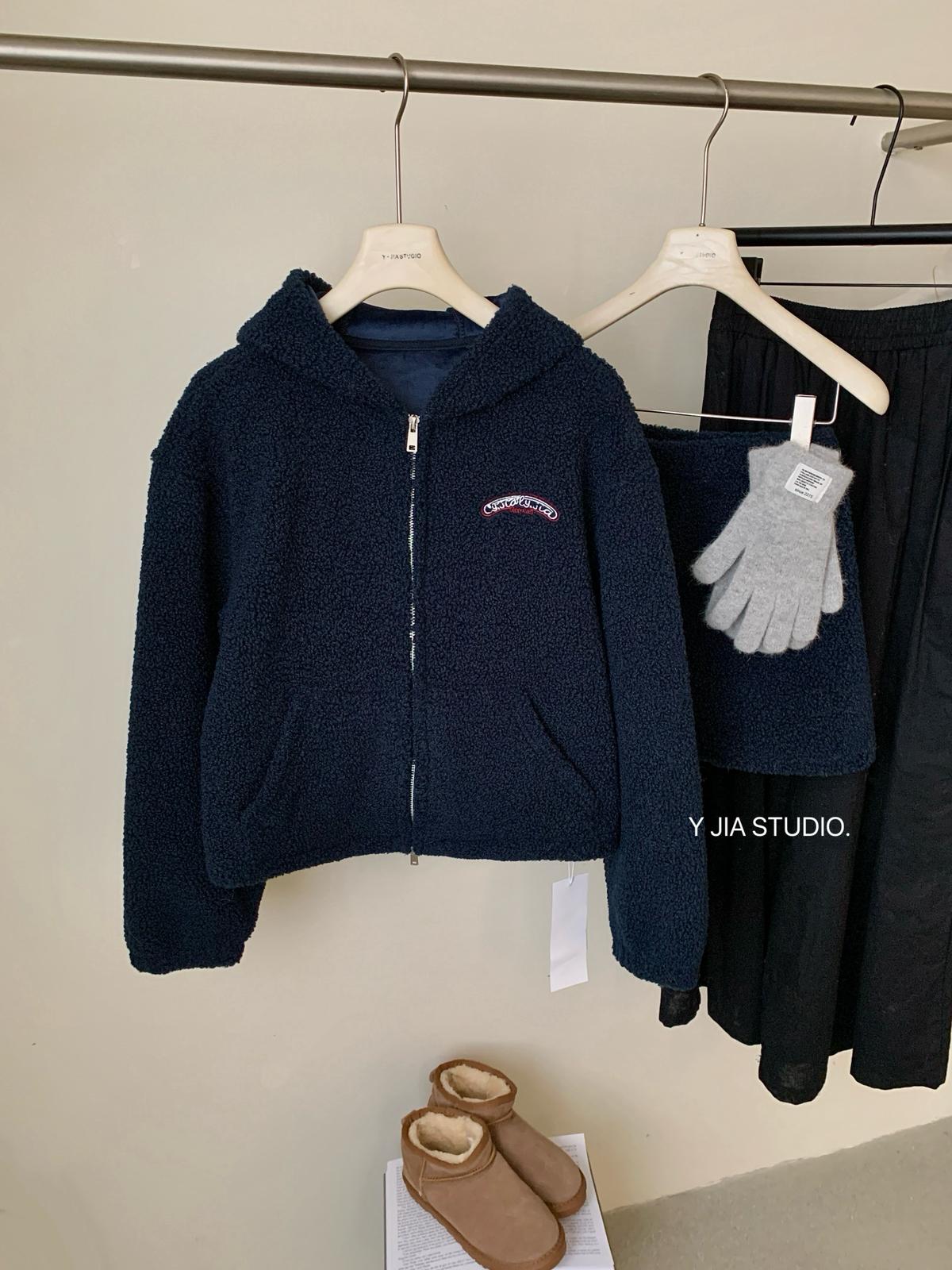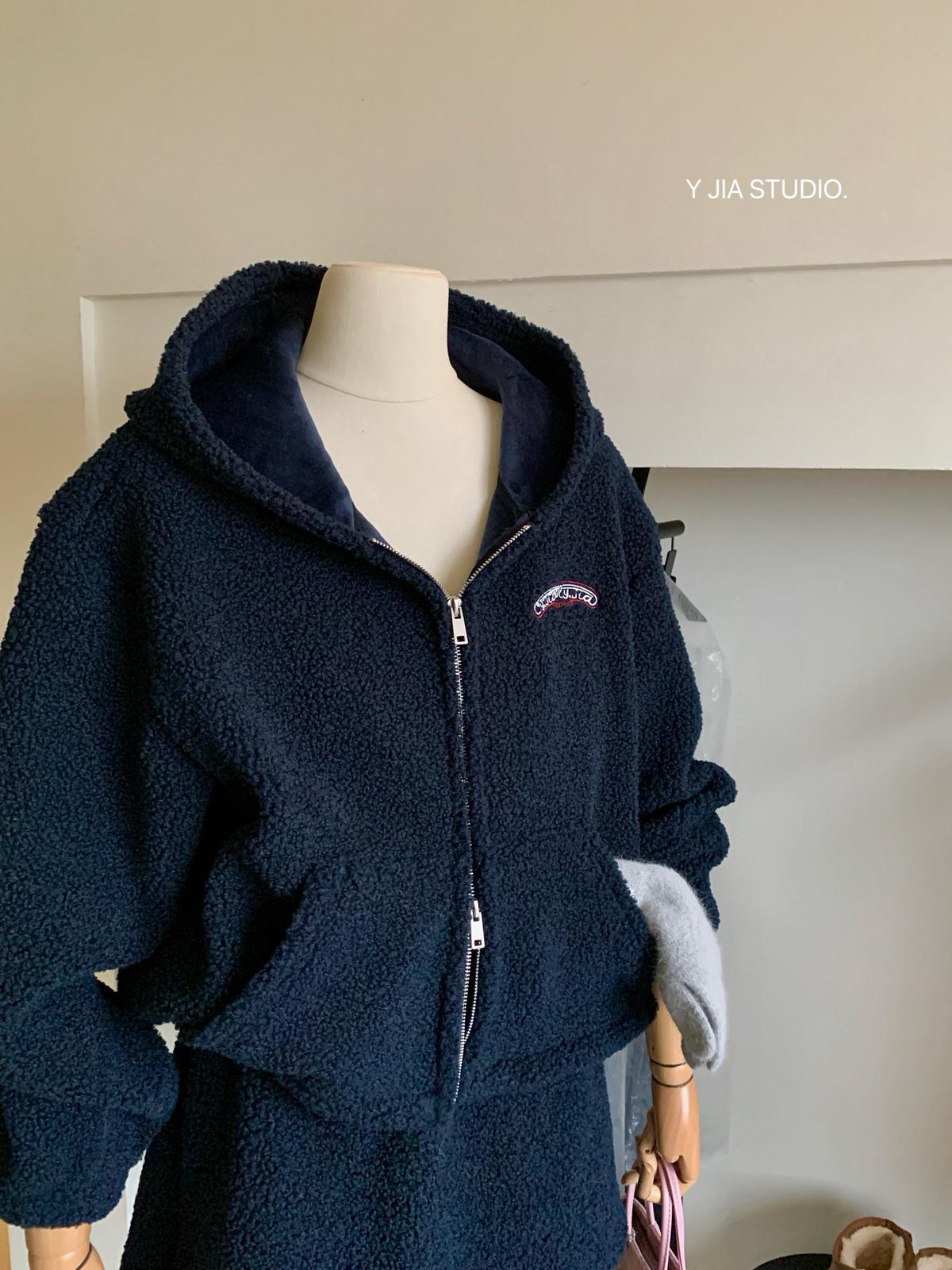 【C8096】舒適區~搖粒絨刺繡連帽衛衣外套+高腰a字半身裙套裝