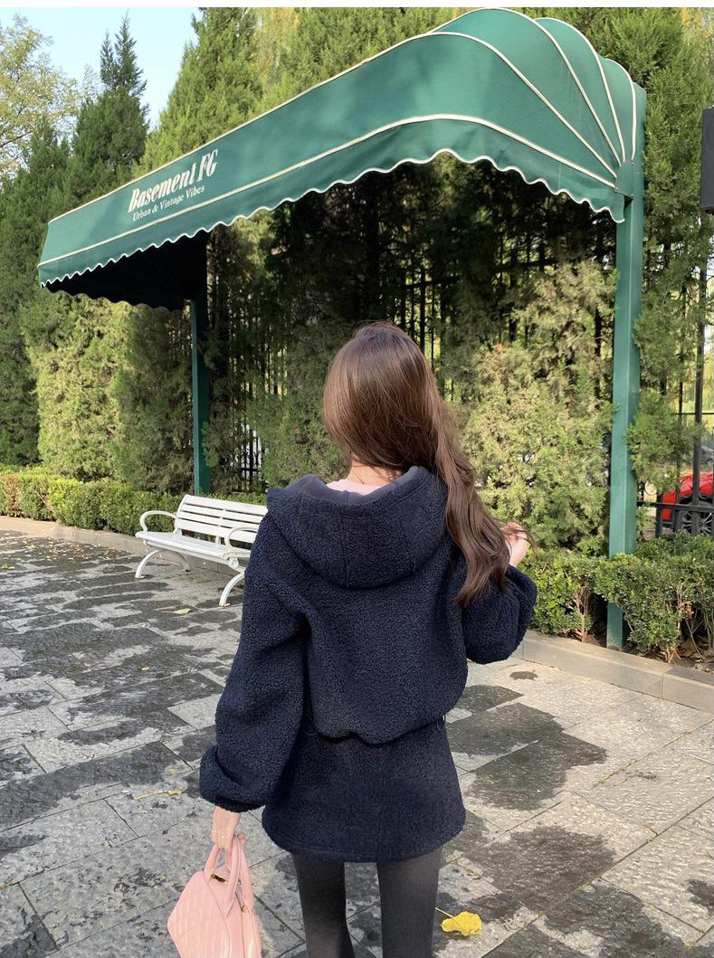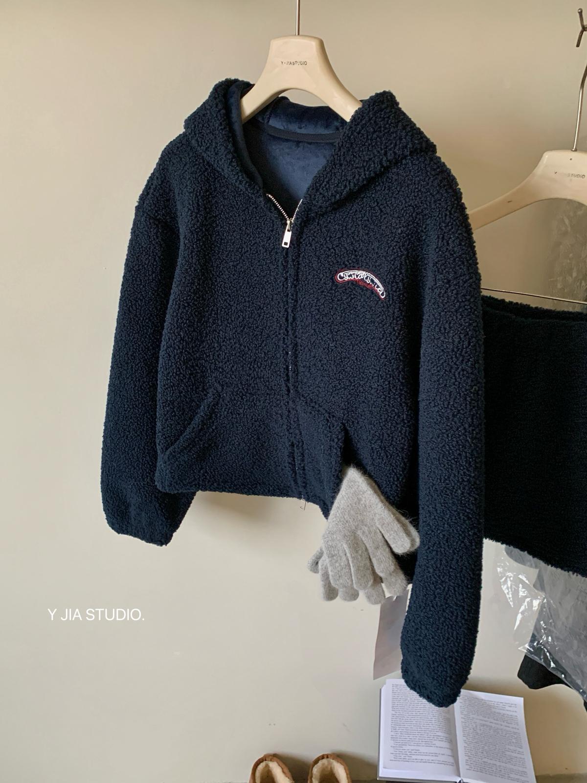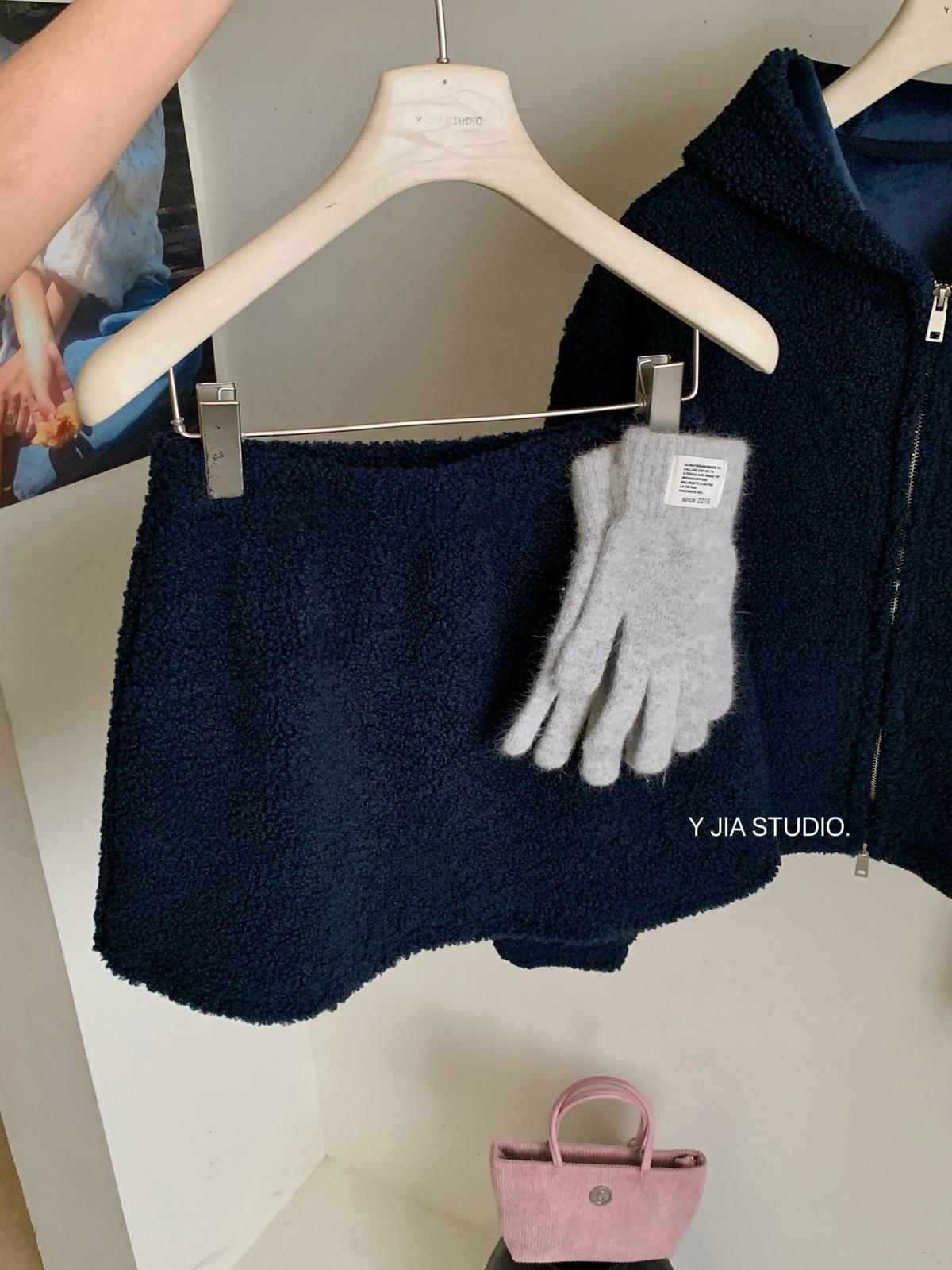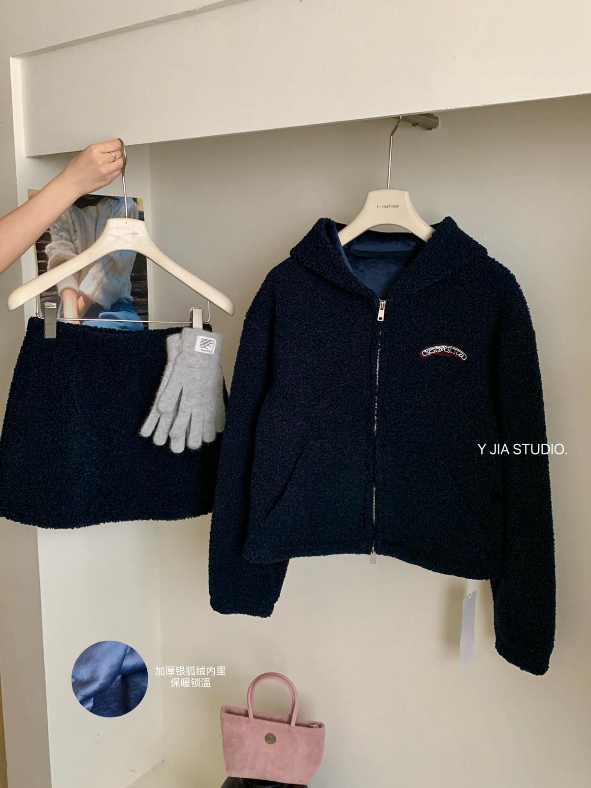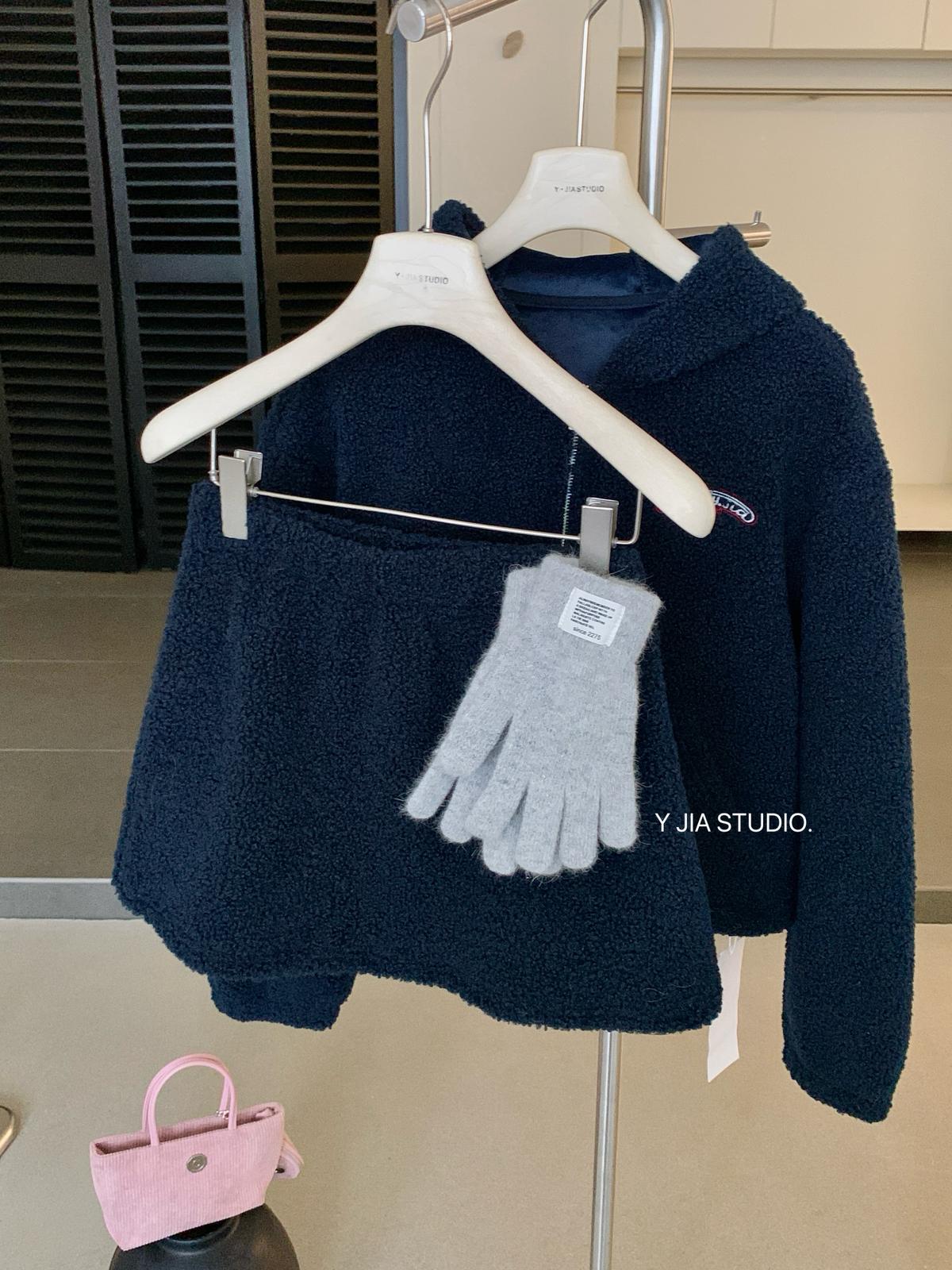 【C8096】舒適區~搖粒絨刺繡連帽衛衣外套+高腰a字半身裙套裝