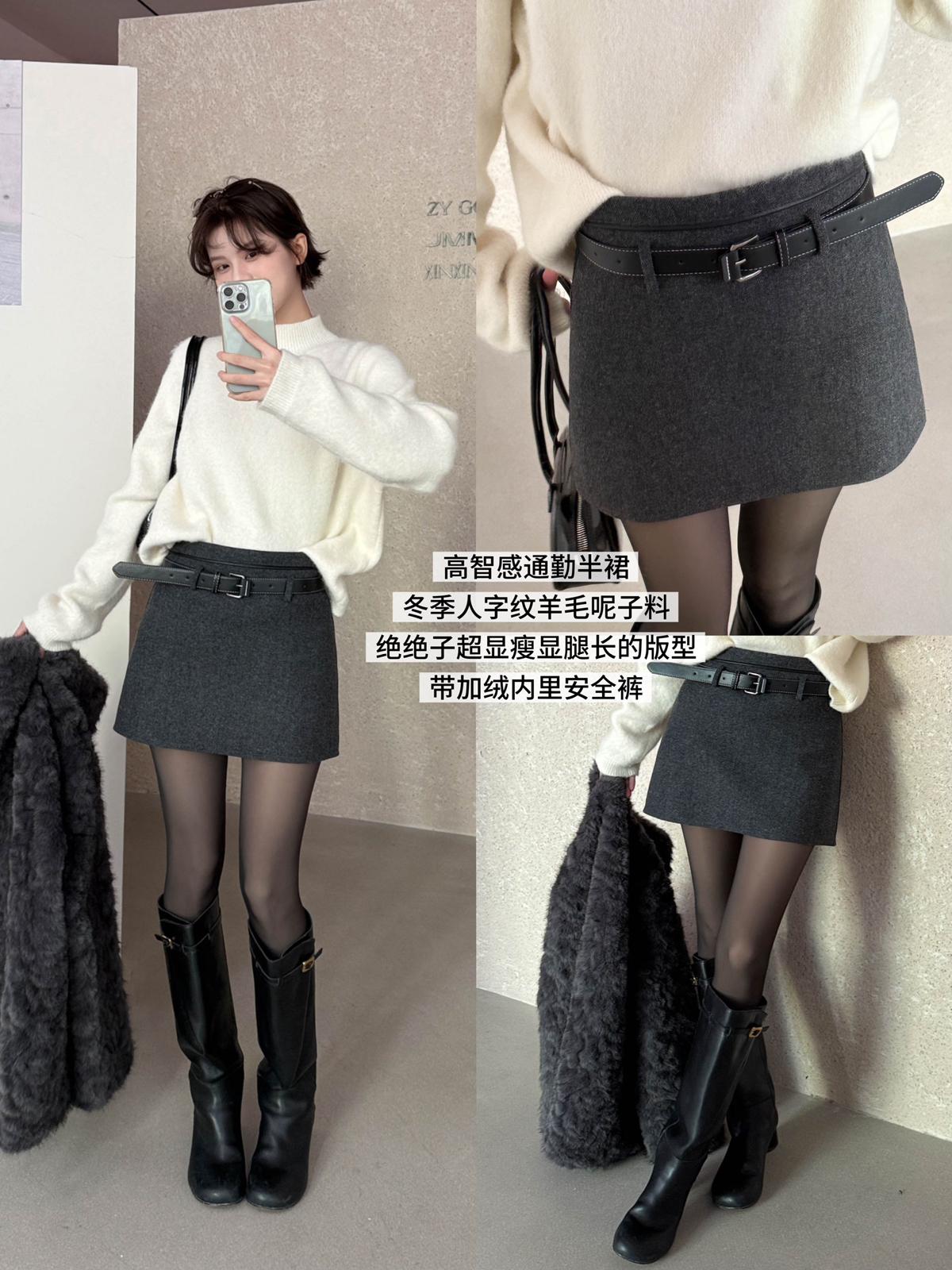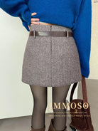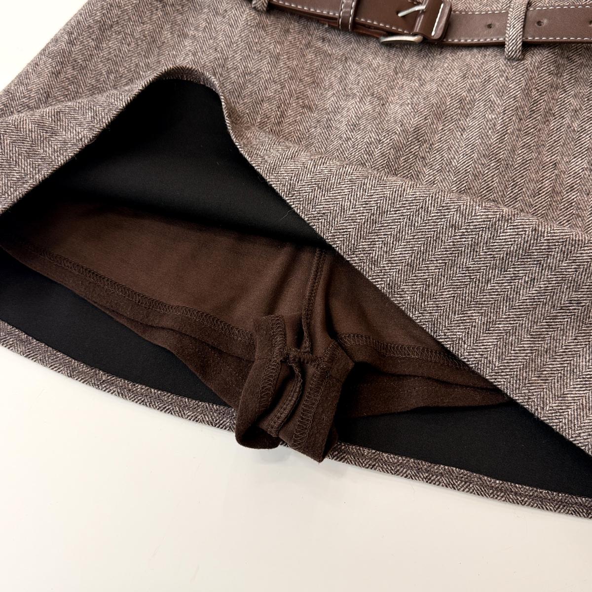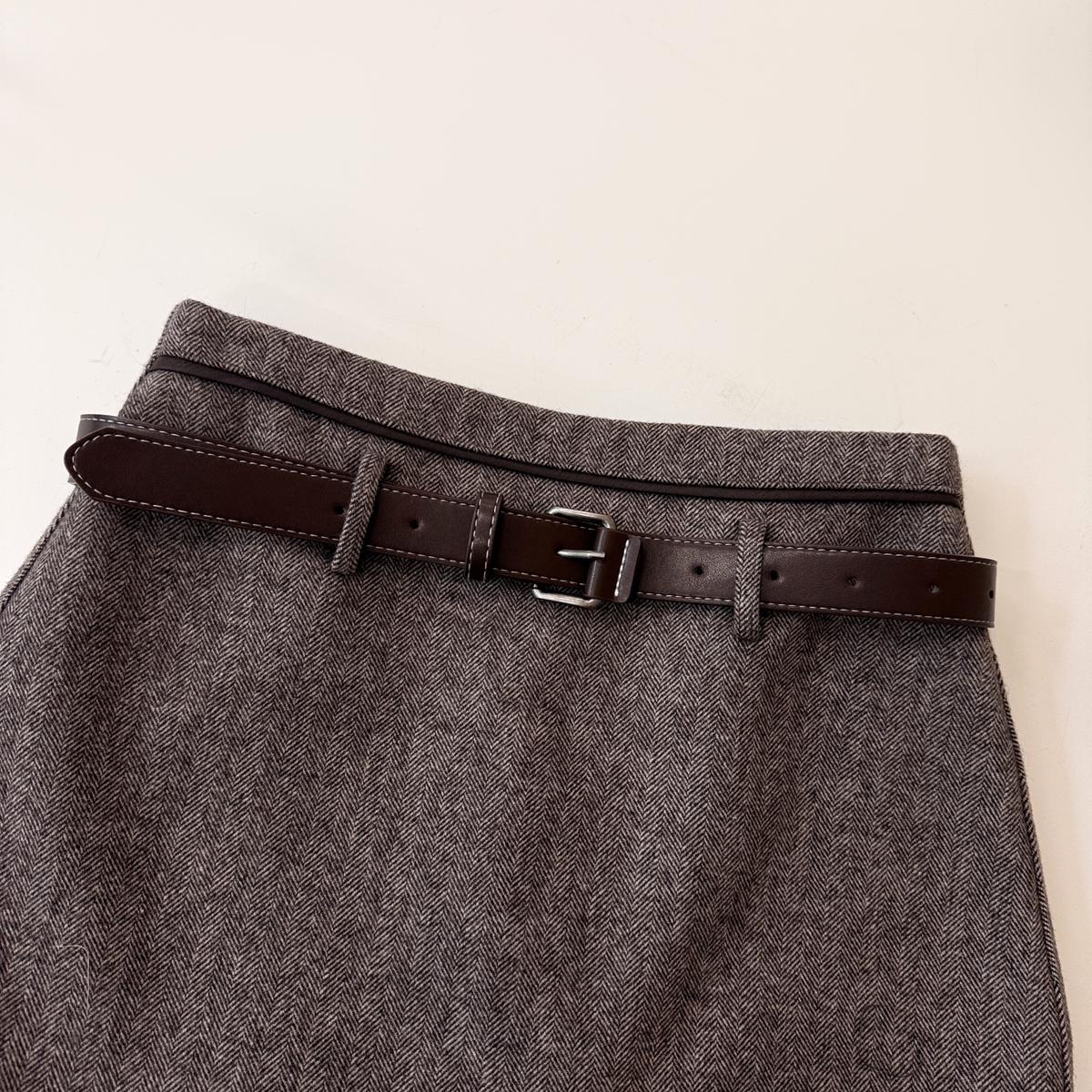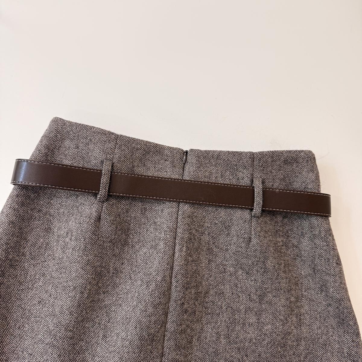 3. 【C8110】韓版高腰簡約人字紋羊毛呢子保暖日常通勤短裙半身裙(配腰帶)(含50%羊毛)(加絨裏褲)