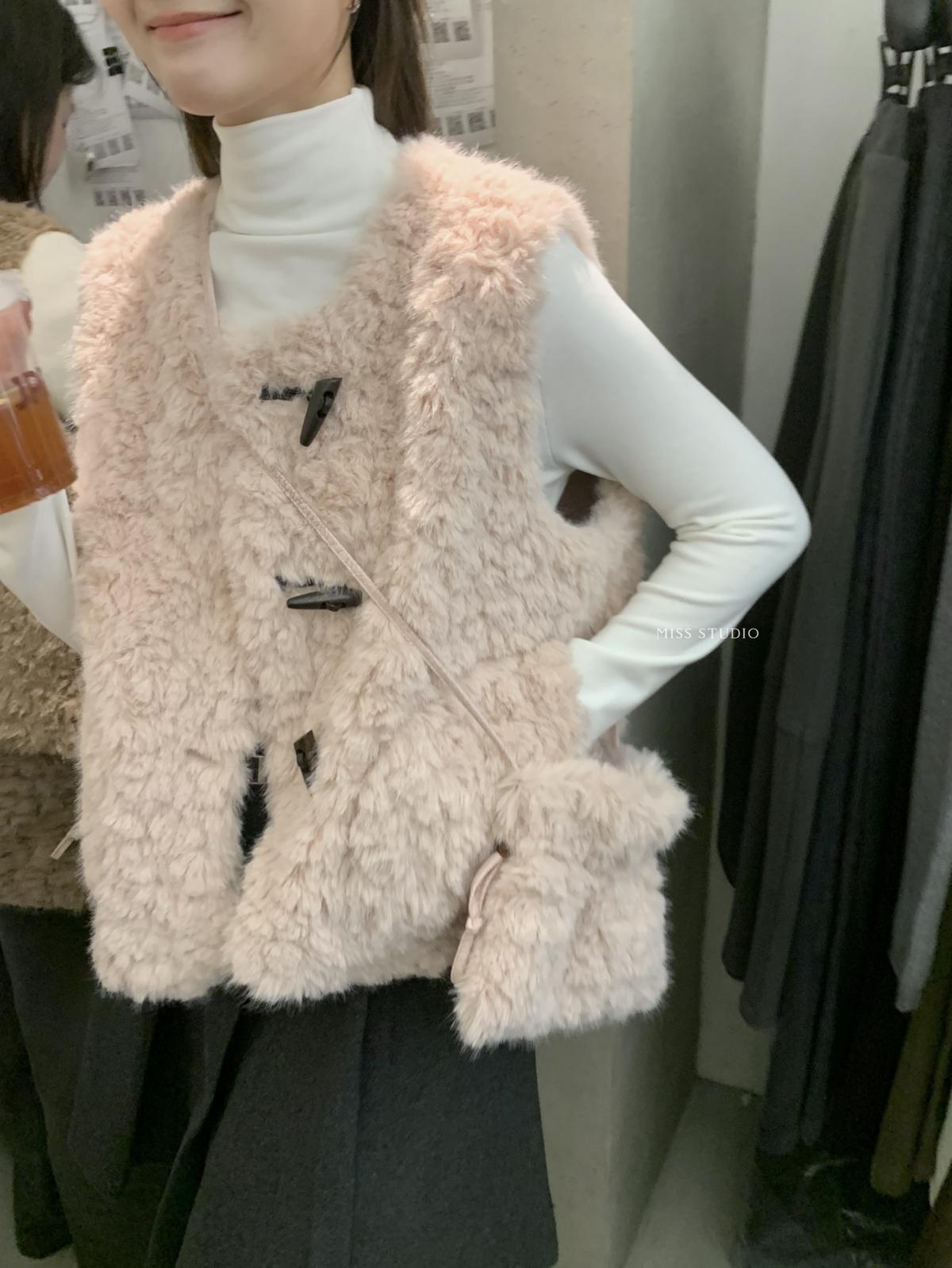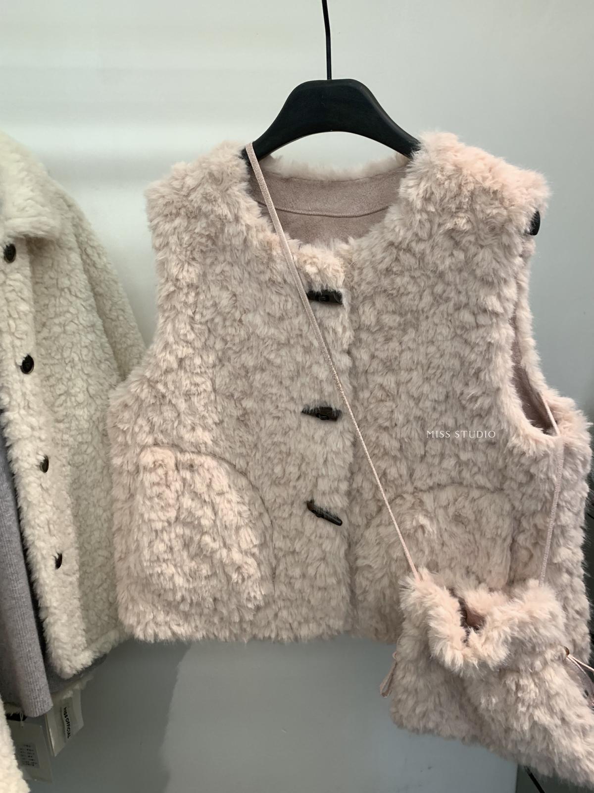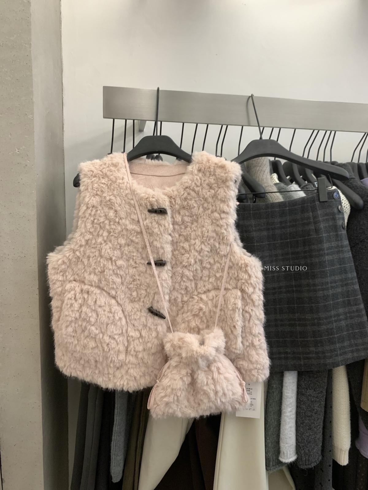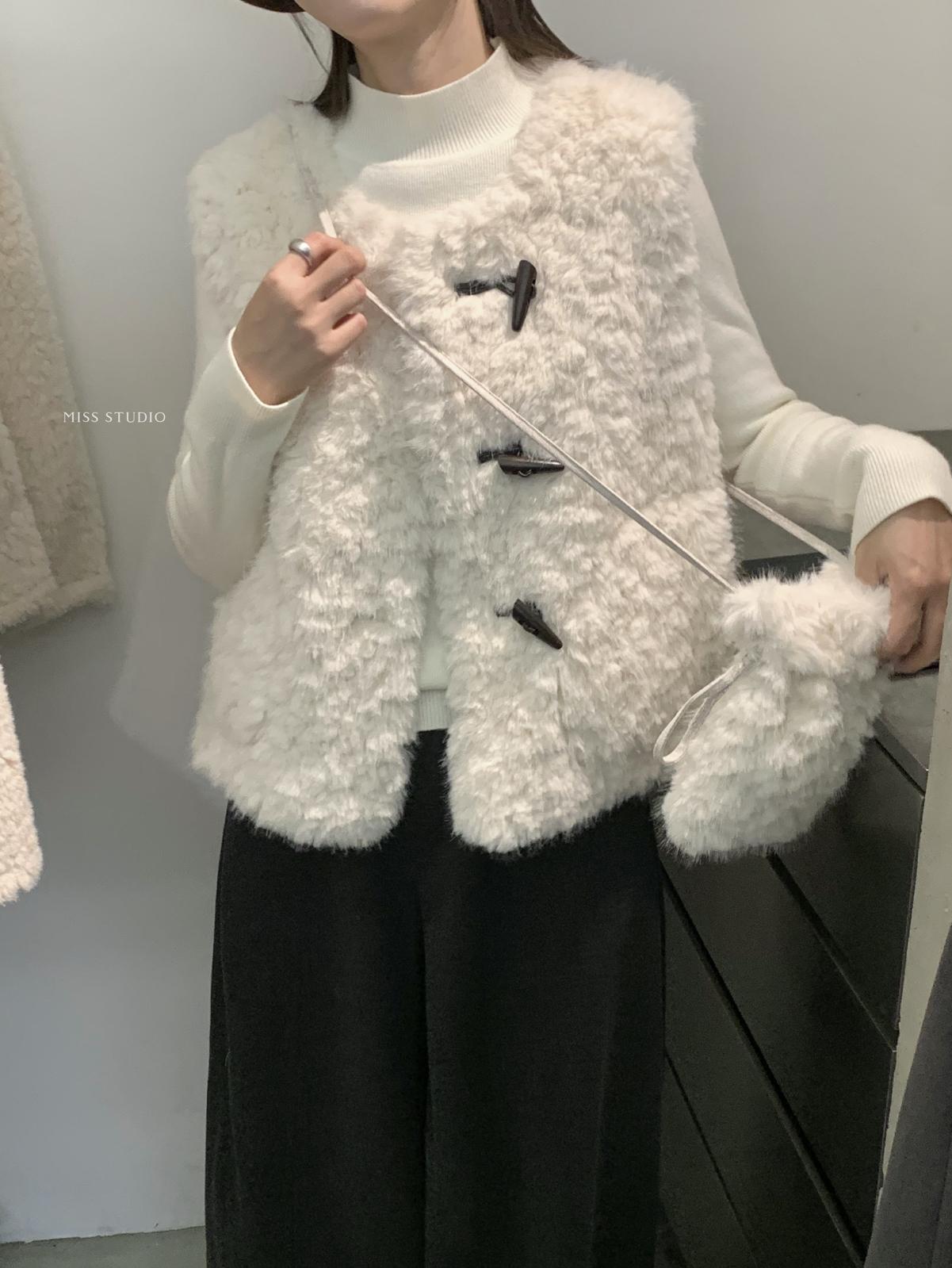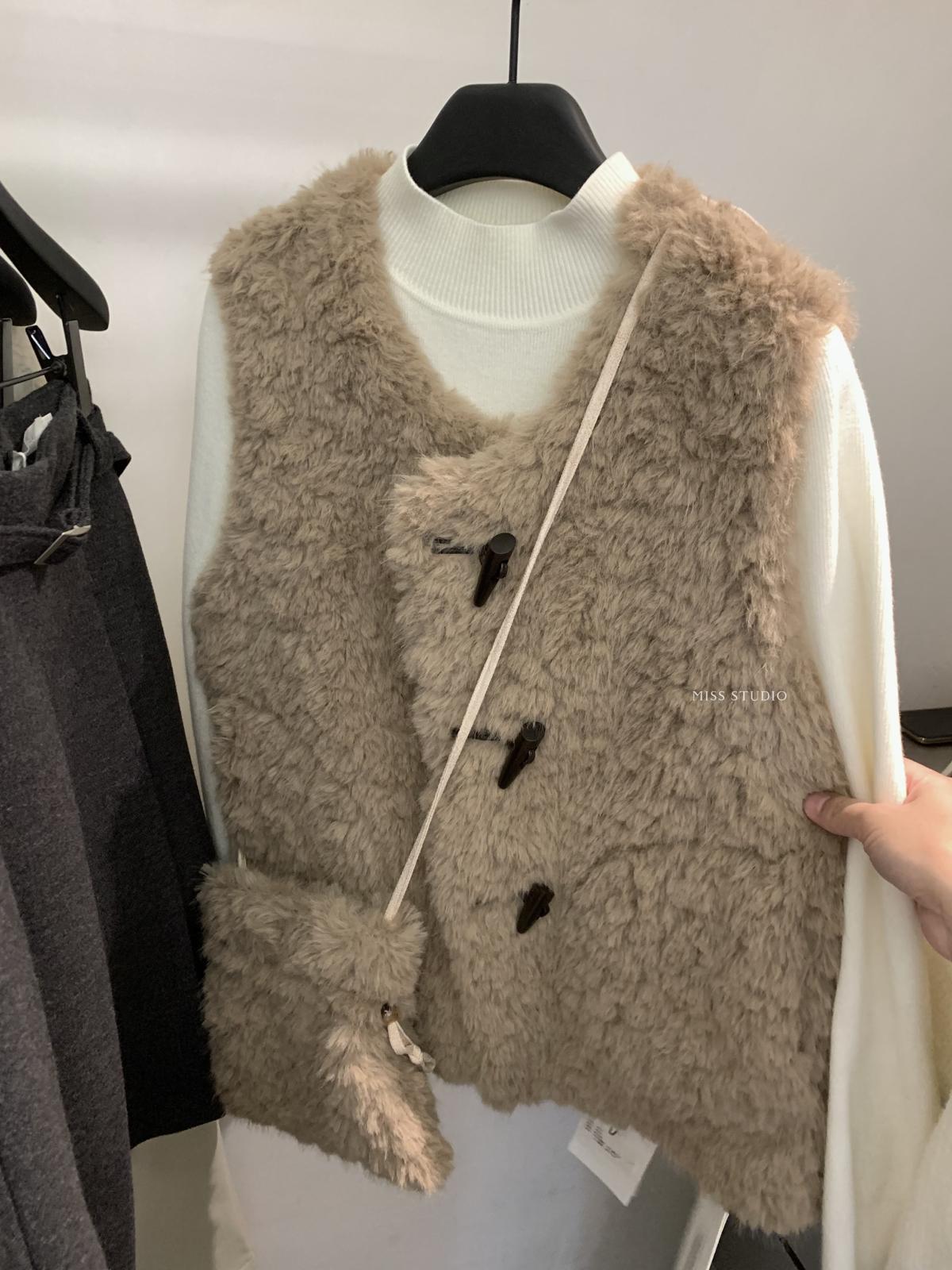 【C8113】百搭牛角扣毛絨絨保暖仿皮毛一體馬甲(配小包包)