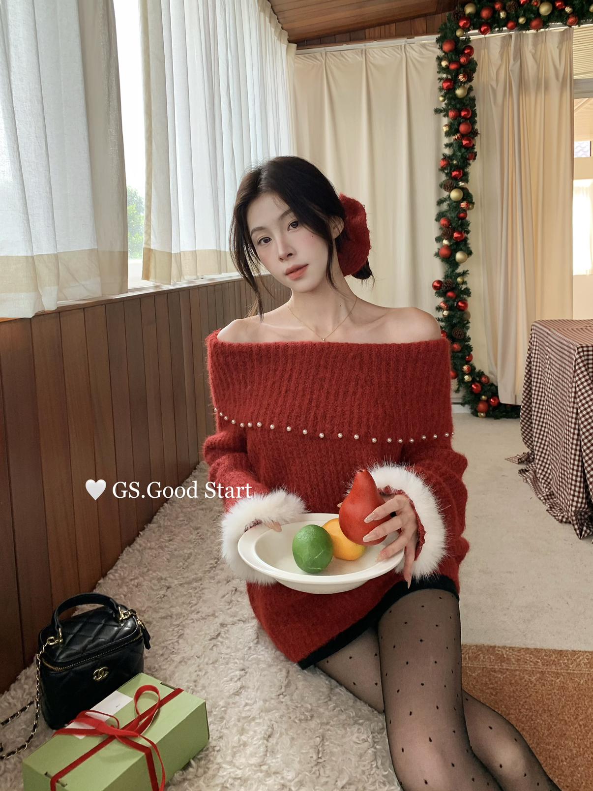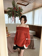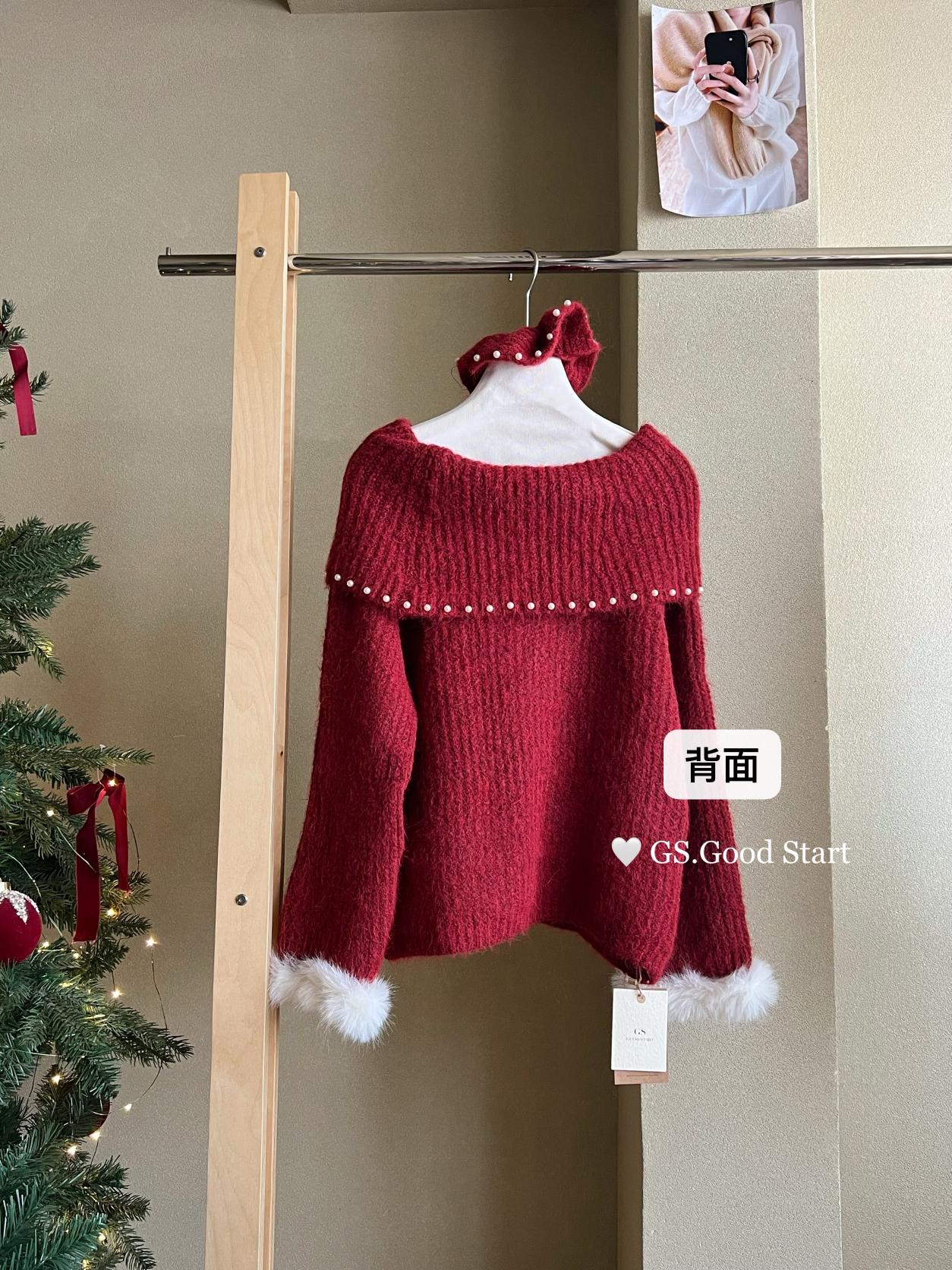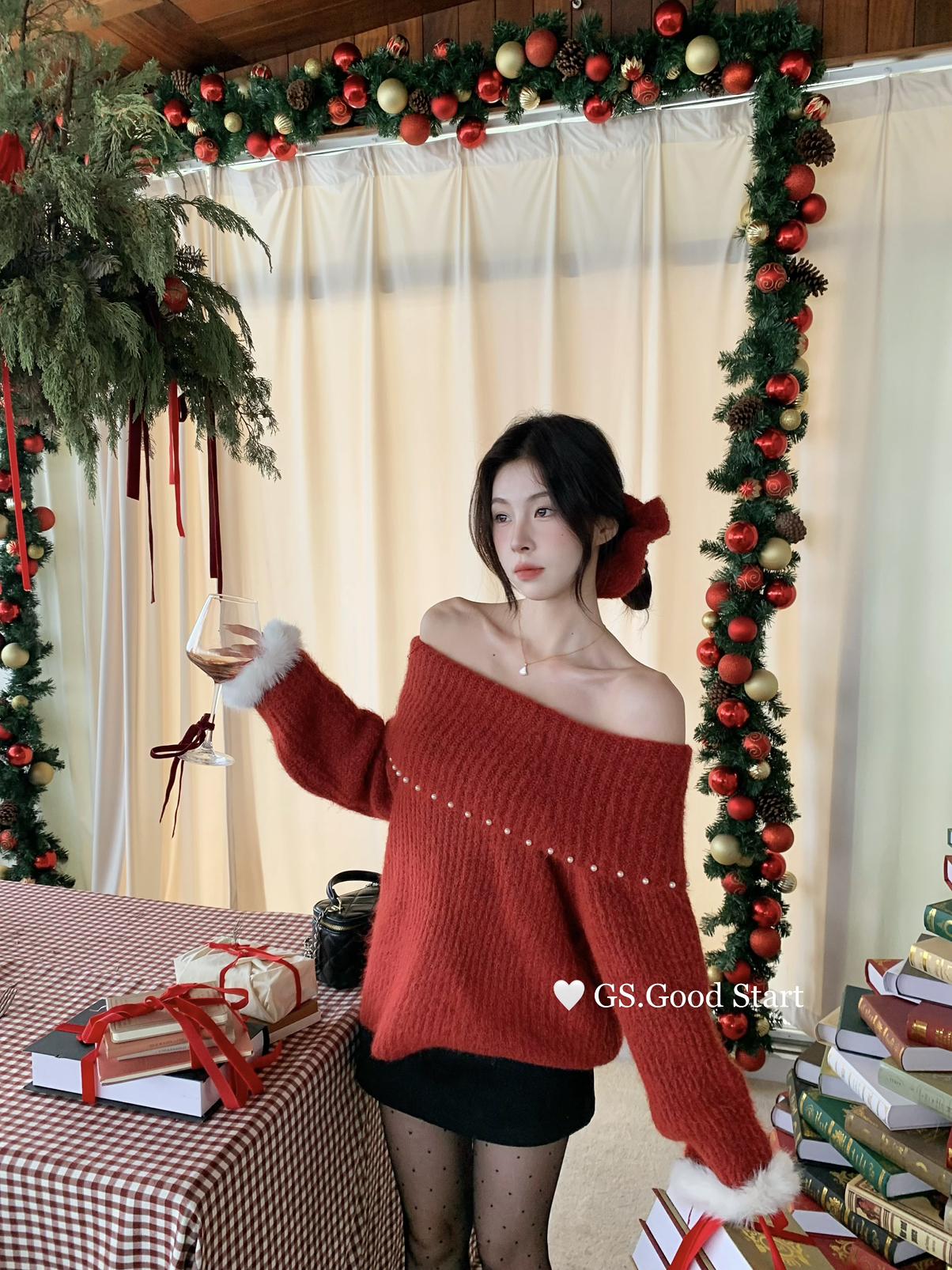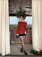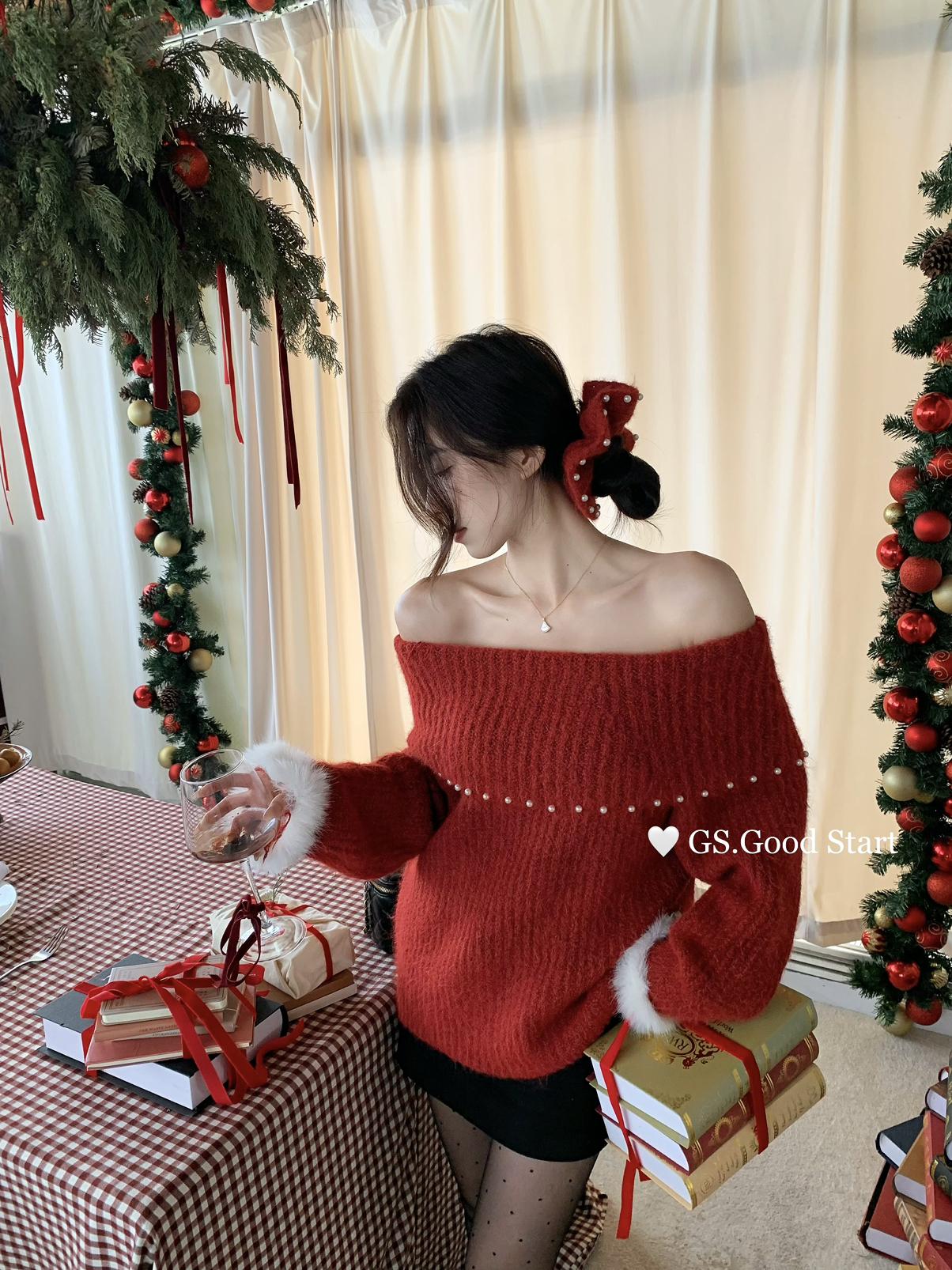 【C8167】紅色太顯白了!強推!心動一萬次~冬季浪漫氣質氛圍感一字肩寬鬆保暖毛衣(配可拆卸髮圈)