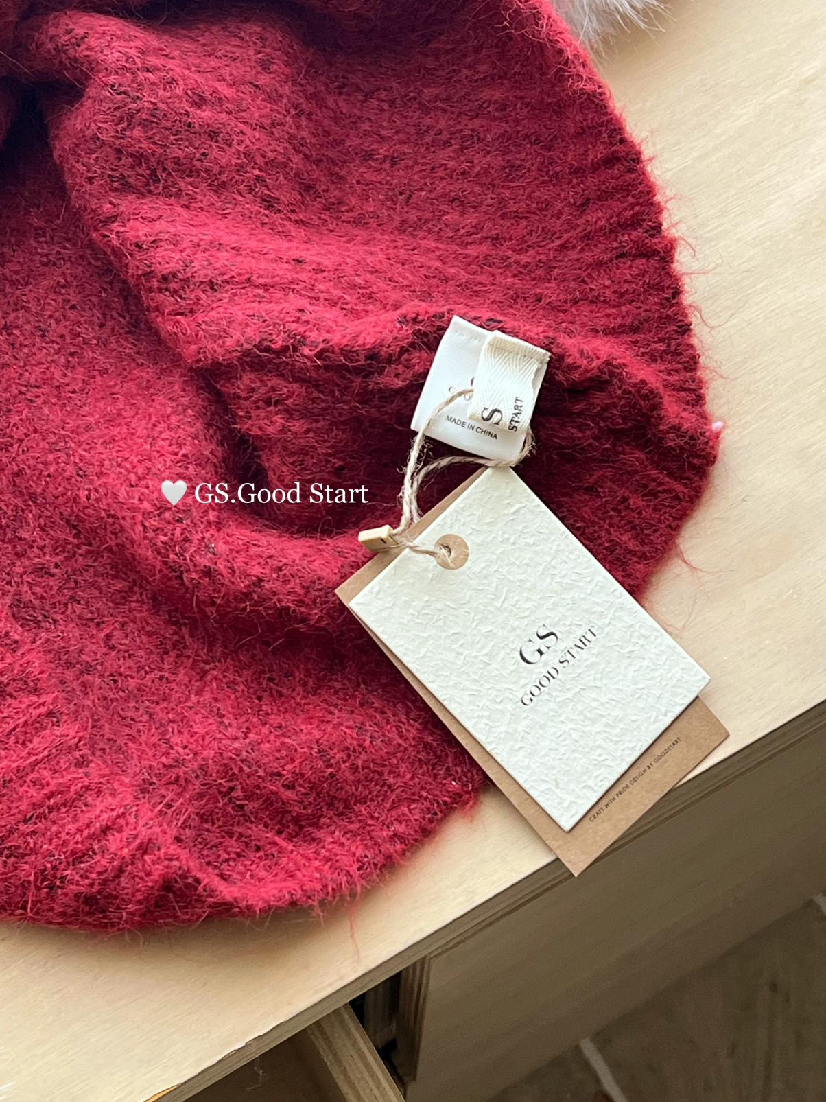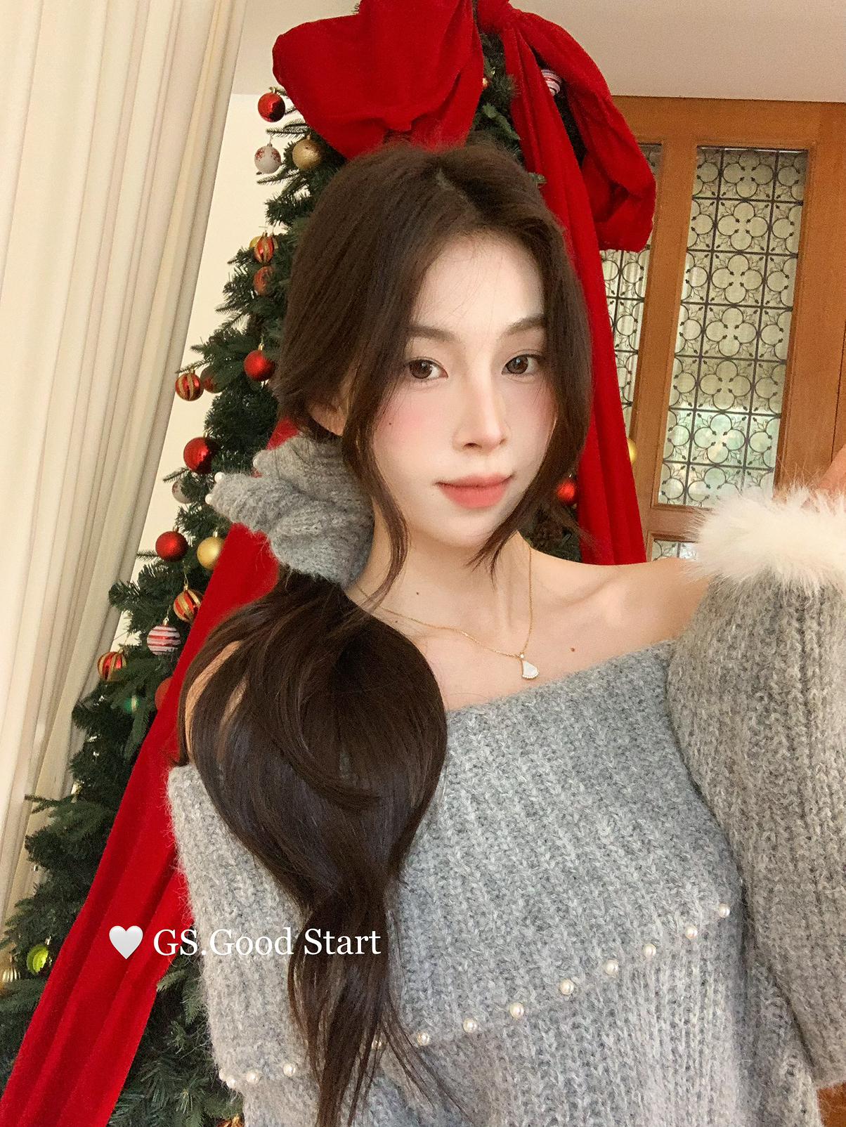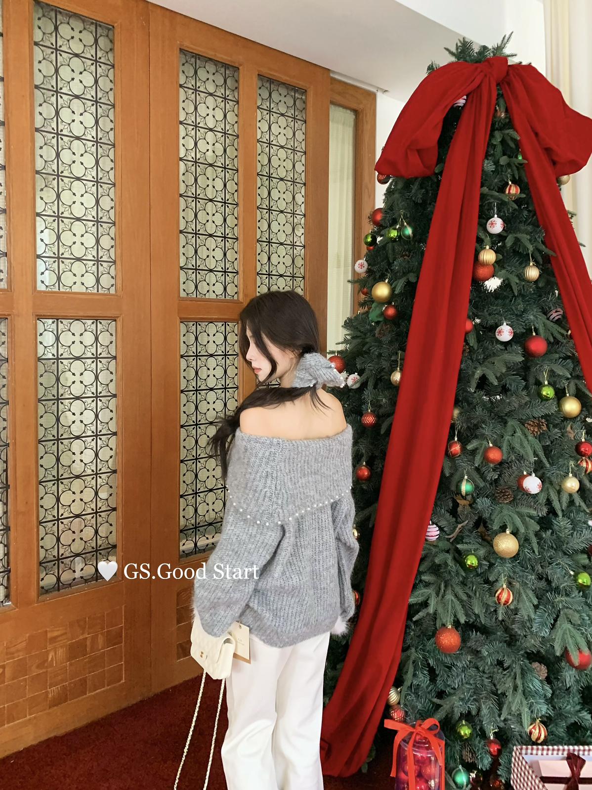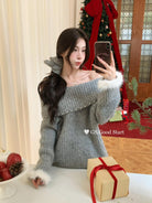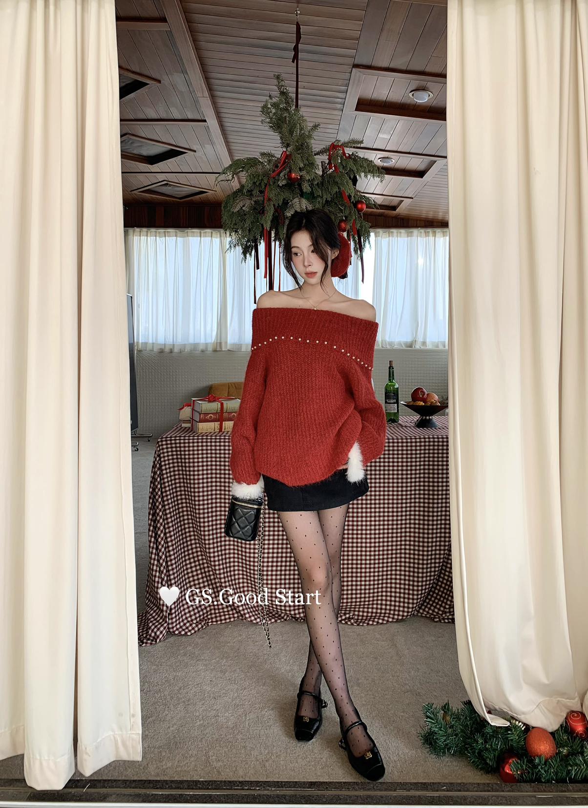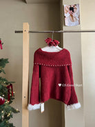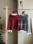 【C8167】紅色太顯白了!強推!心動一萬次~冬季浪漫氣質氛圍感一字肩寬鬆保暖毛衣(配可拆卸髮圈)