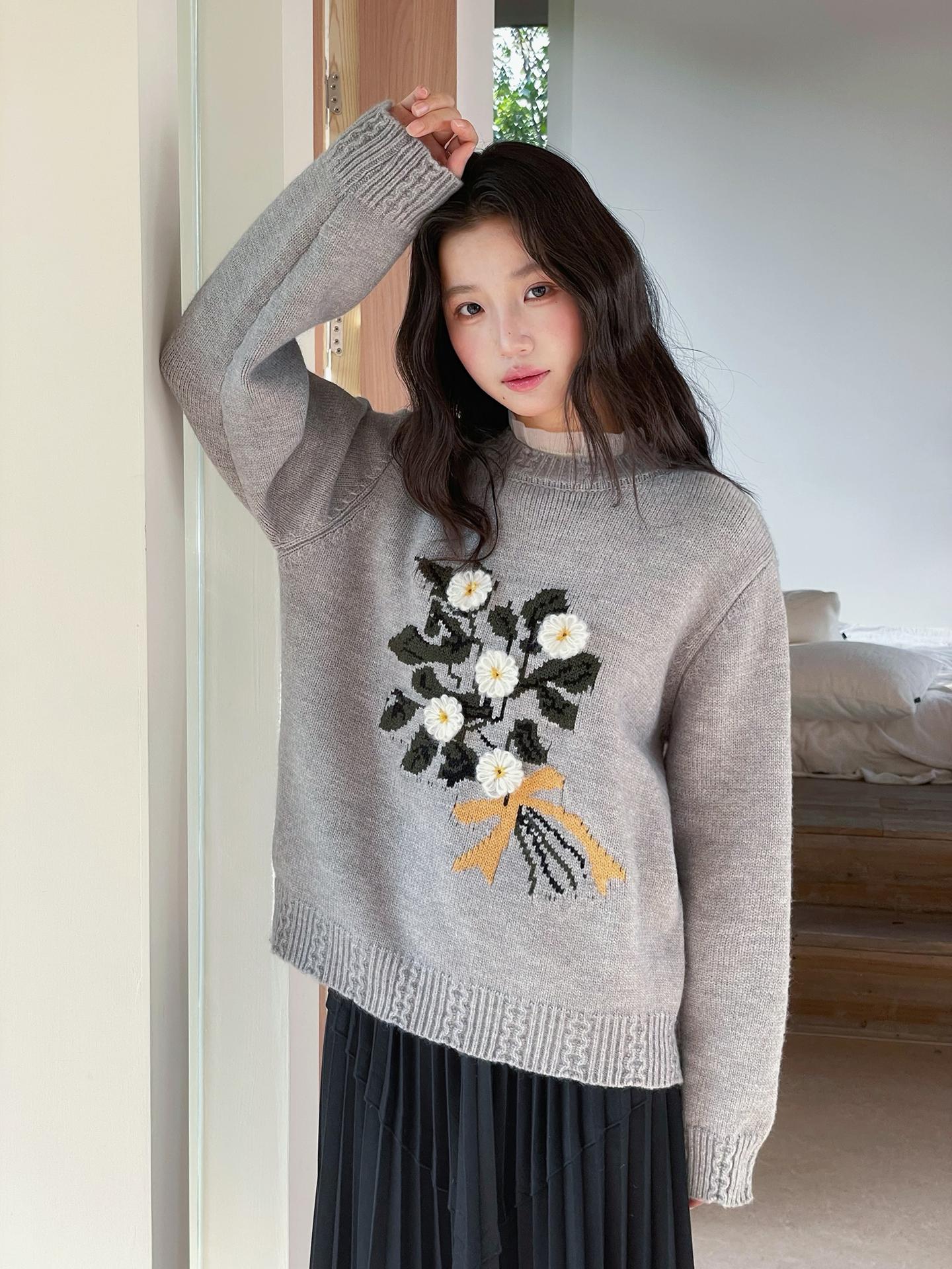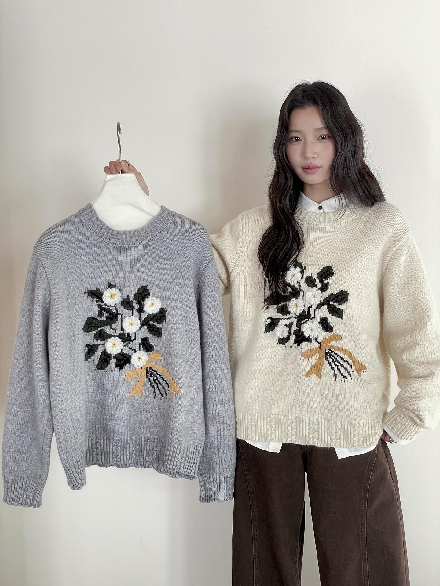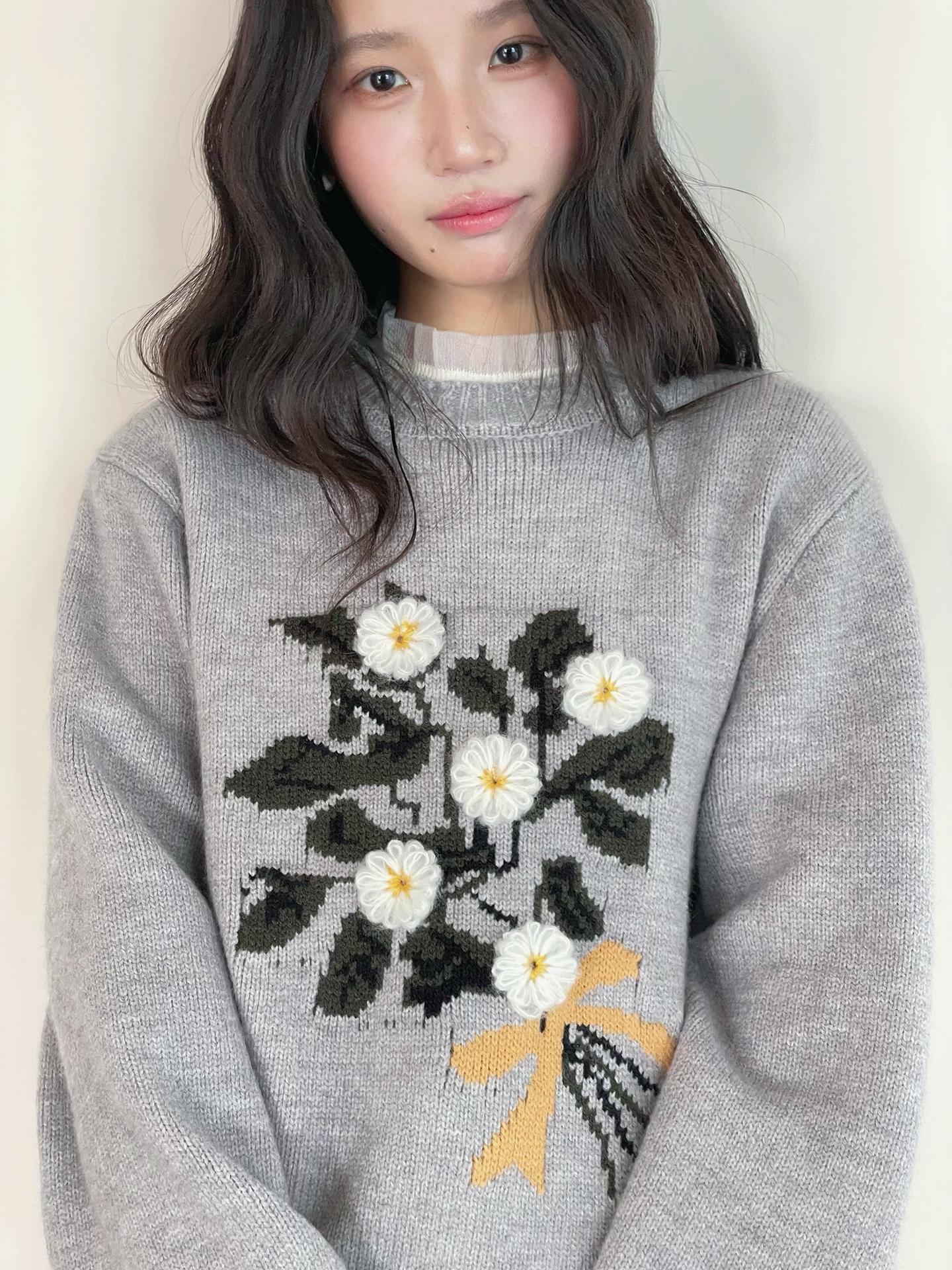 3. 【C8261】設計感立體花卉提花針織衫圓領套頭保暖毛衣