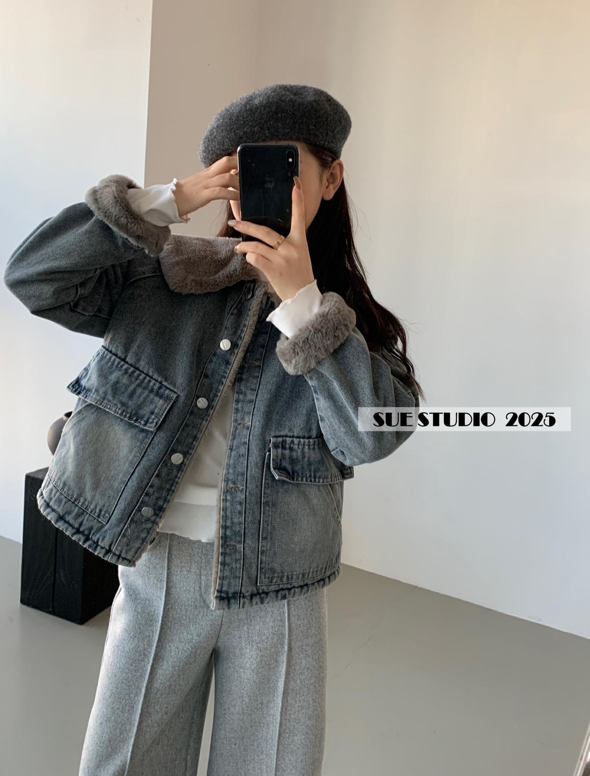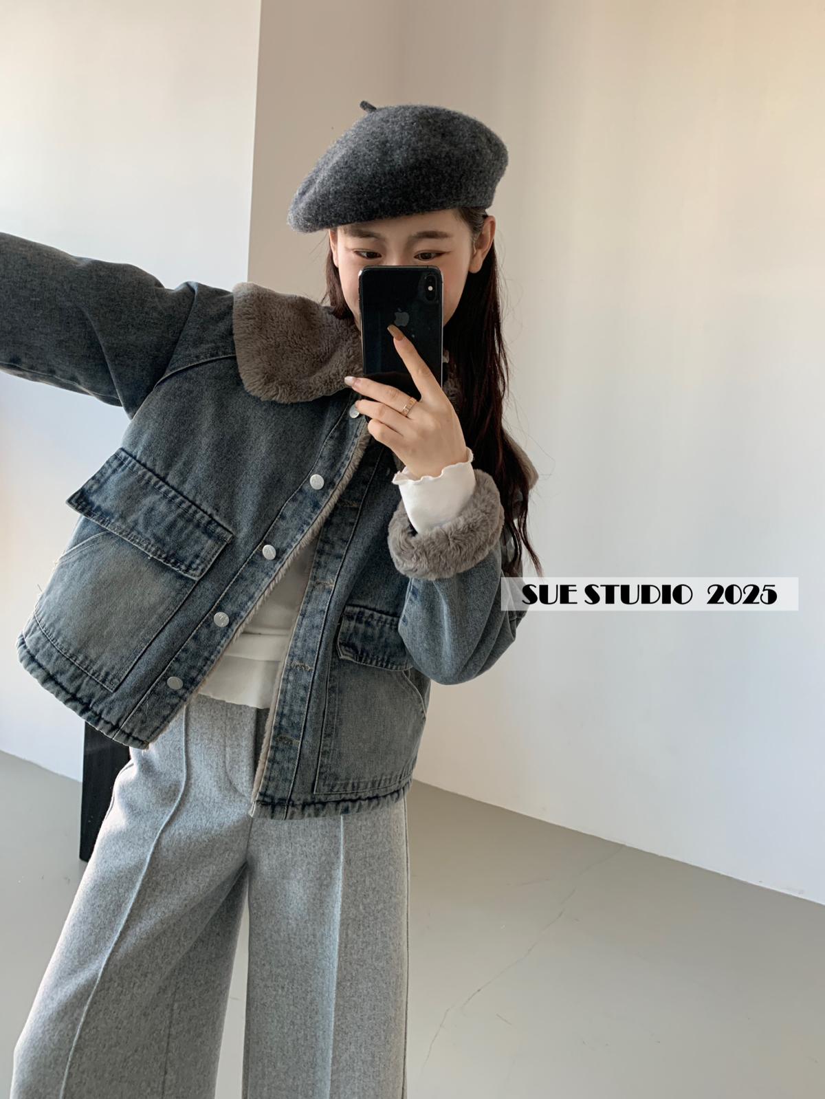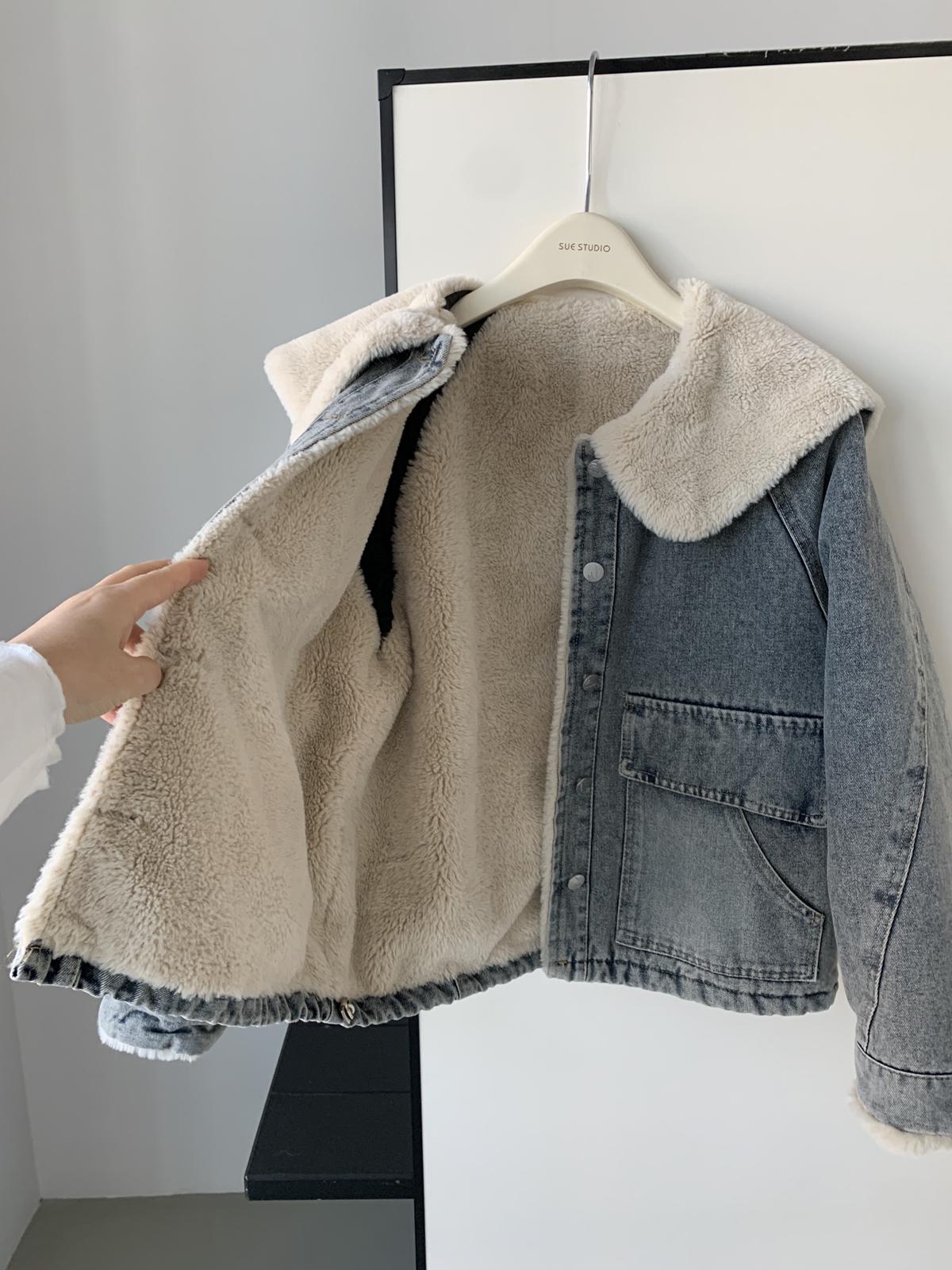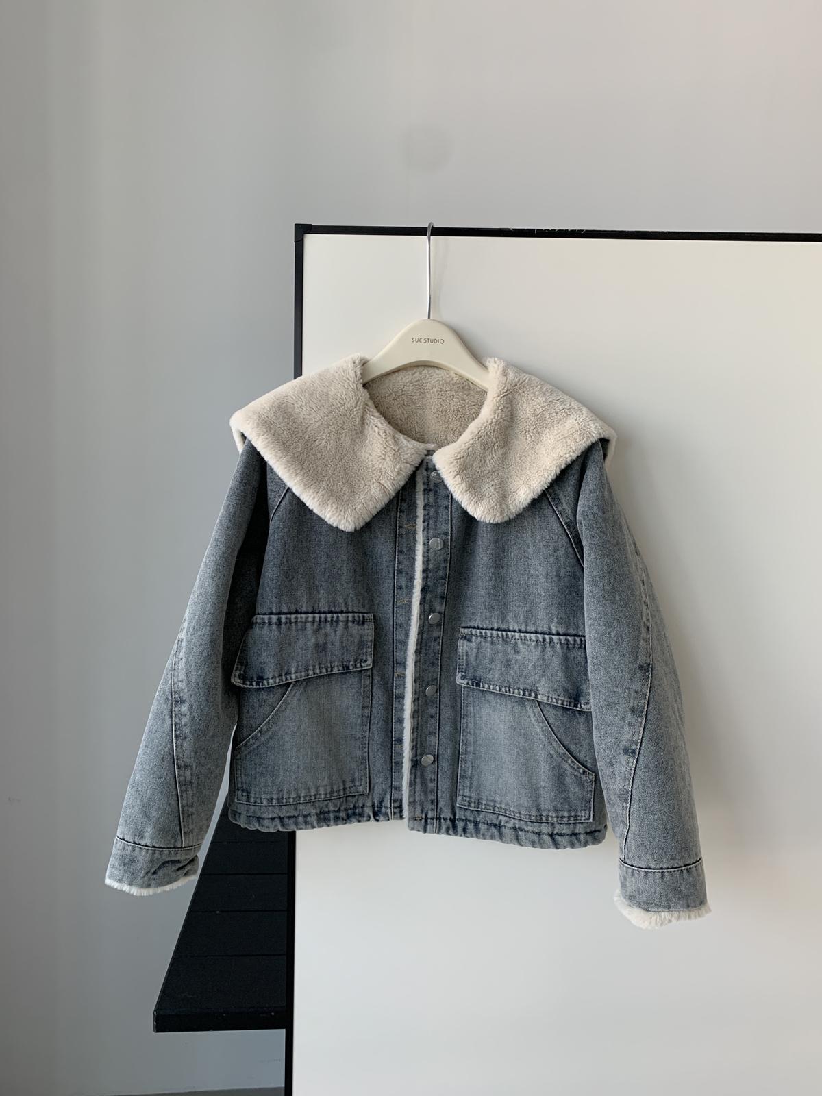 3. 【C8307】韓系翻領水洗做舊毛毛絨裏牛仔外套
