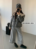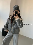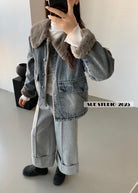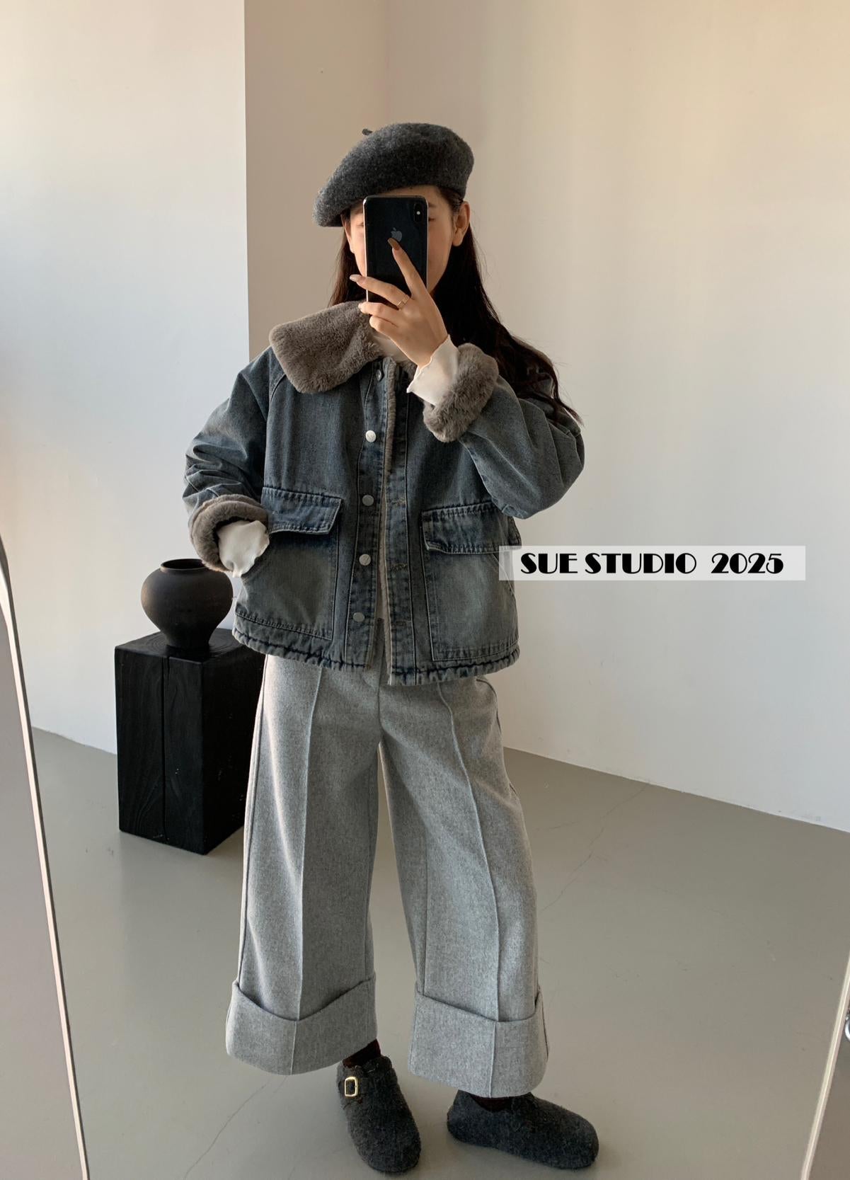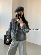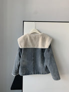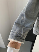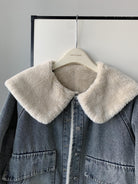 【C8307】韓系翻領水洗做舊毛毛絨裏牛仔外套