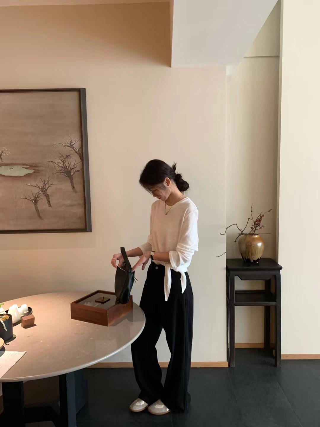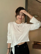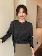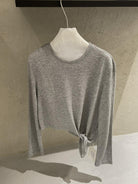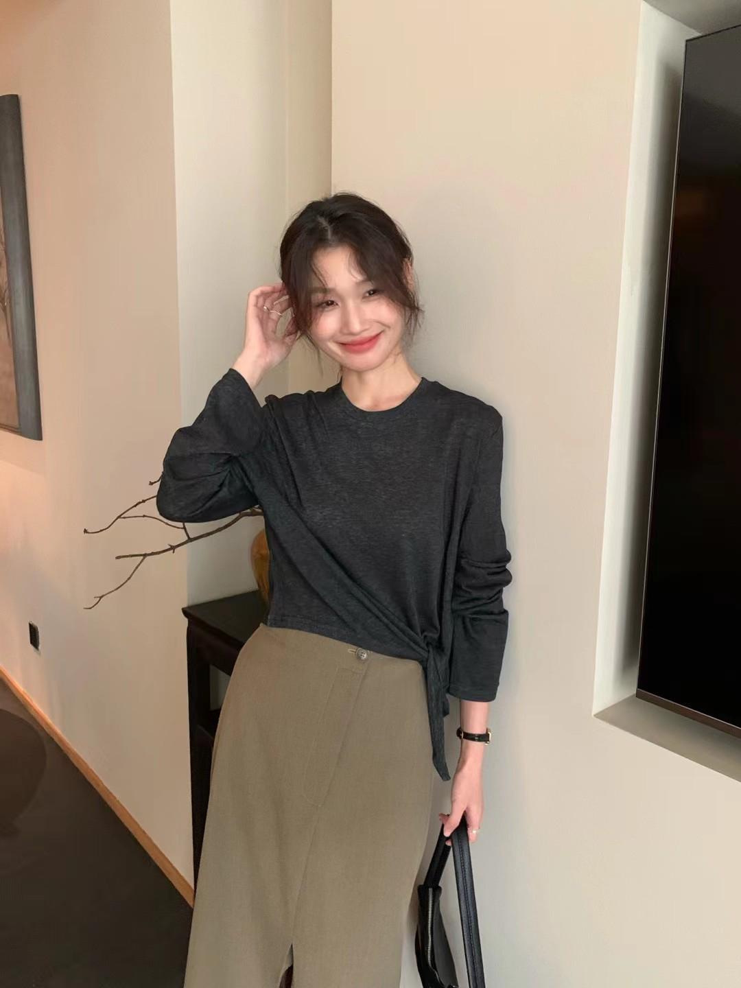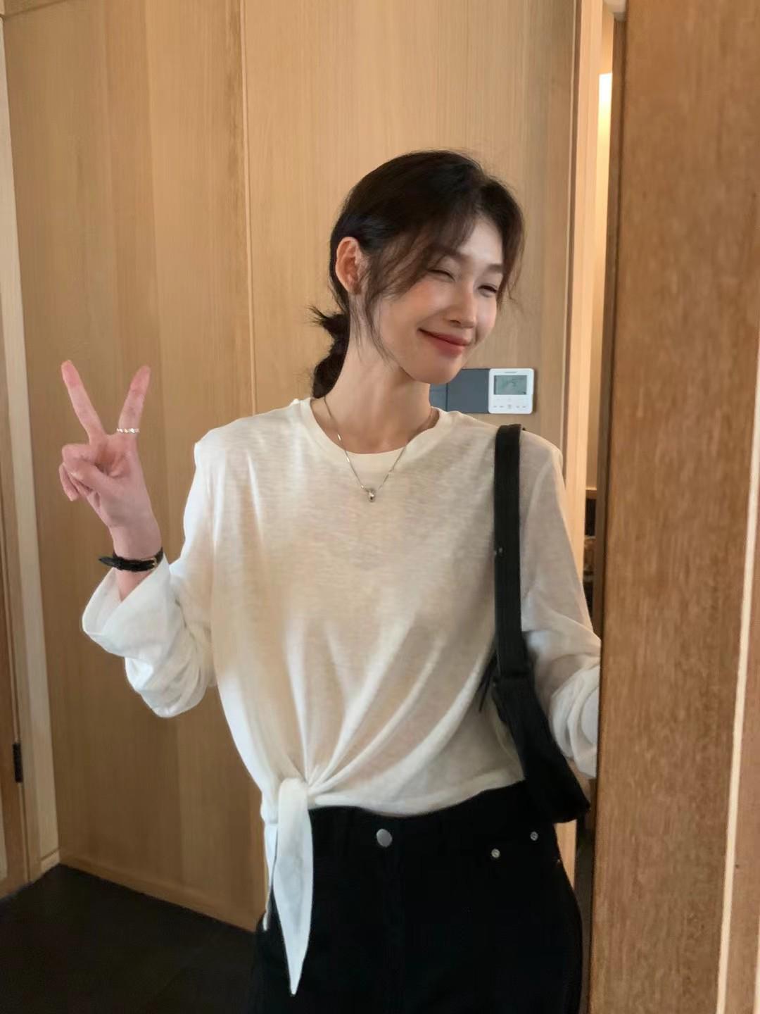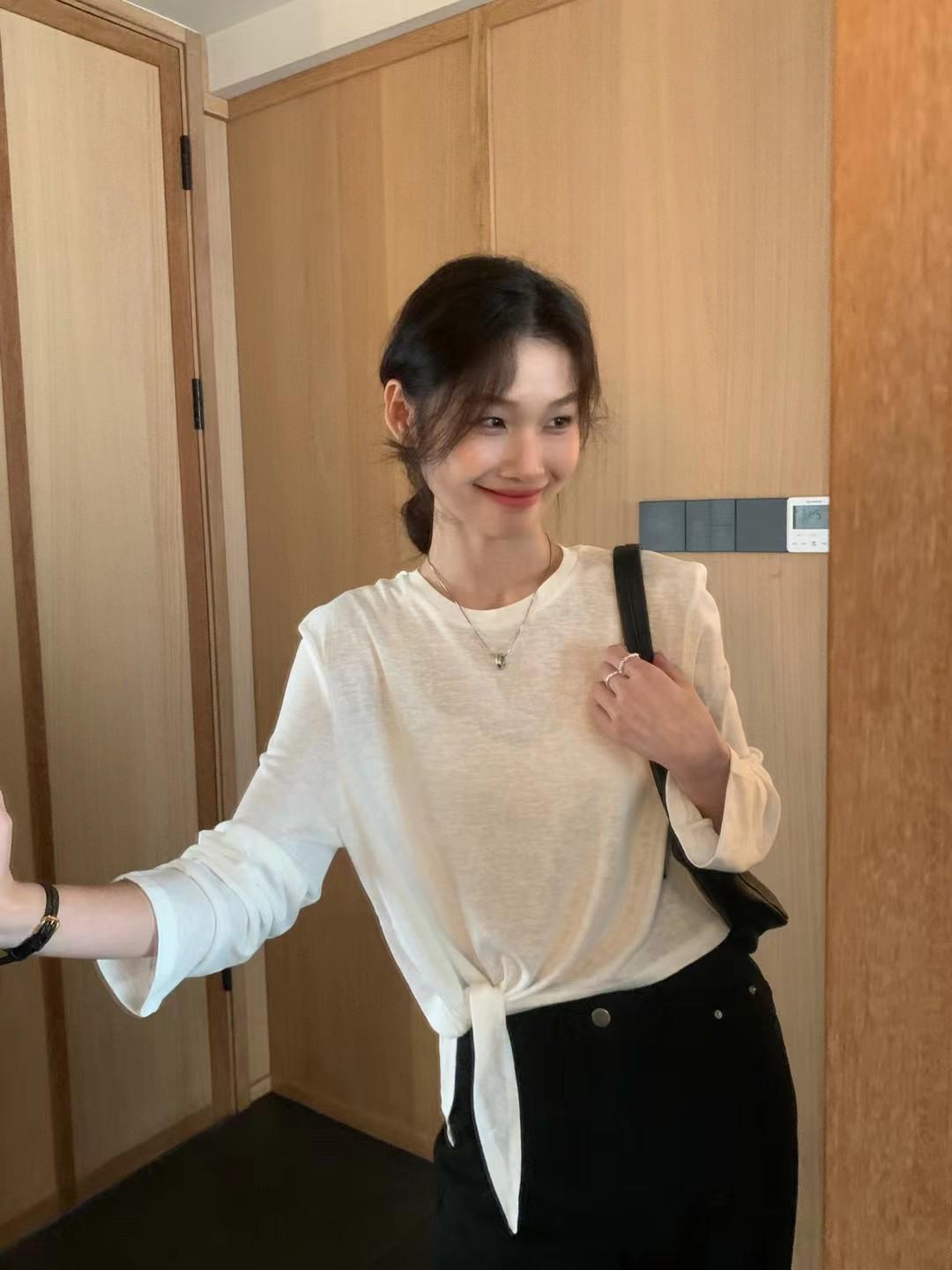 【C8326】設計感慵懶風桑蠶絲亞麻混紡綁帶長袖T恤